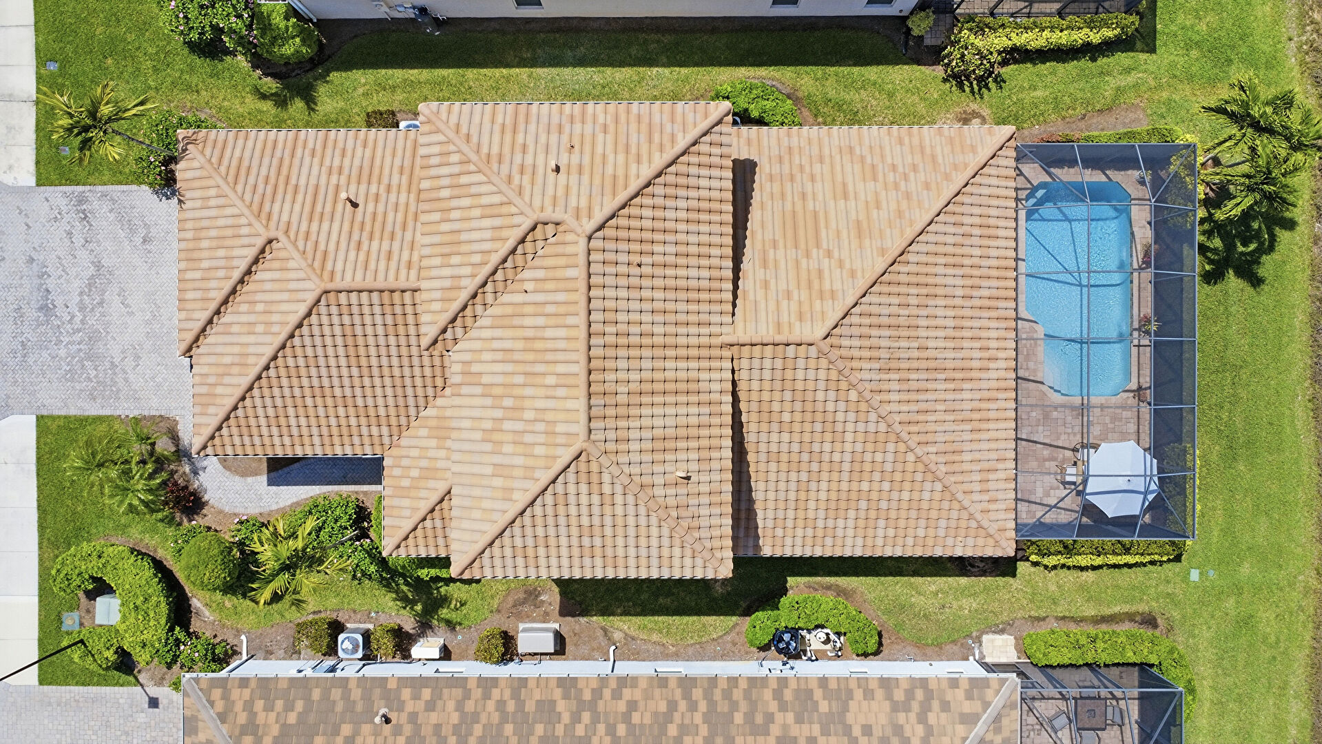 Downspout, Gutters, Lanai, Lawn, Outdoor Living Space, Patio, Pool, Stucco Siding, Sunroom, Tile Roof, Lanai, Tile Roof