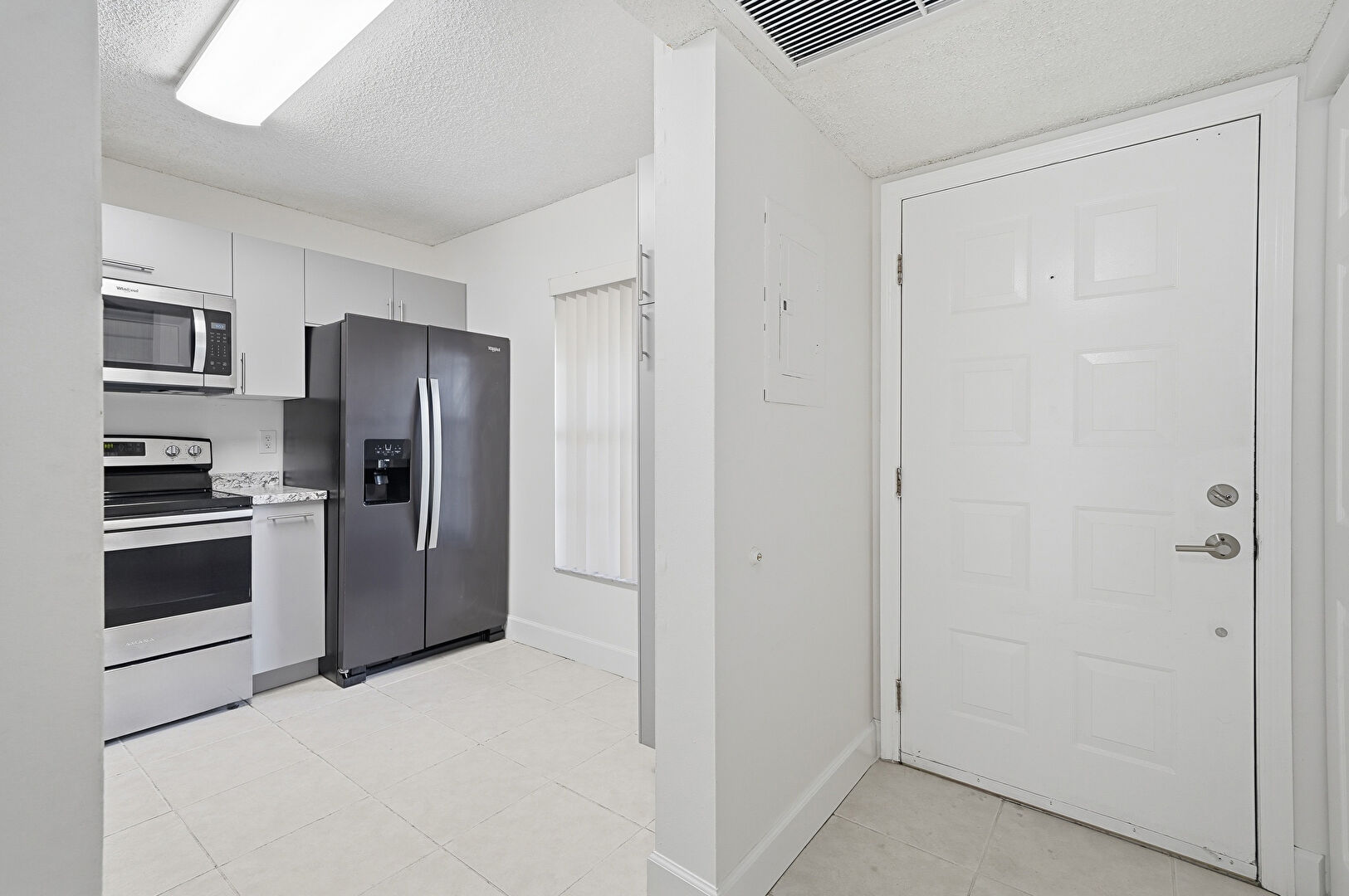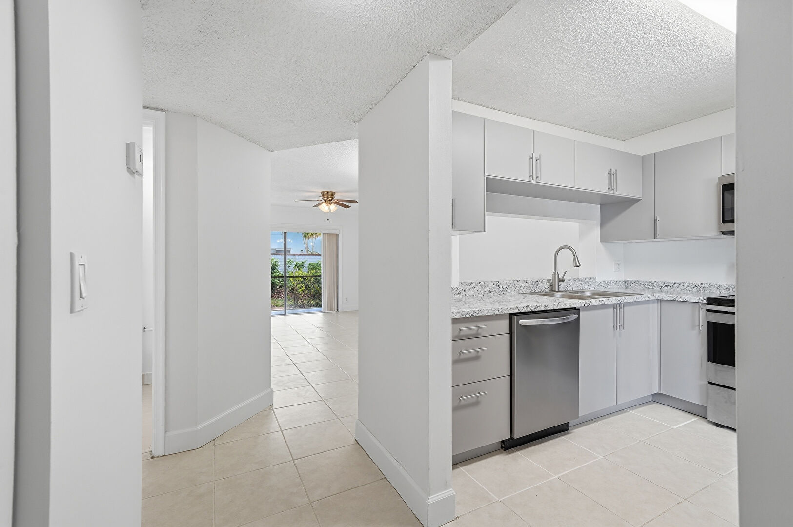 Baseboards Wall, Ceiling Fan, Drywall, Electric Panel, Gray Cabinets, Natural Light, Stone Countertops, Textured Ceiling, Tile Floor, Vent, Pass Through Window, Tile Floor