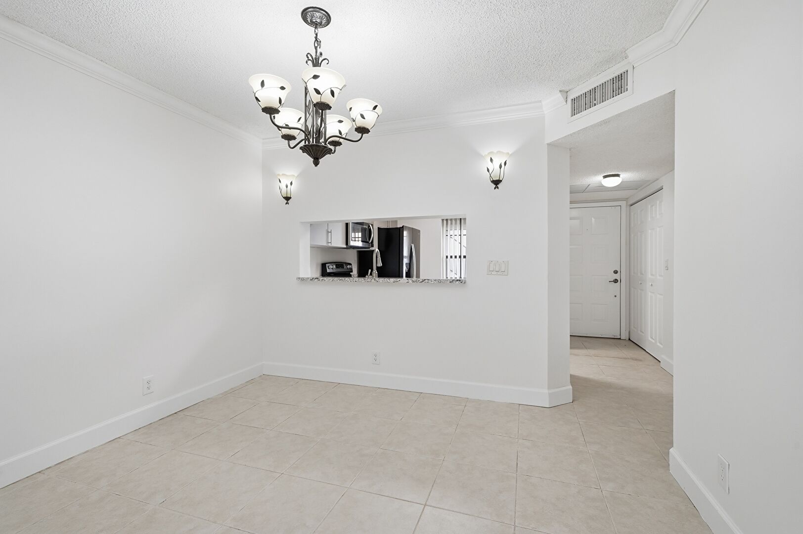 Baseboards Wall, Ceiling Fan, Crown Molding, Drywall, Notable Chandelier, Textured Ceiling, Tile Floor, Vent, Natural Light, Notable Chandelier