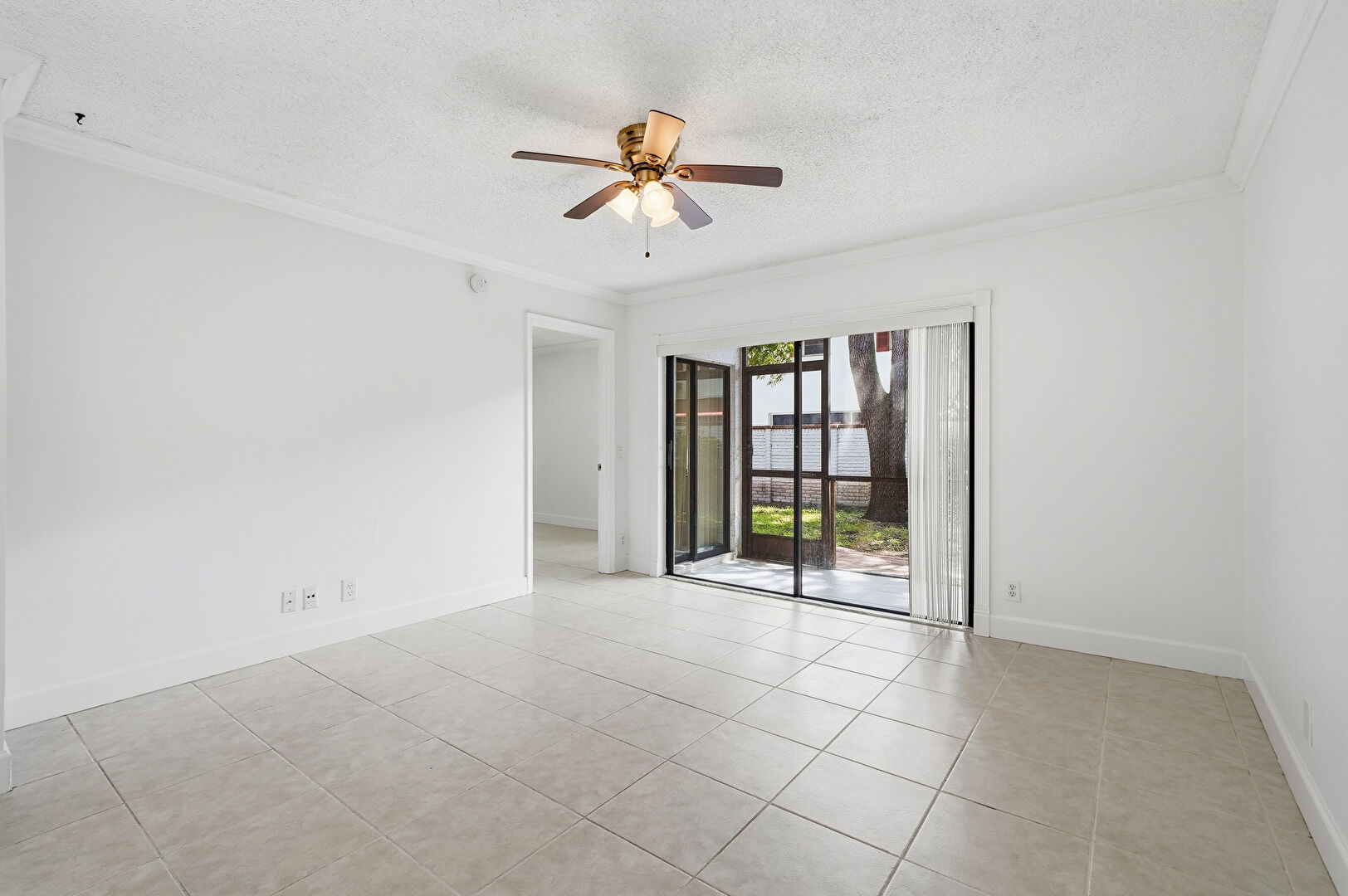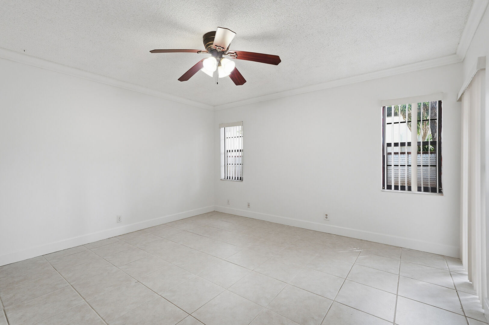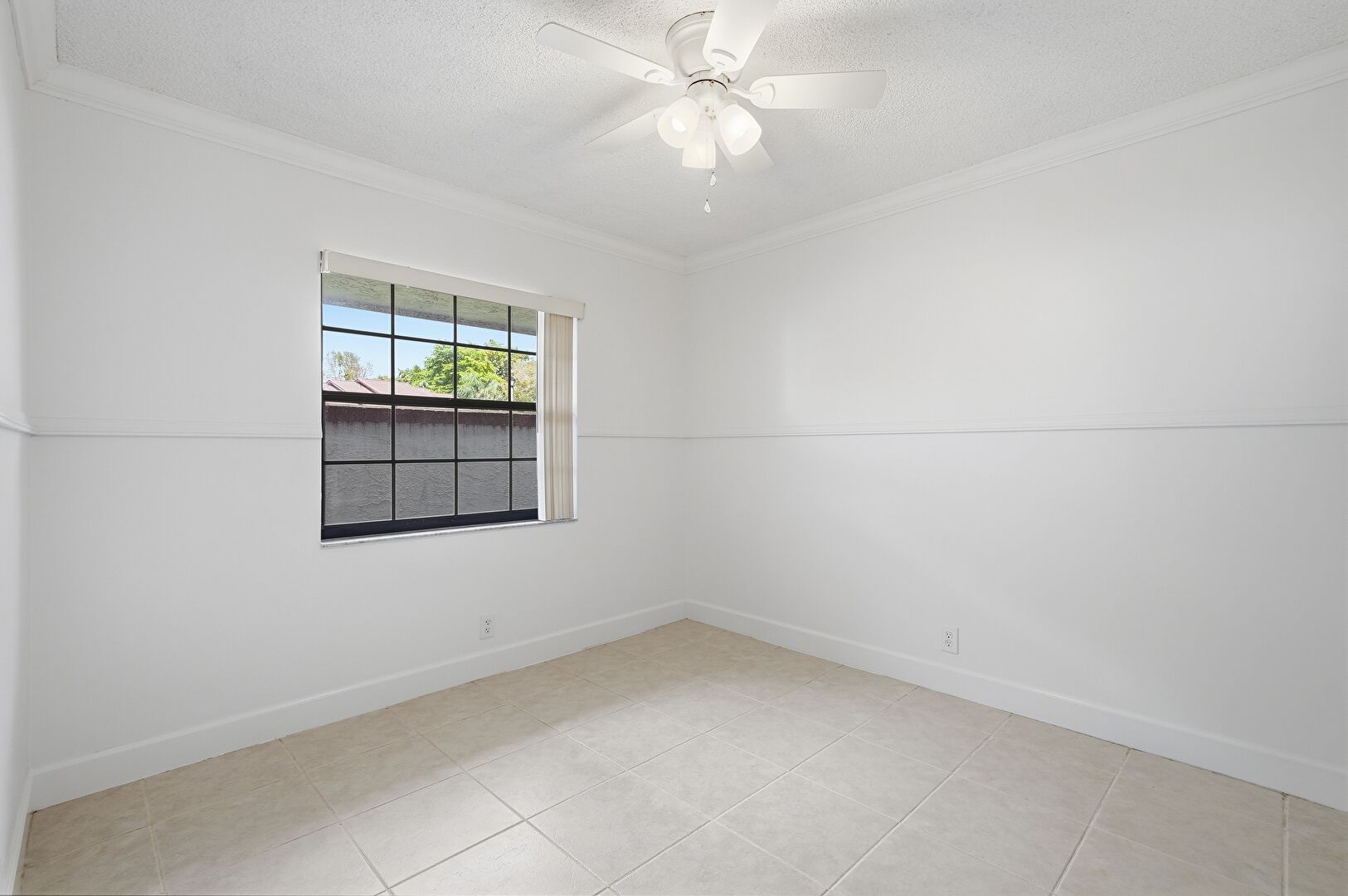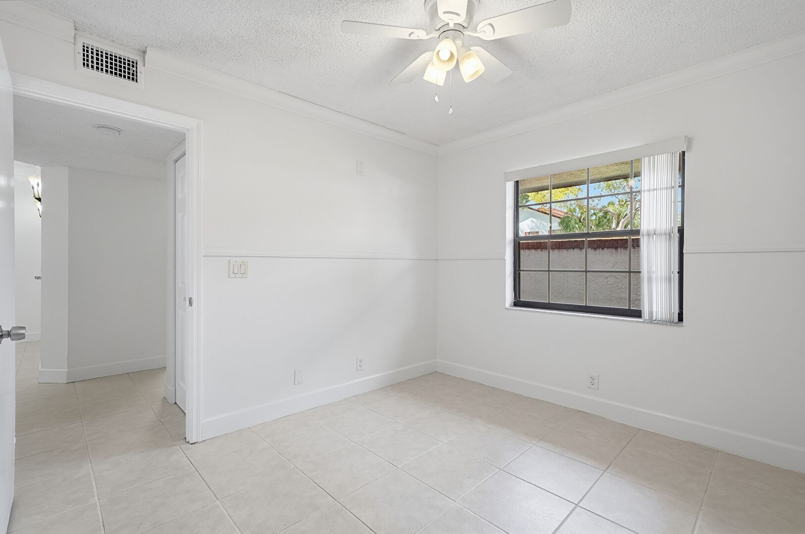 Baseboards Wall, Ceiling Fan, Crown Molding, Drywall, Natural Light, Textured Ceiling, Tile Floor, Vent, Baseboards Wall, Drywall, Textured Ceiling