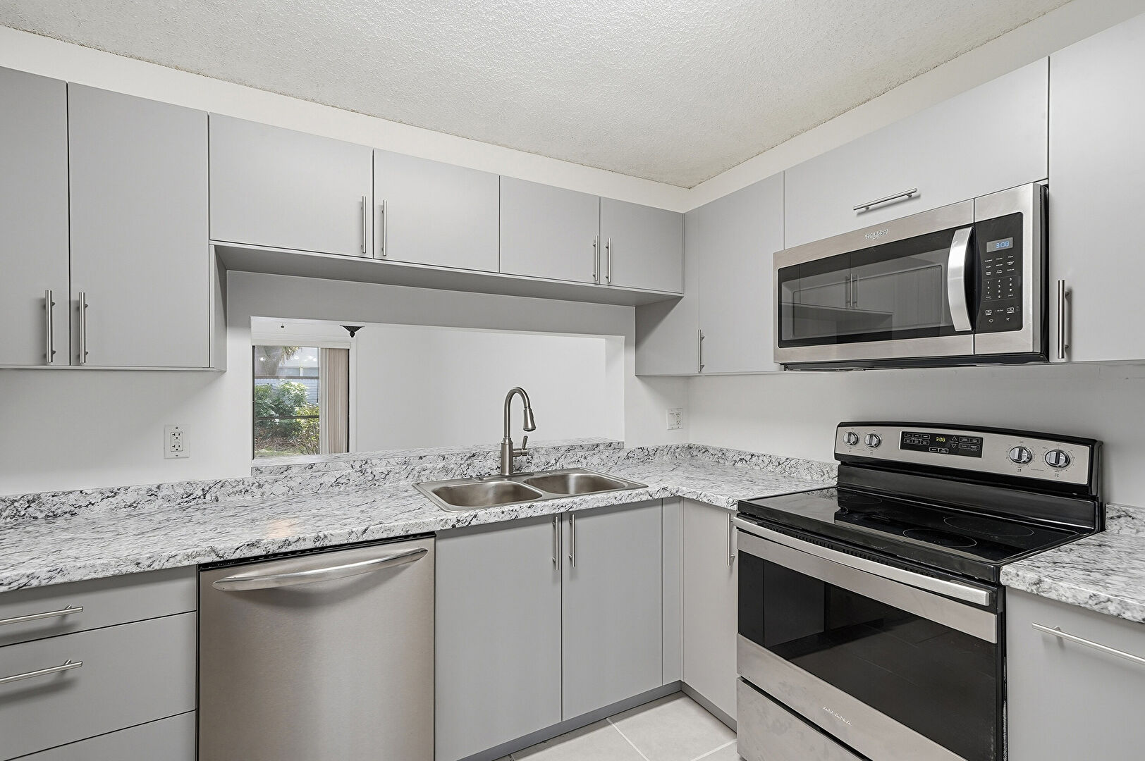 Baseboards Wall, Drywall, Gray Cabinets, Natural Light, Stone Countertops, Textured Ceiling, Tile Floor, Vent, Baseboards Wall, Pass Through Window, Tile Floor