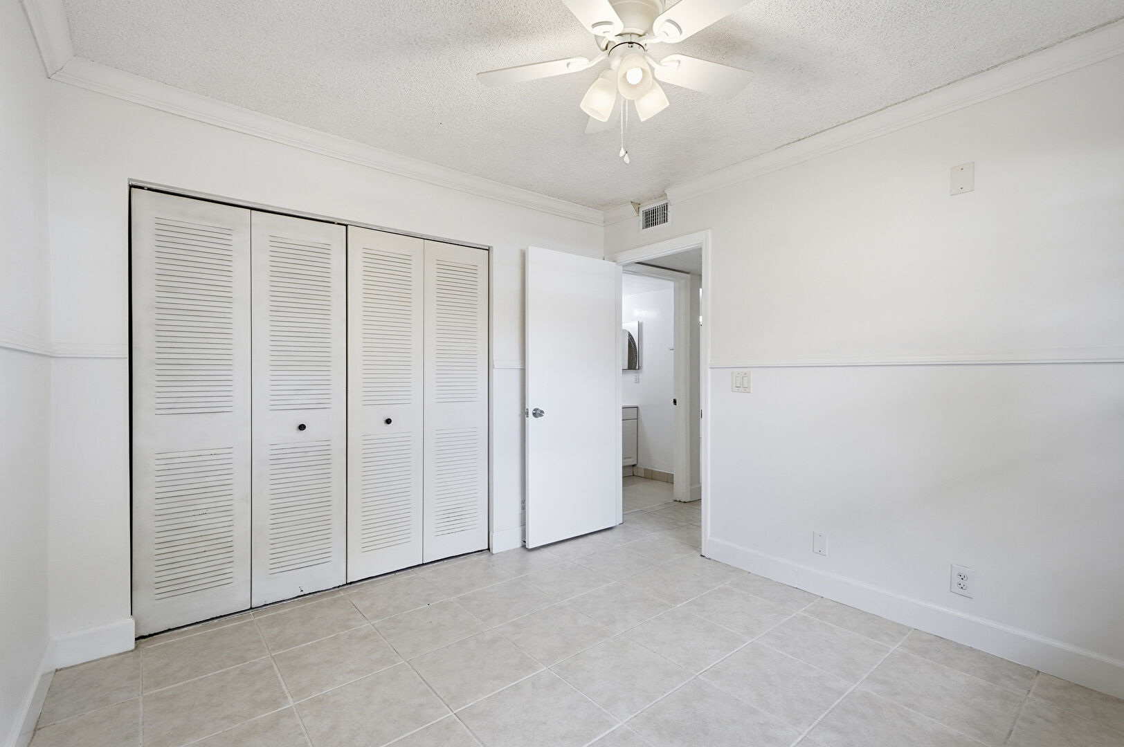 Baseboards Wall, Ceiling Fan, Crown Molding, Drywall, Natural Light, Textured Ceiling, Tile Floor, Vent, Baseboards Wall, Closet