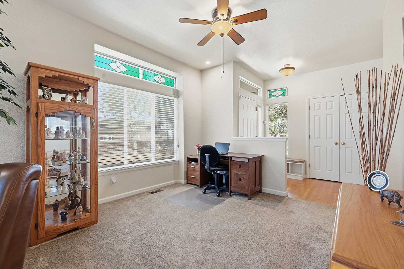 Baseboards Wall, Carpet, Ceiling Fan, Drywall, Natural Light, Office Area, Recessed Lighting, Vent, Baseboards Wall, Drywall