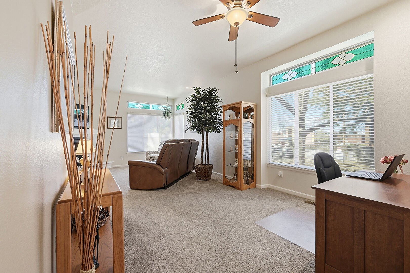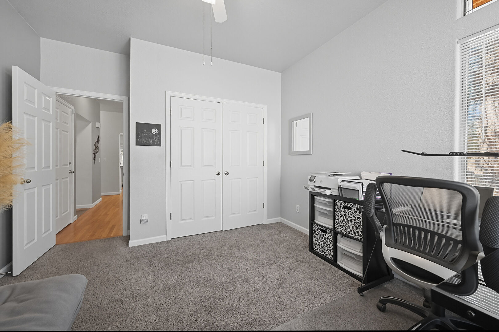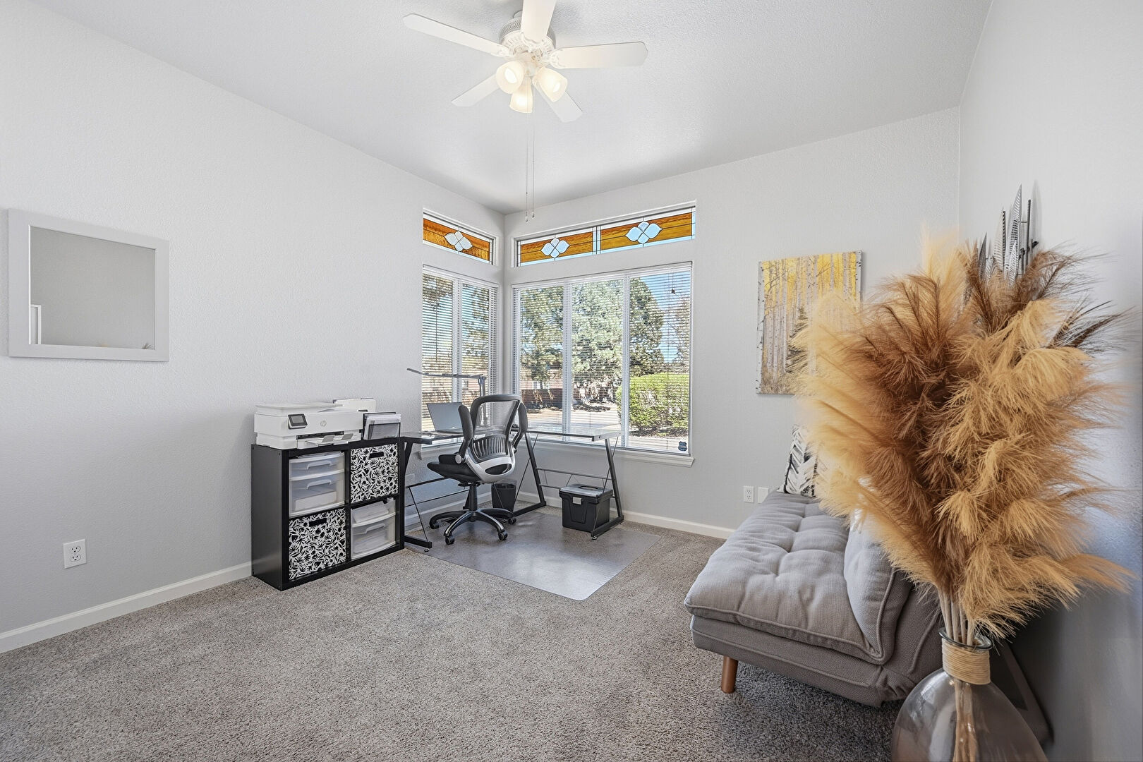 Baseboards Wall, Carpet, Ceiling Fan, Drywall, Natural Light, Office Area, Baseboards Wall, Drywall