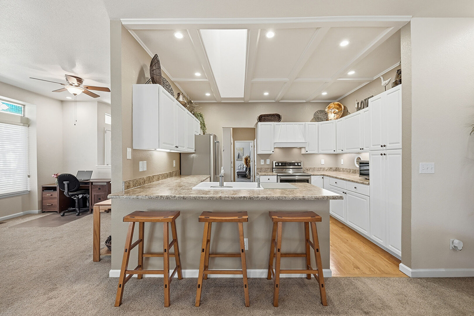 Baseboards Wall, Beamed Ceiling, Carpet, Ceiling Fan, Coffered Ceiling, Crown Molding, Drywall, G Shaped Kitchen, Kitchen Bar, Kitchen Peninsula, Natural Light, Notable Chandelier, Office Area, Pendant Lighting, Raised Cabinets, Recessed Lighting, Skylight, Stone Countertops, Wood Finish Floor, Beamed Ceiling, Coffered Ceiling, Recessed Lighting