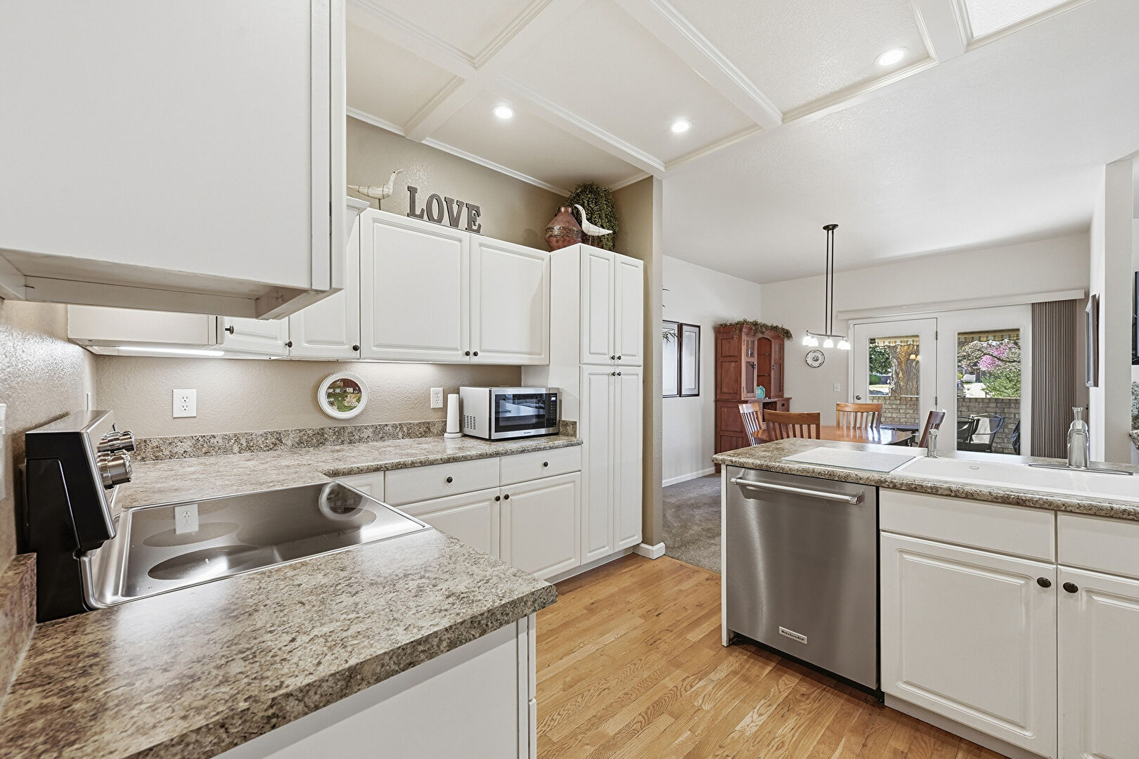 Baseboards Wall, Drywall, L Shaped Kitchen, Natural Light, Recessed Lighting, Shaker Cabinets, Stone Countertops, Textured Ceiling, Wood Finish Floor, Shaker Cabinets, Vent