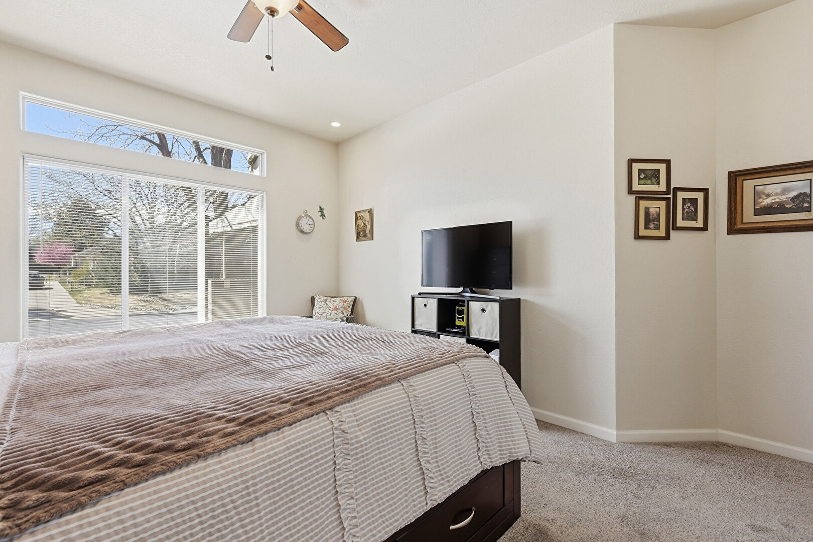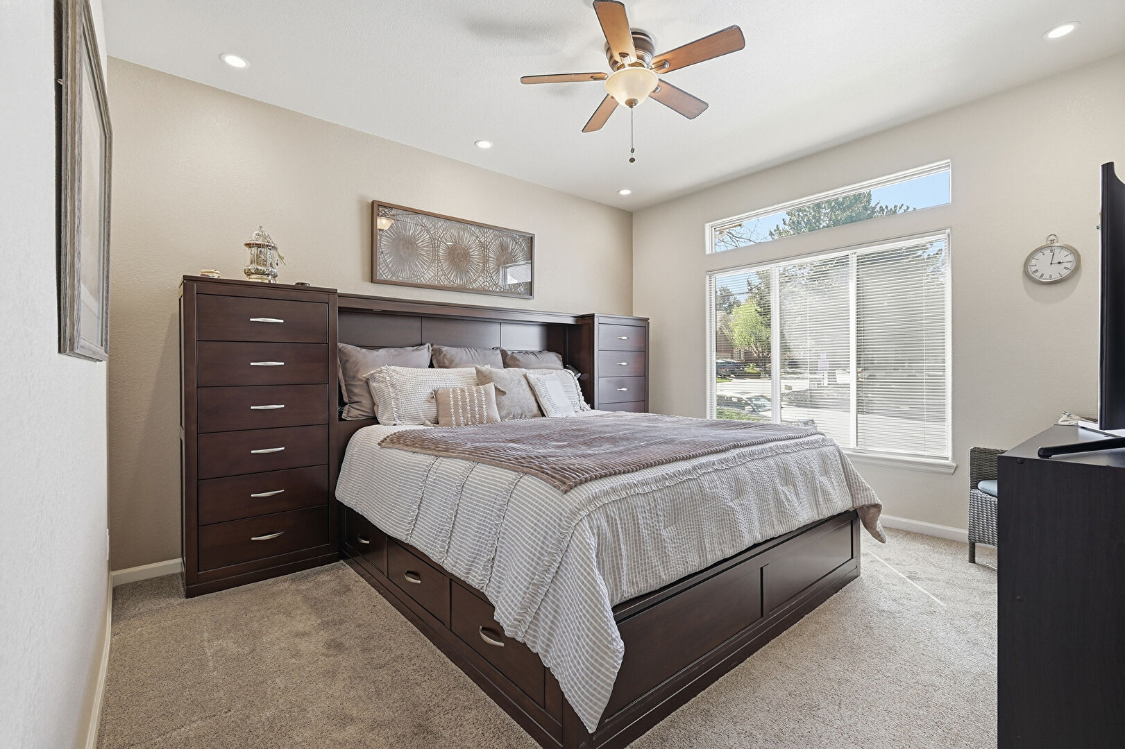 Baseboards Wall, Ceiling Fan, Drywall, Natural Light, Recessed Lighting, Wood Finish Floor, Carpet