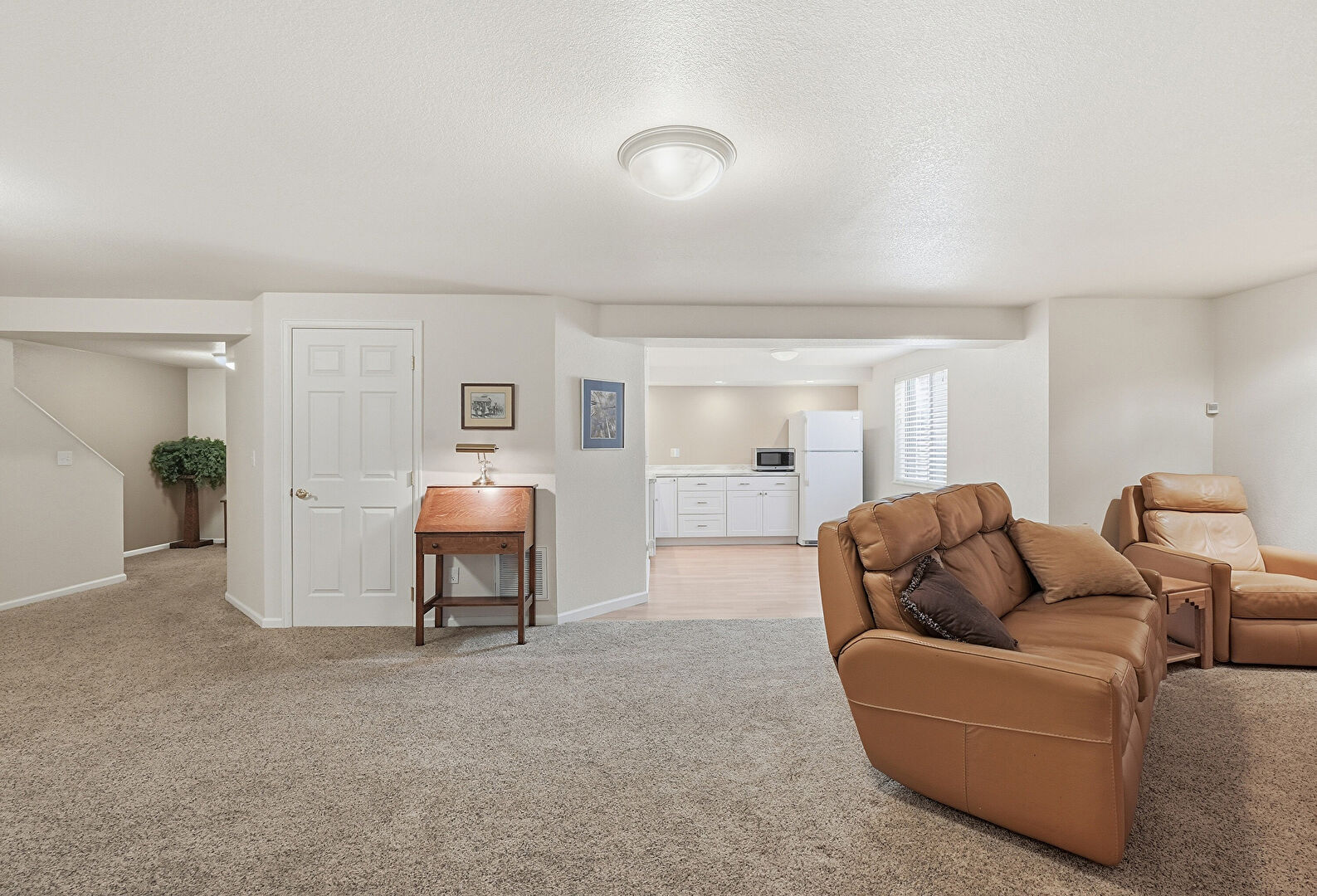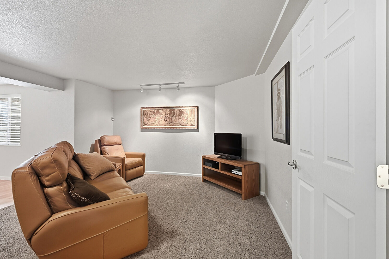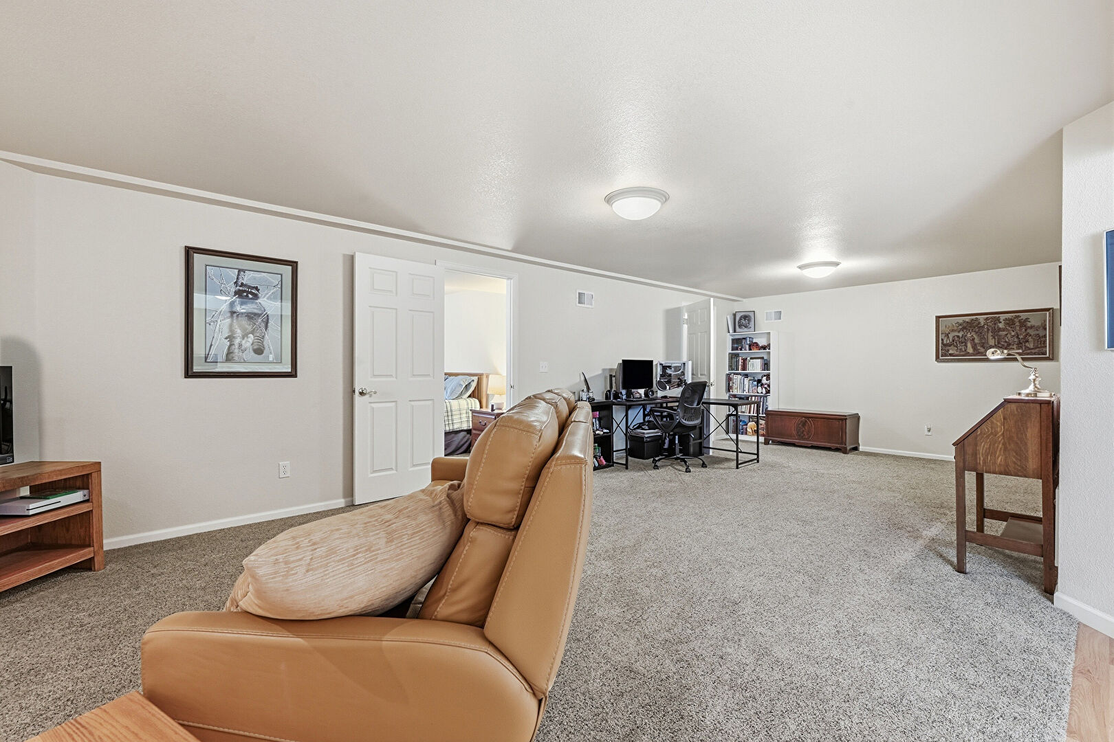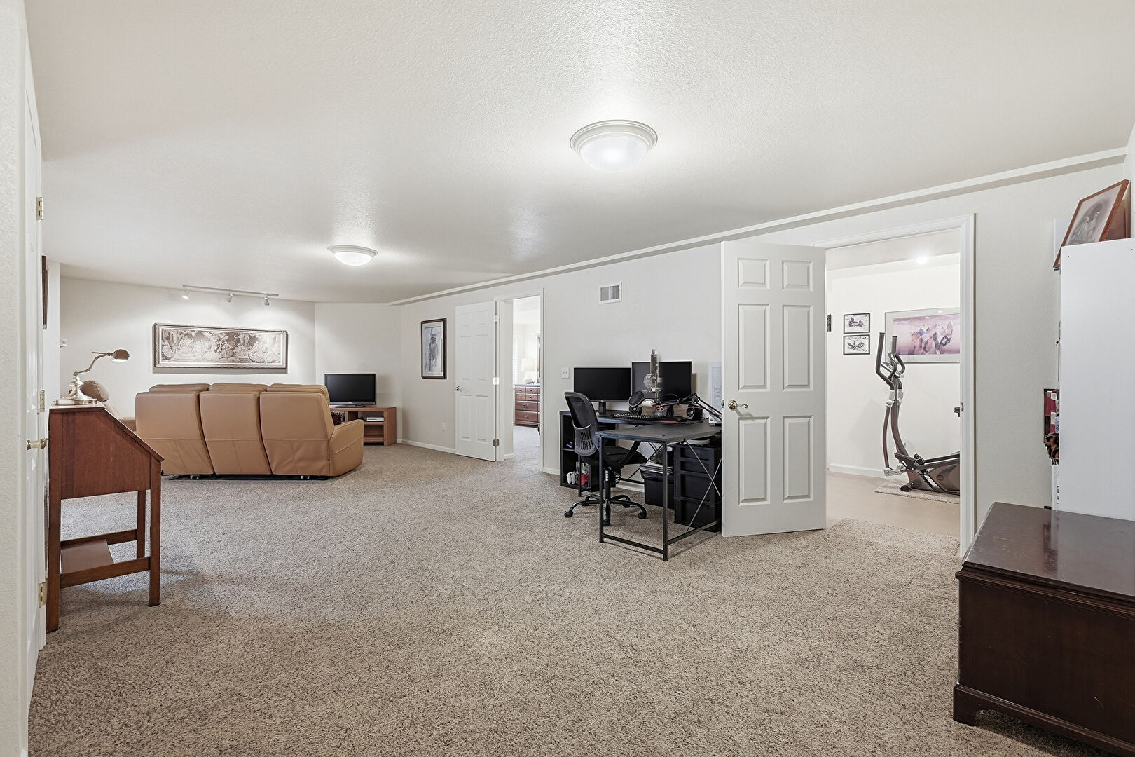 Baseboards Wall, Basement, Carpet, Drywall, Office Area, Textured Ceiling, Track Lighting, Vent, Baseboards Wall, Drywall, Natural Light, Track Lighting