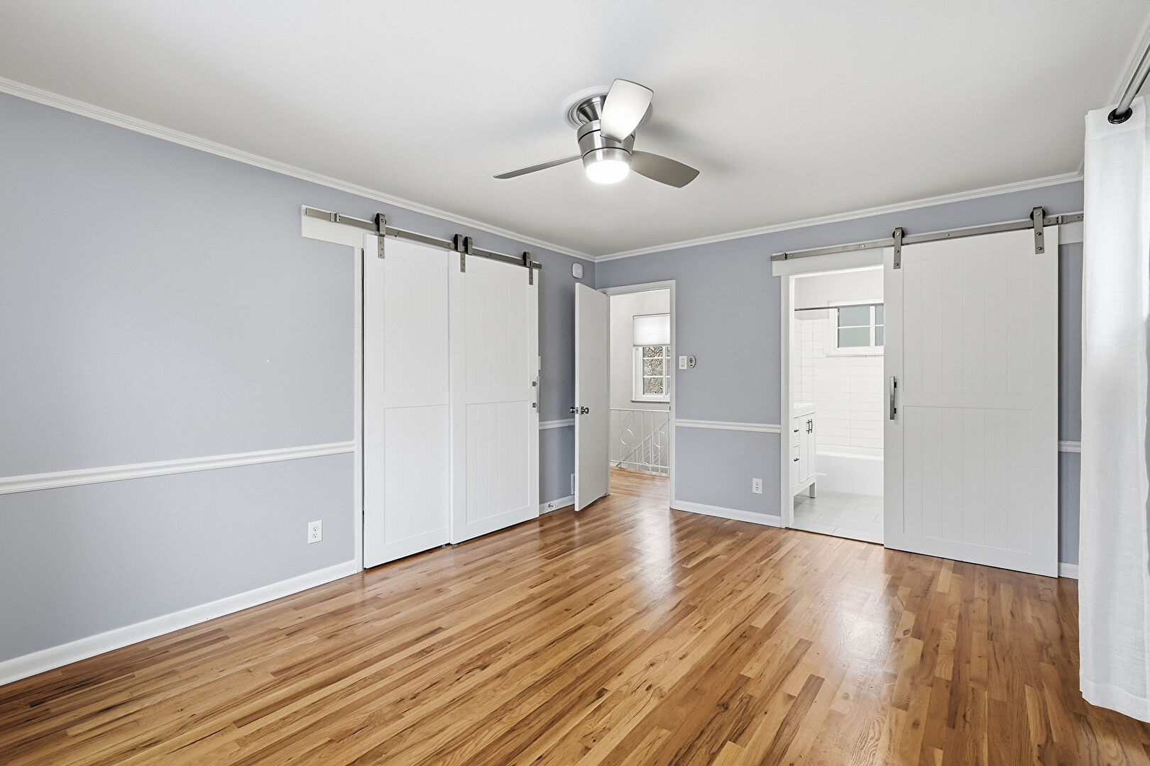 Barn Door, Baseboards Wall, Ceiling Fan, Crown Molding, Drywall, Ensuite Bathroom, Natural Light, Wood Finish Floor, Closet