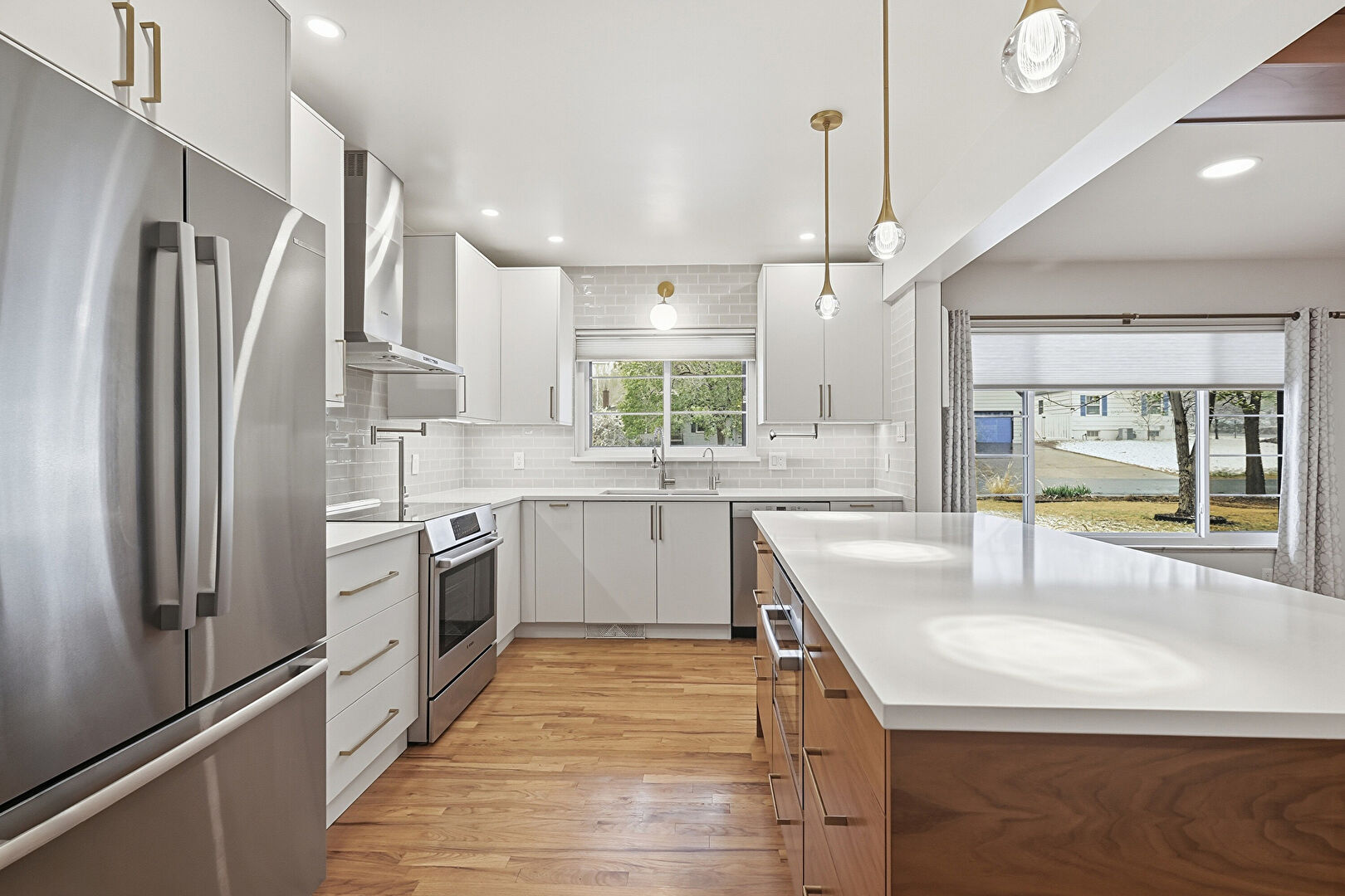 Flat Panel Cabinets, Medium Brown Cabinets, Natural Light, Pendant Lighting, Pot Filler, Recessed Lighting, Stone Countertops, Wood Finish Floor, Kitchen Island