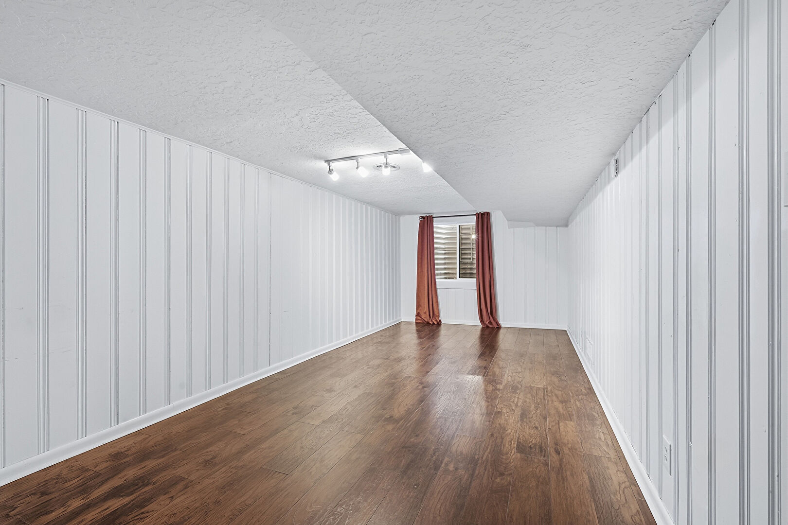 Baseboards Wall, Basement, Textured Ceiling, Track Lighting, Wood Finish Floor