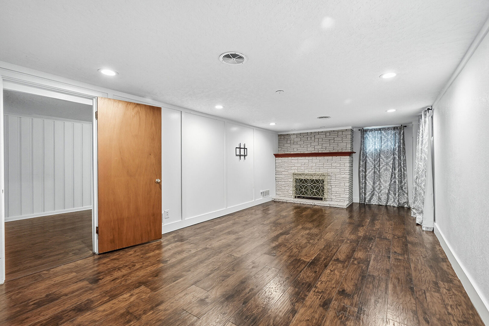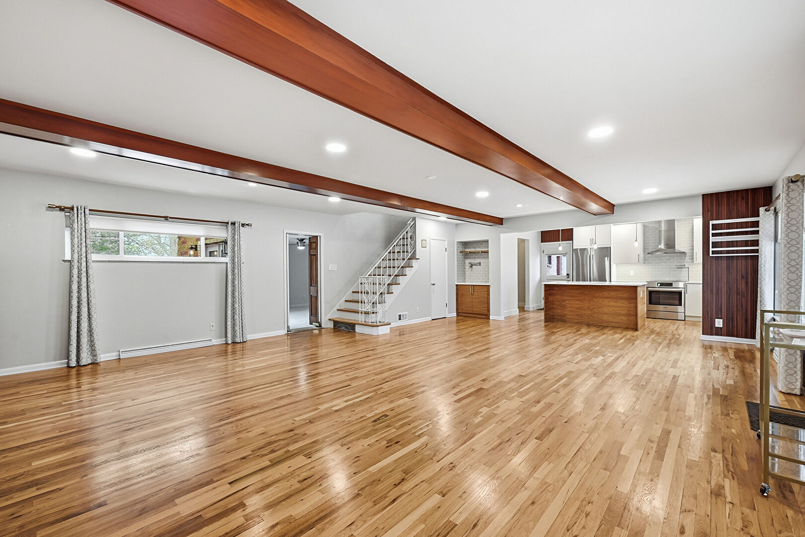 Baseboards Wall, Basement, Drywall, Fireplace, L Shaped Kitchen, Natural Light, Recessed Lighting, Stairs, Vent, Wood Finish Floor, Beamed Ceiling, Paneling Wall