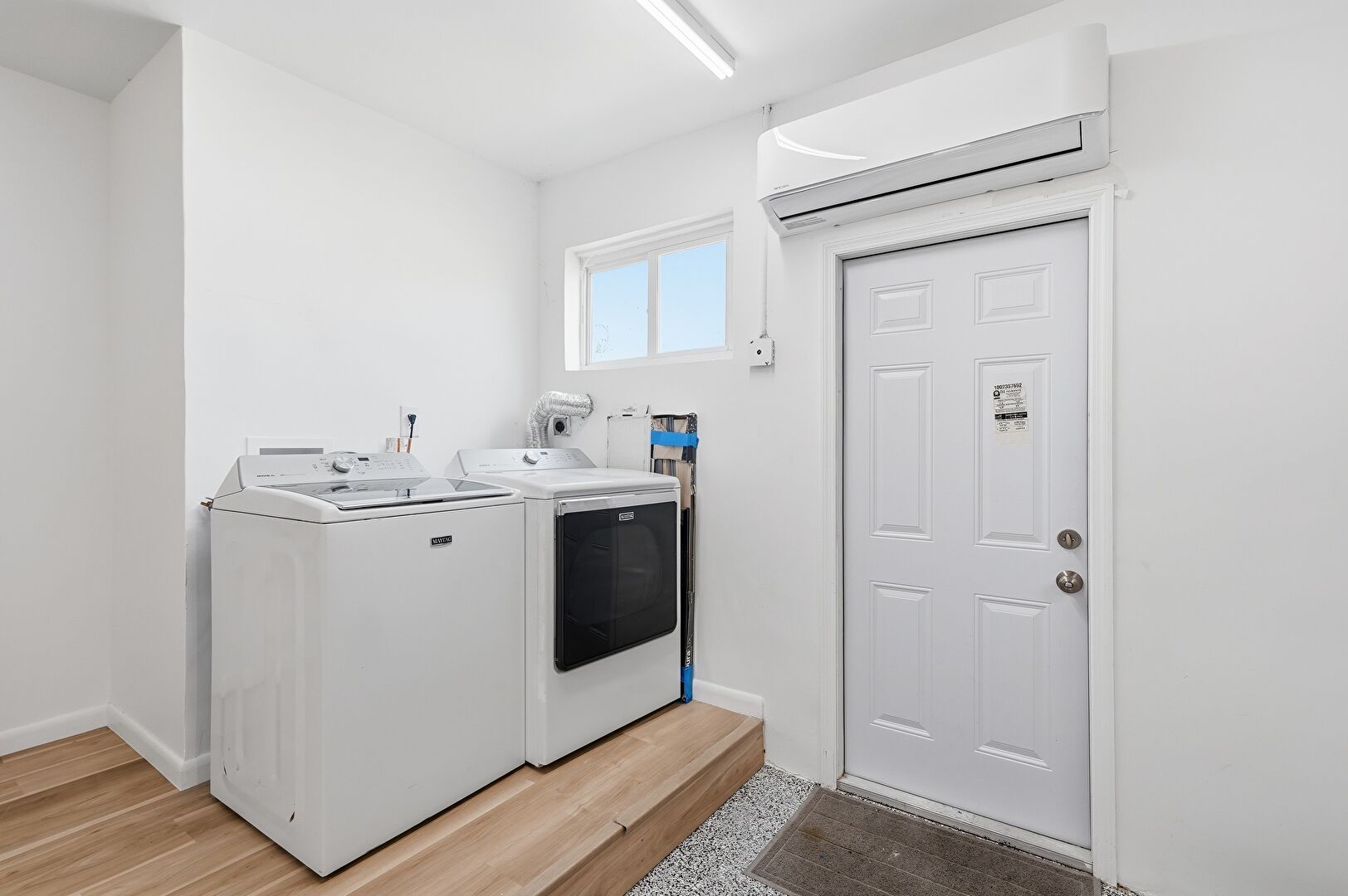 Baseboards Wall, Laundry, Natural Light, Wall Mounted Ac, Wood Finish Floor, Drywall