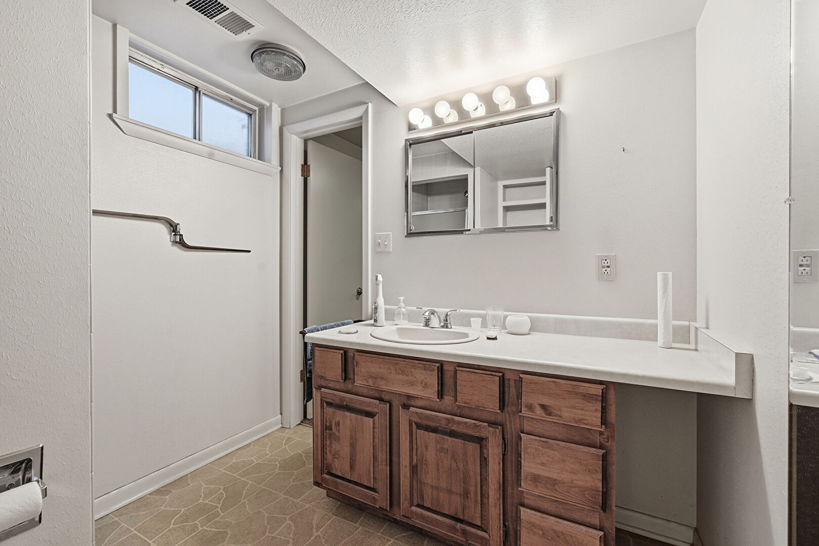 Baseboards Wall, Drywall, Full Bathroom, Textured Ceiling, Vanity, Vent, Natural Light