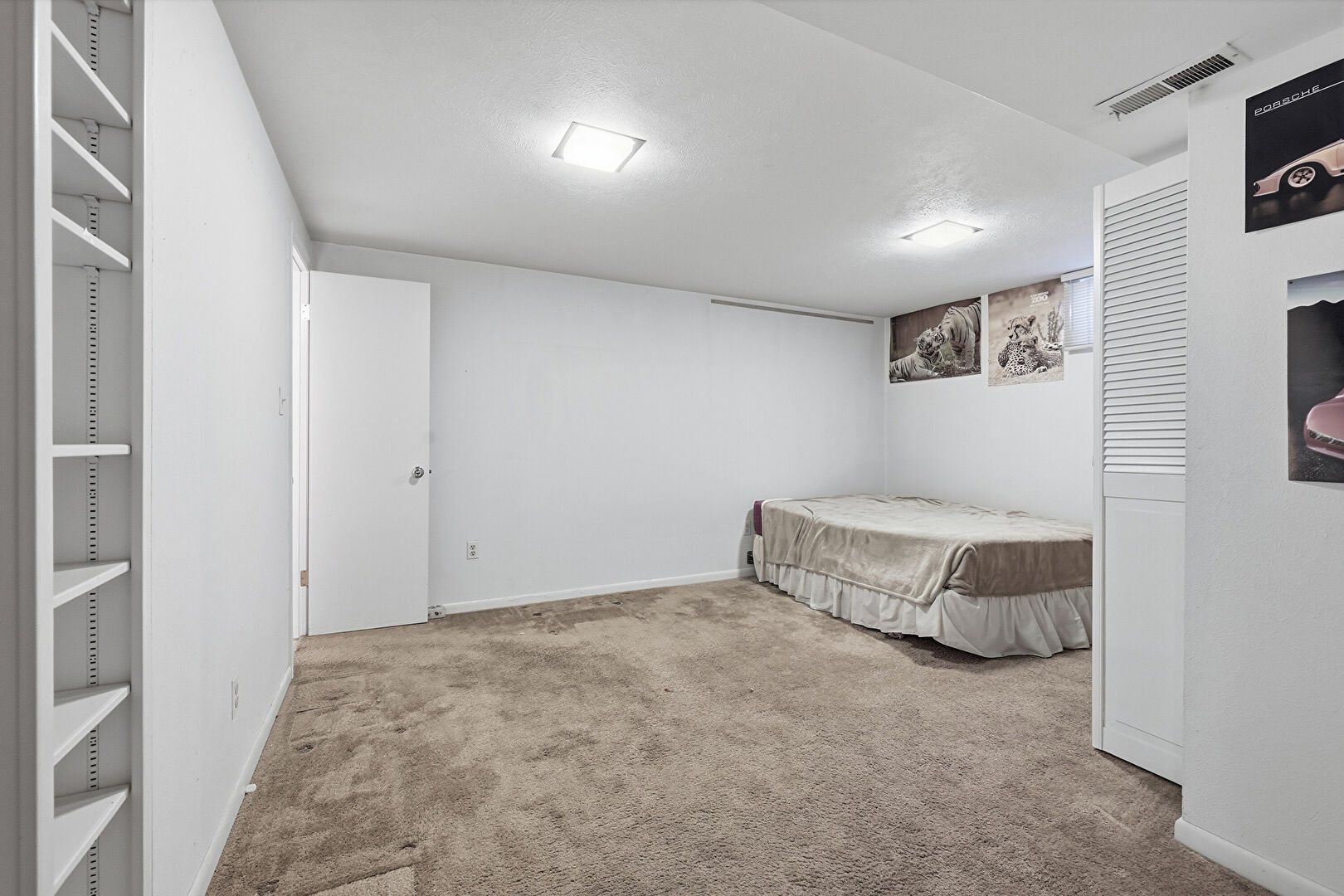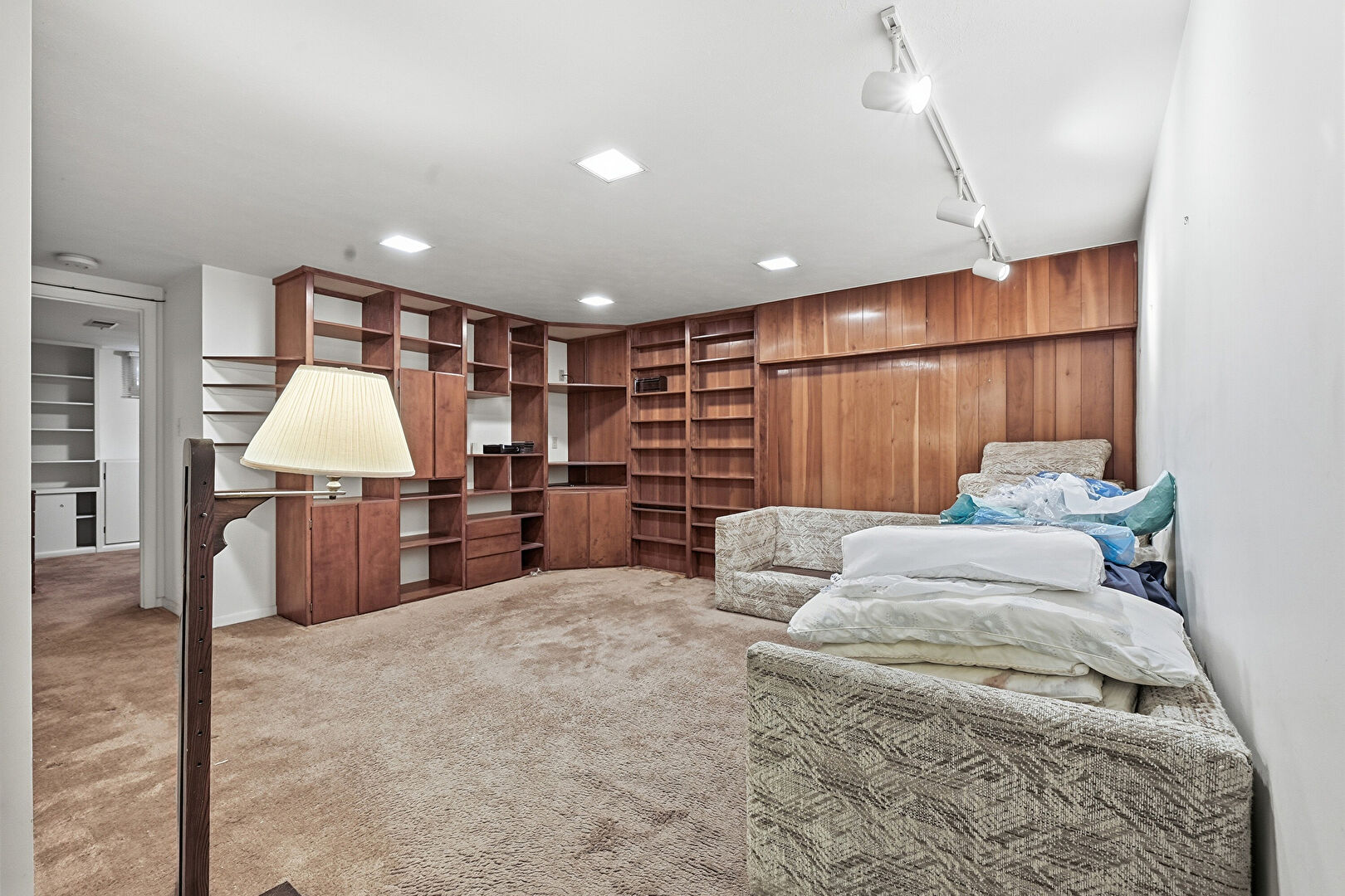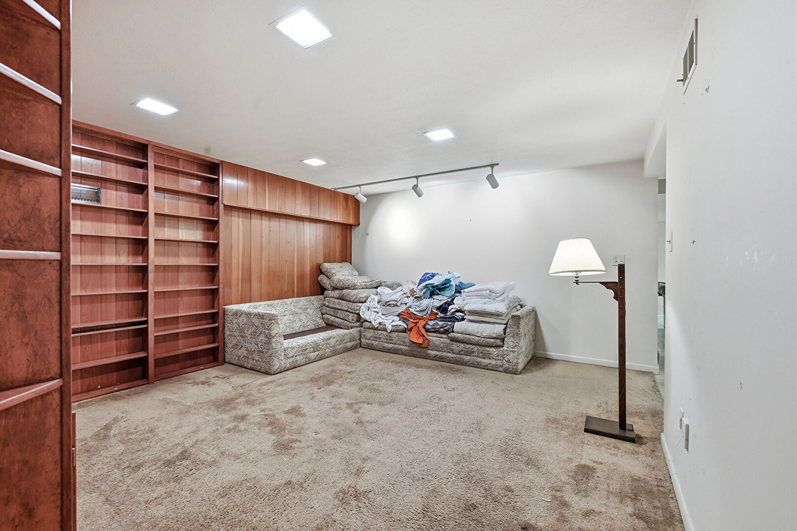 Baseboards Wall, Basement, Built In Shelves, Carpet, Drywall, Track Lighting, Vent, Wood Wall, Basement, Carpet