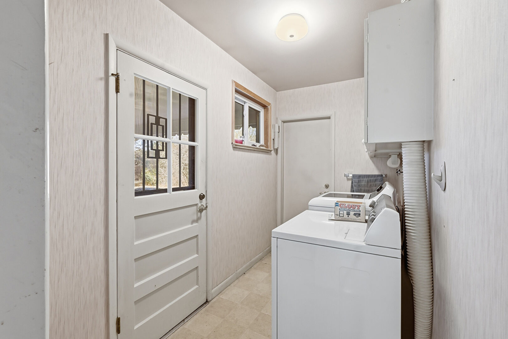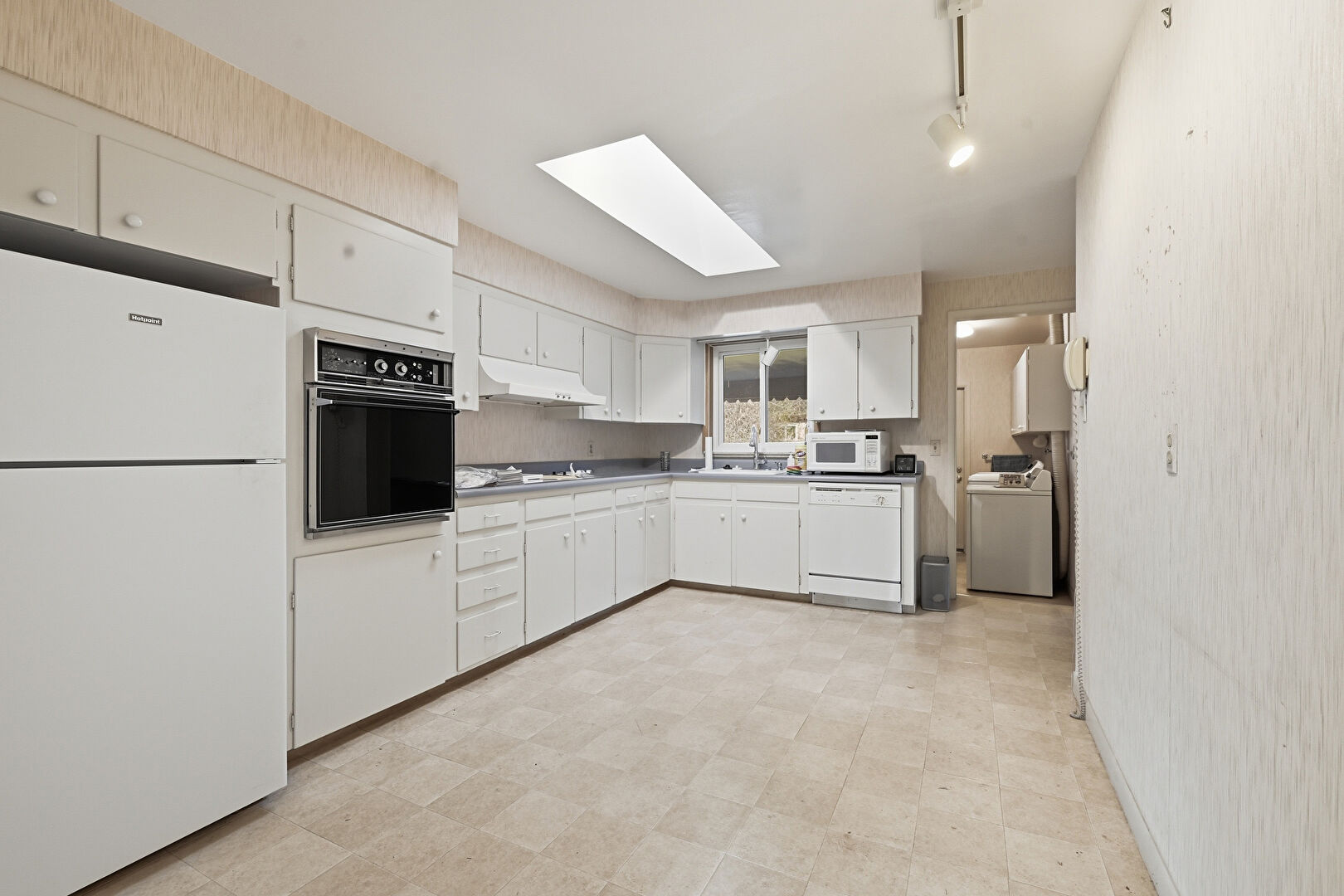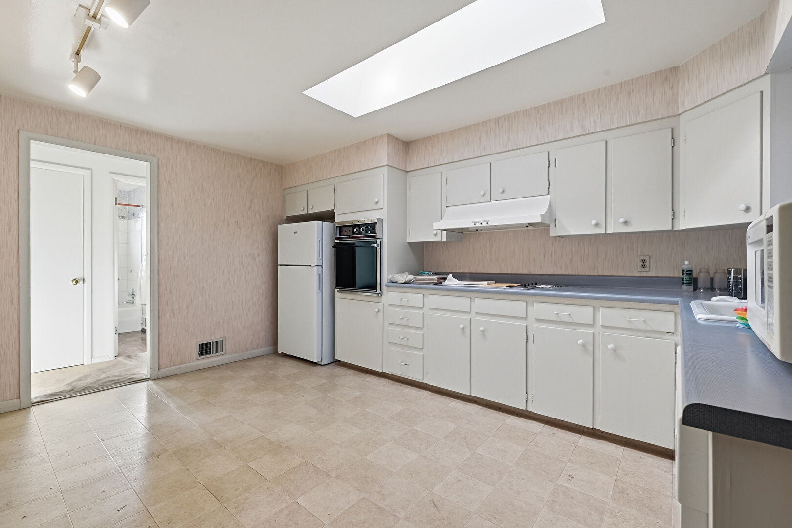 Baseboards Wall, L Shaped Kitchen, Laundry, Skylight, Track Lighting, Vent, Vinyl Floor, Visible Hinge Cabinets, Wallpaper Wall, Washer Dryer, Natural Light, Vinyl Floor