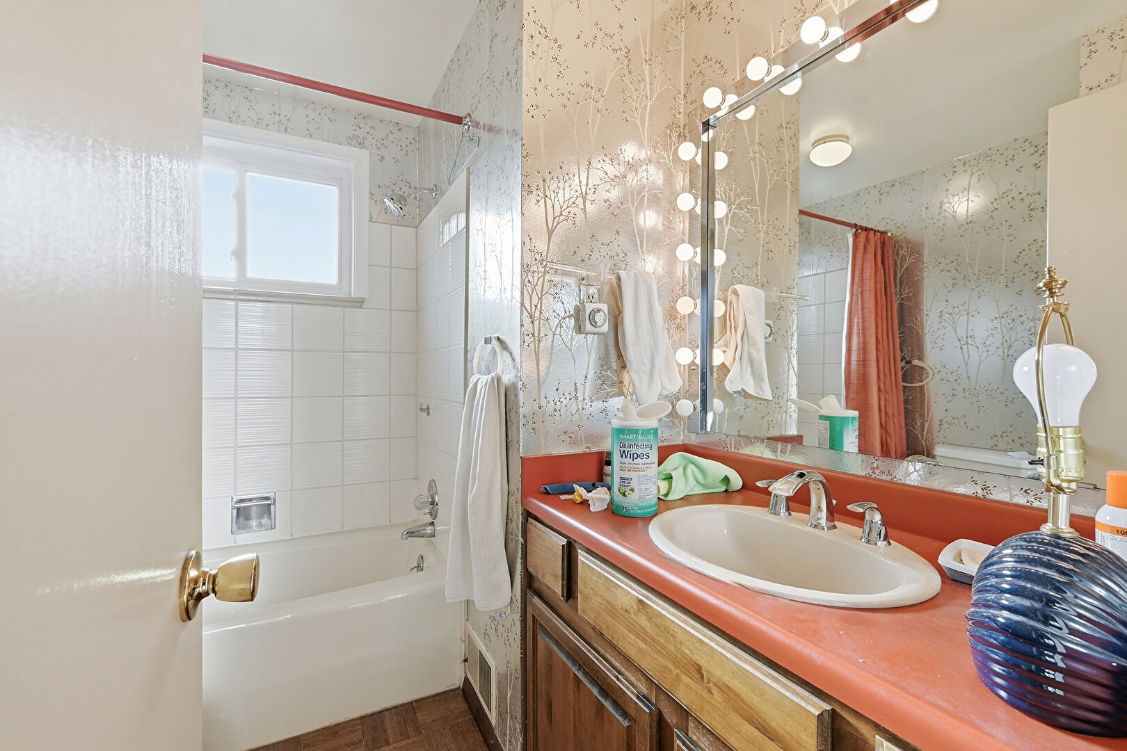 Combined Bath Shower, Natural Light, Vanity, Wallpaper Wall, Wood Finish Floor, Full Bathroom