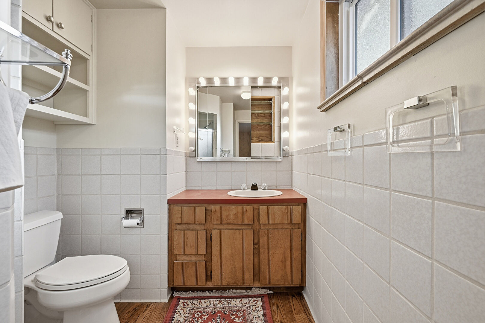 Drywall, Half Bathroom, Tile Wall, Wainscot Wall, Wood Finish Floor, Vanity