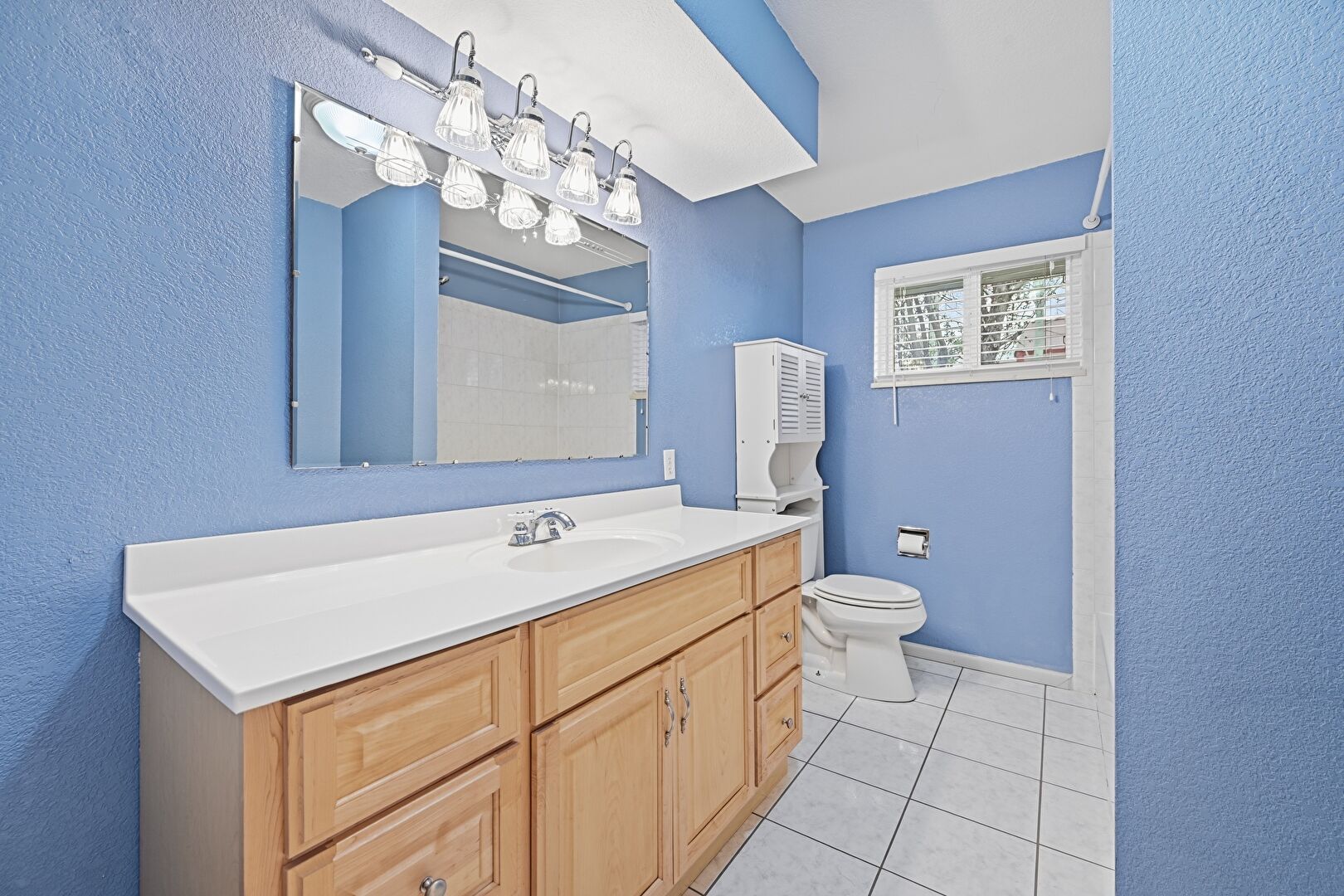 Baseboards Wall, Full Bathroom, Textured Wall, Tile Floor, Vanity, Natural Light