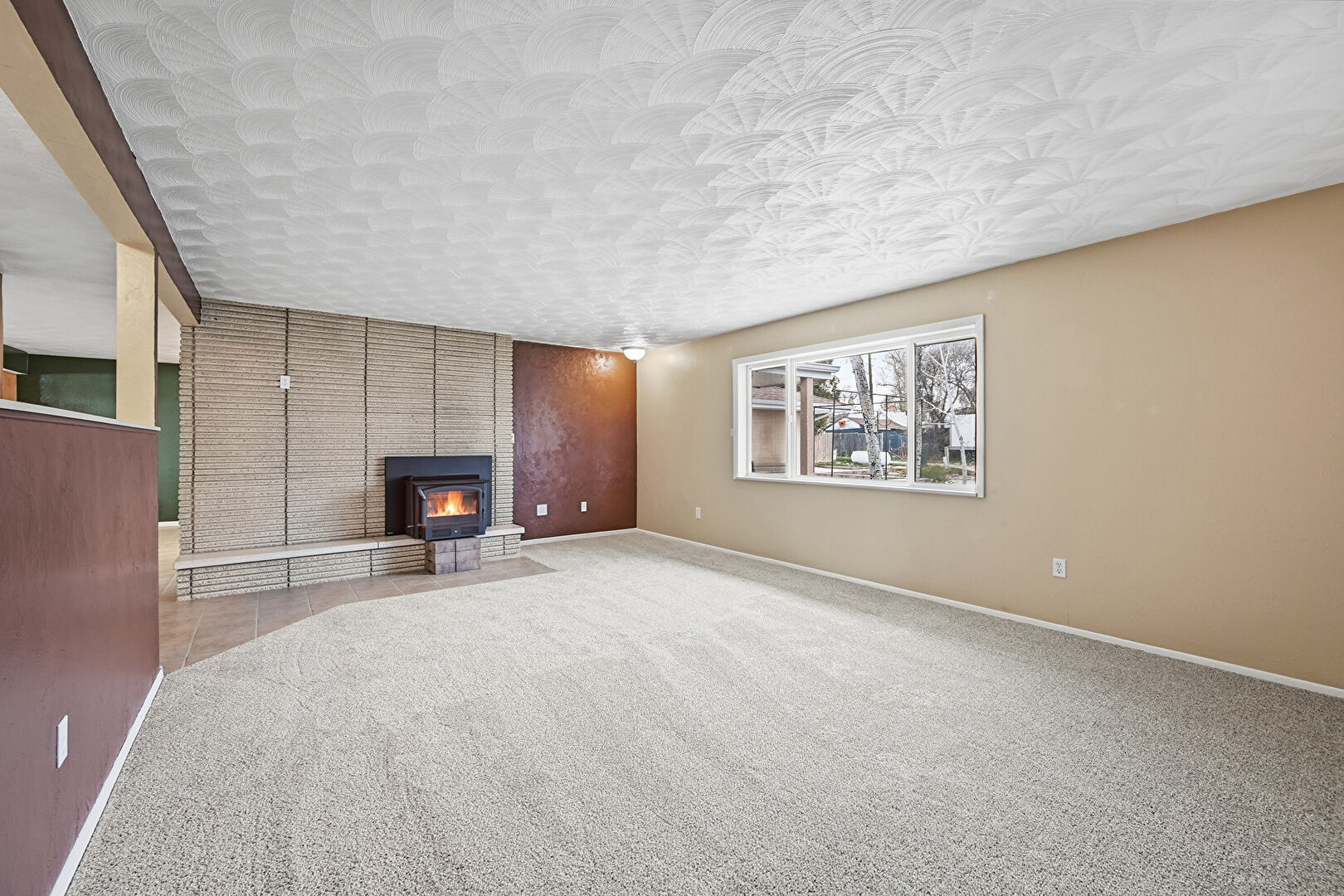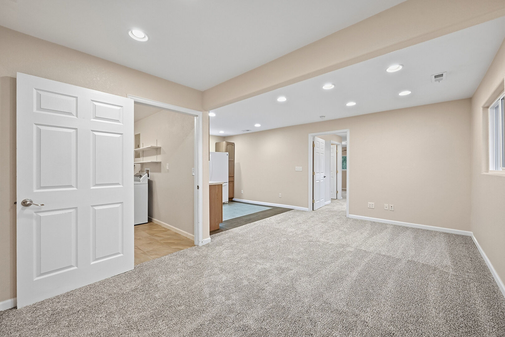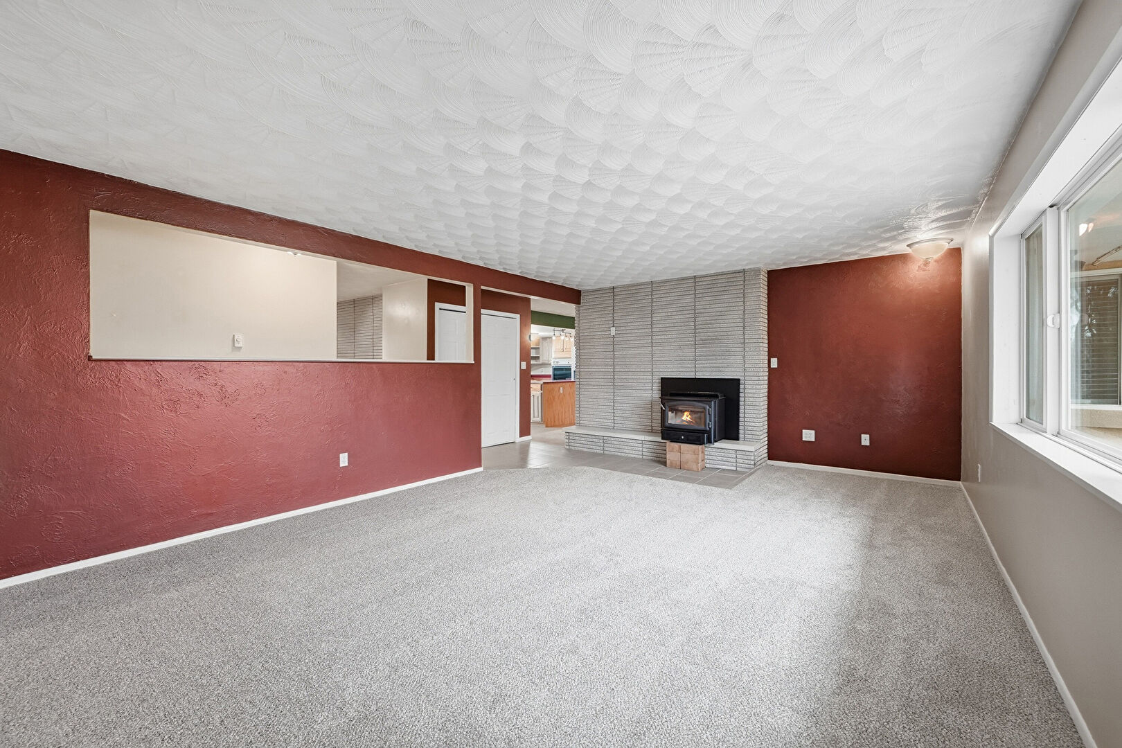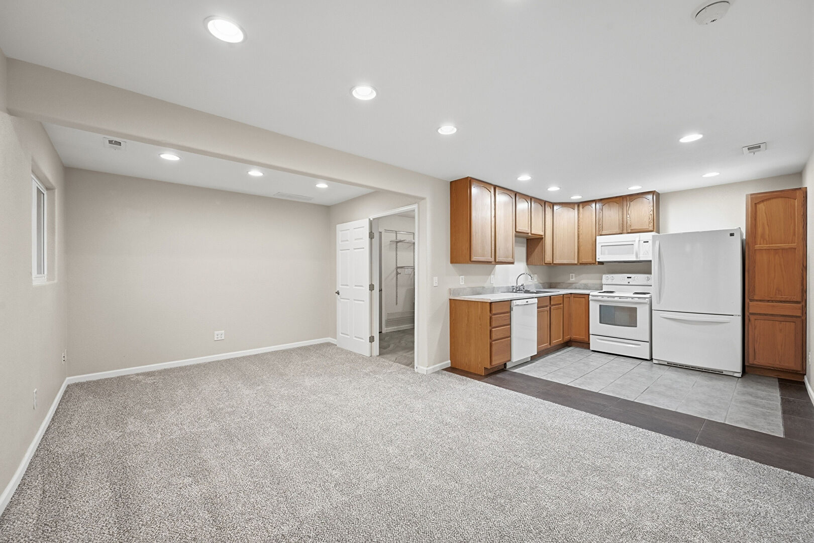 Accent Wall, Baseboards Wall, Carpet, Drywall, Fireplace, L Shaped Kitchen, Medium Brown Cabinets, Natural Light, Opens To Living Area, Recessed Lighting, Shaker Cabinets, Smoke Carbon Monoxide Detector, Textured Wall, Tile Floor, Vent, Washer Dryer, Arched Cabinets, Carpet, Drywall, Laundry, Natural Light