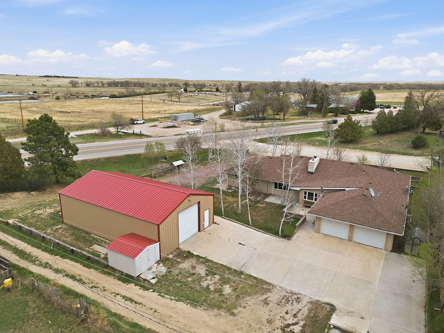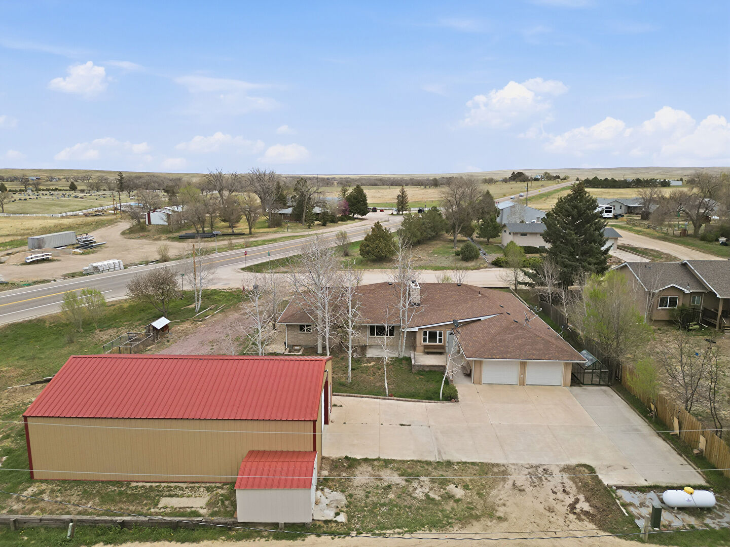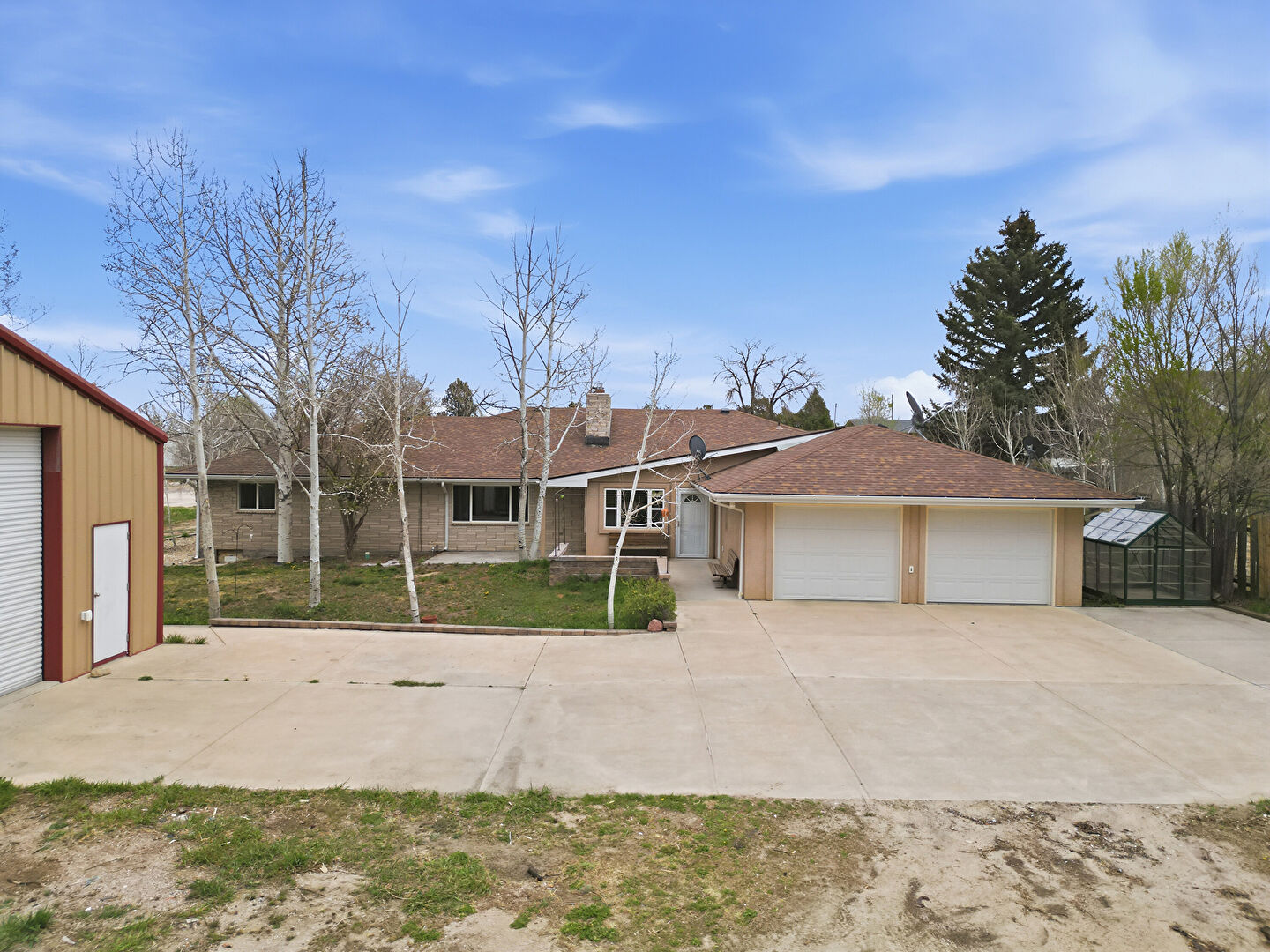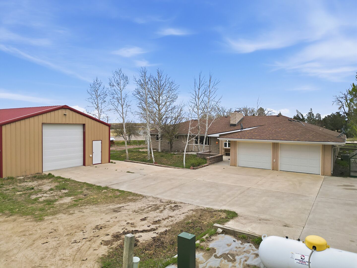 Chimney, Detached Garage, Downspout, Driveway, Fence, Gutters, Lawn, Outdoor Structure, Parking Pad, Residential View, Rural View, Rv Garage, Shingle Roof, Stucco Siding, Downspout, Driveway, Residential View, Rural View, Stucco Siding