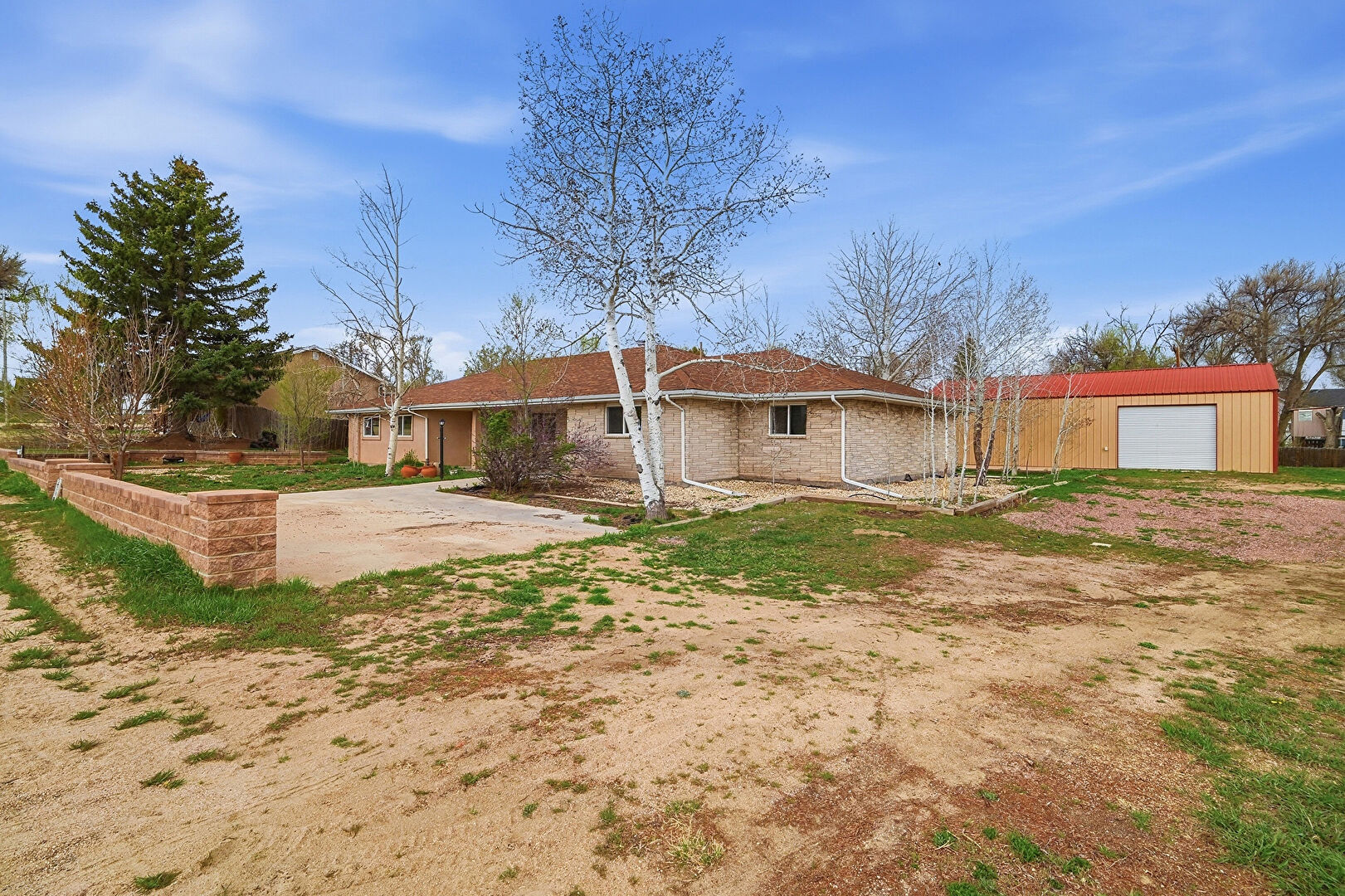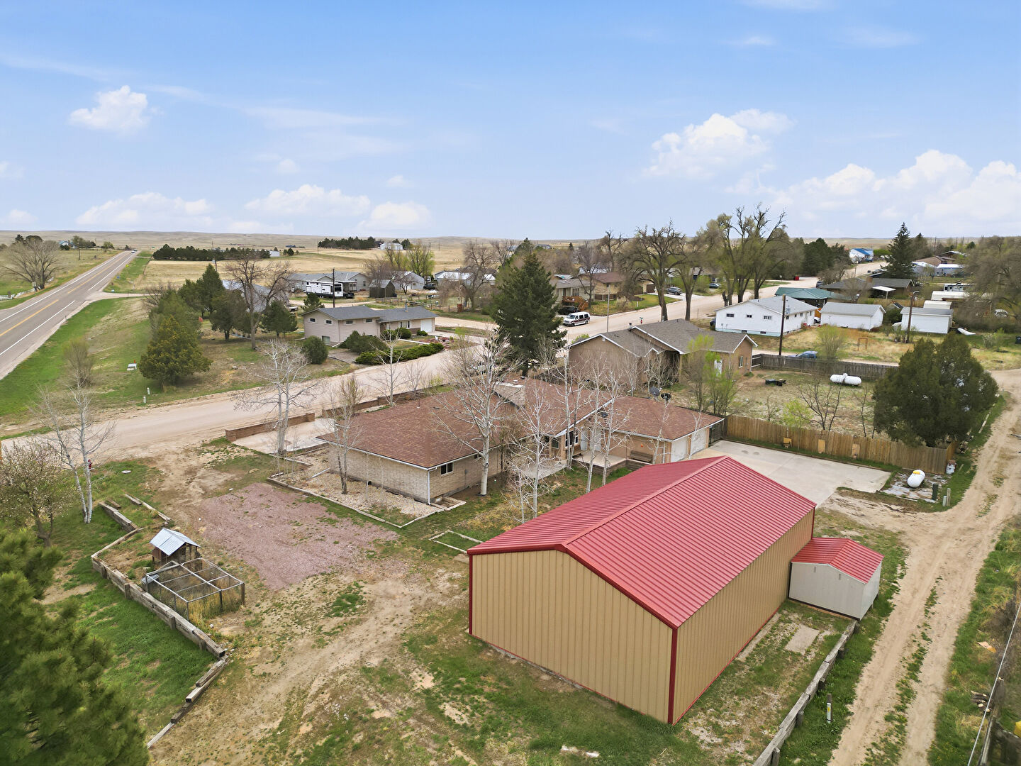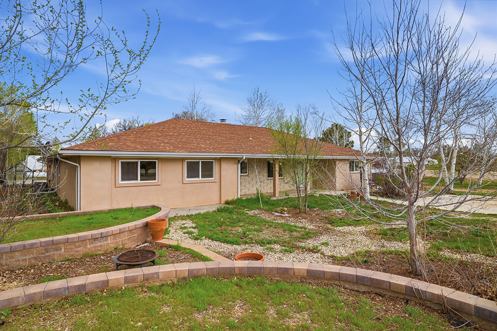 Chimney, Detached Garage, Downspout, Driveway, Fence, Gutters, Lawn, Outdoor Structure, Parking Pad, Residential View, Rural View, Rv Garage, Shingle Roof, Stucco Siding, Downspout, Driveway, Residential View, Rural View, Stucco Siding