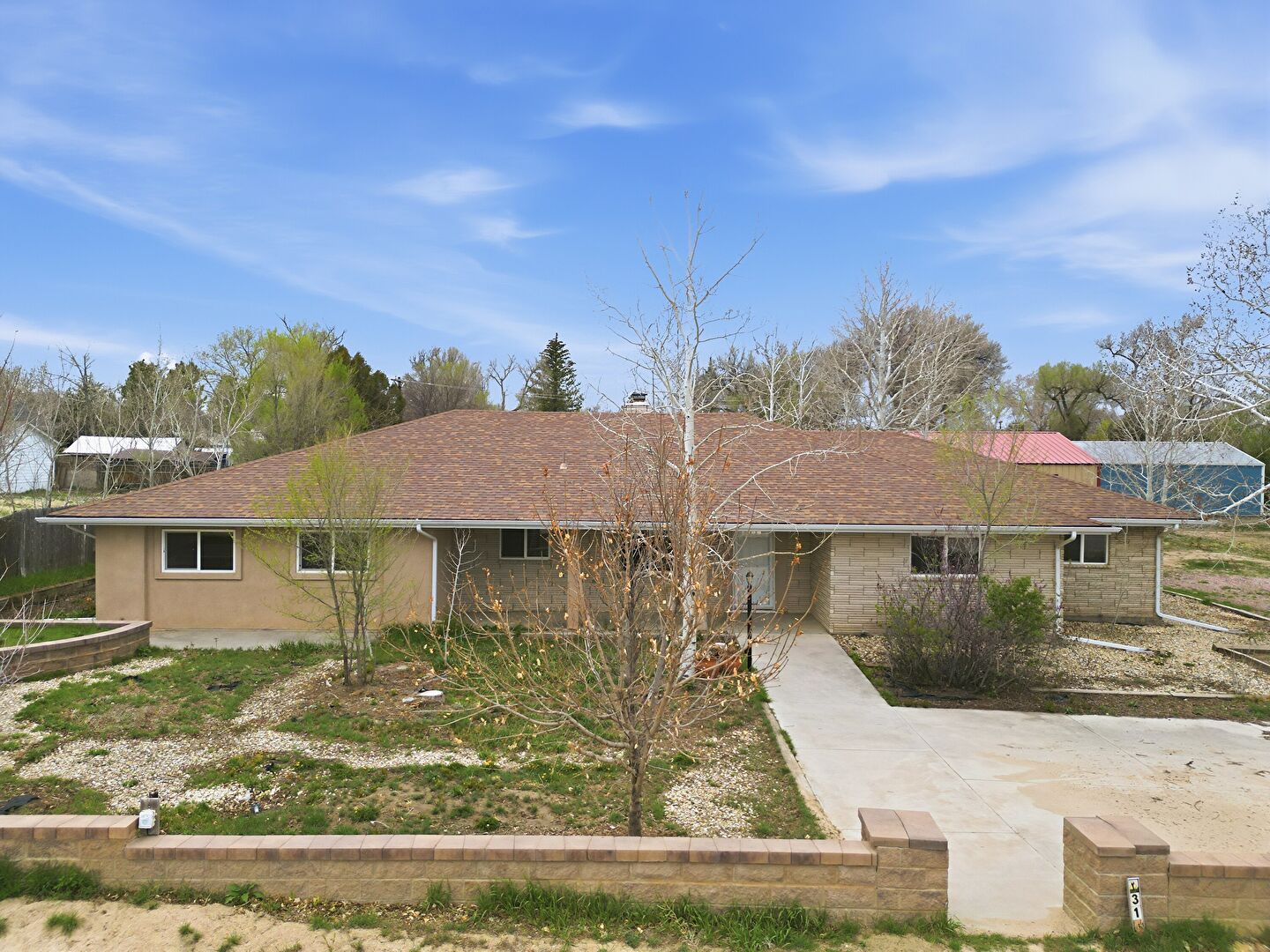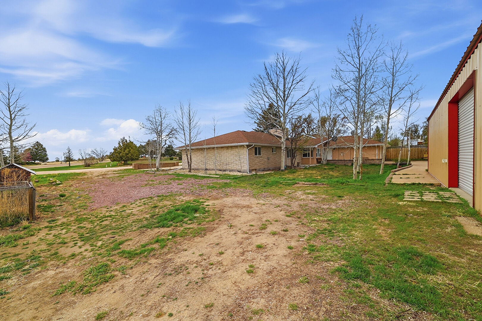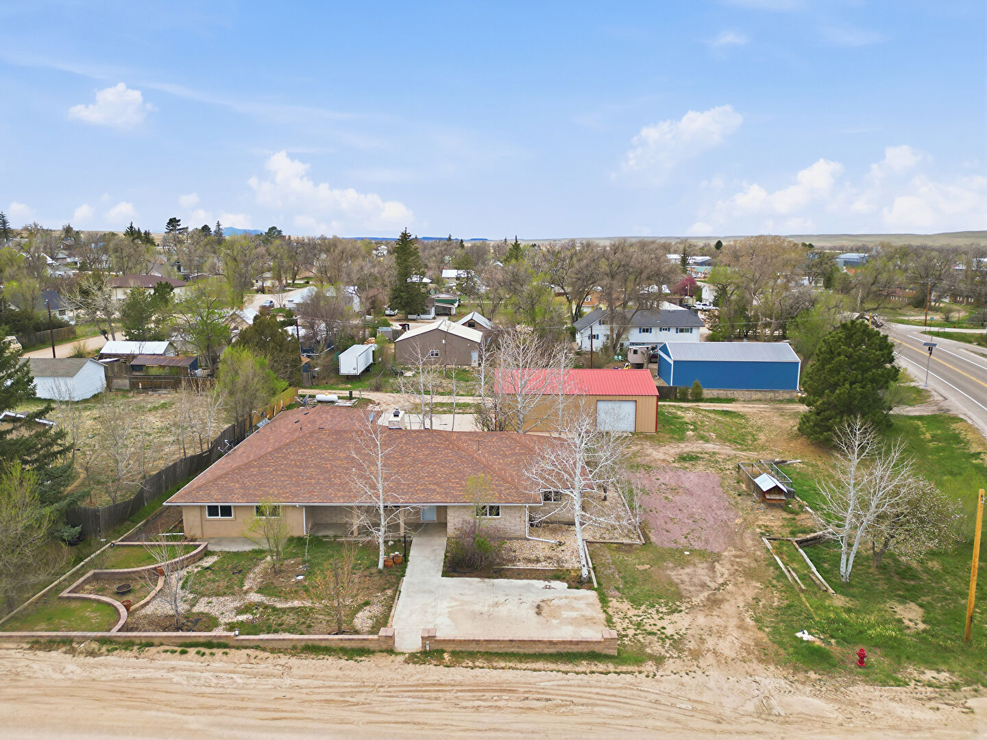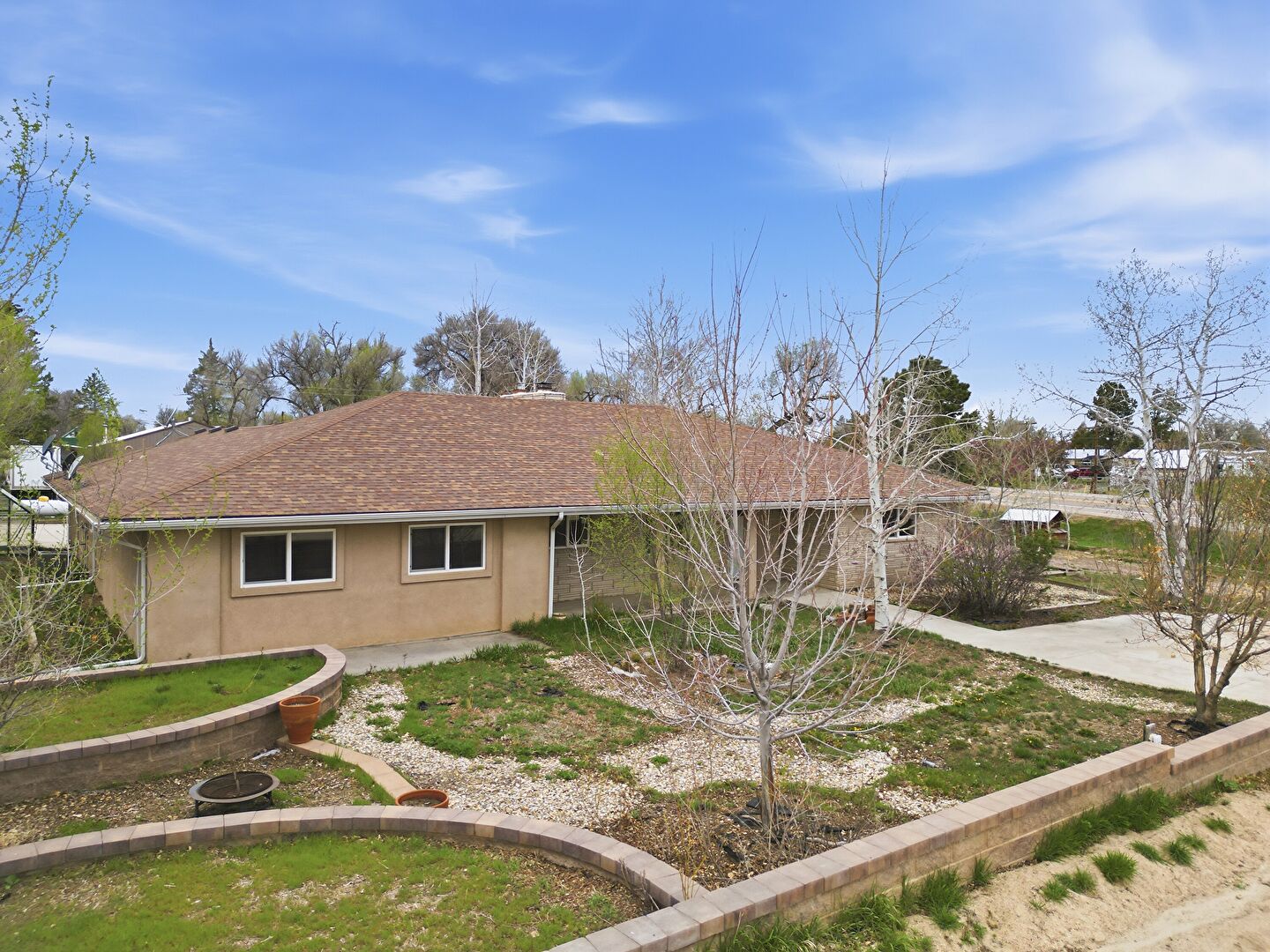 Chimney, Detached Garage, Downspout, Driveway, Fence, Gutters, Lawn, Outdoor Structure, Parking Pad, Residential View, Rural View, Rv Garage, Shingle Roof, Stucco Siding, Downspout, Driveway, Residential View, Rural View, Stucco Siding