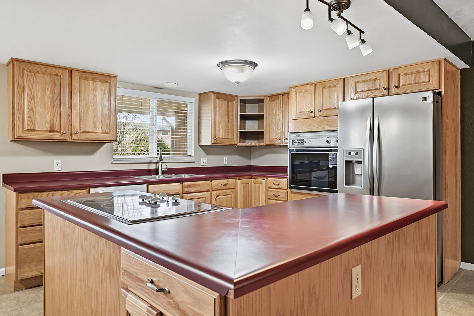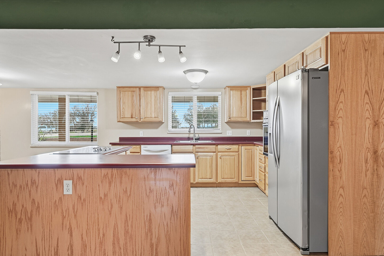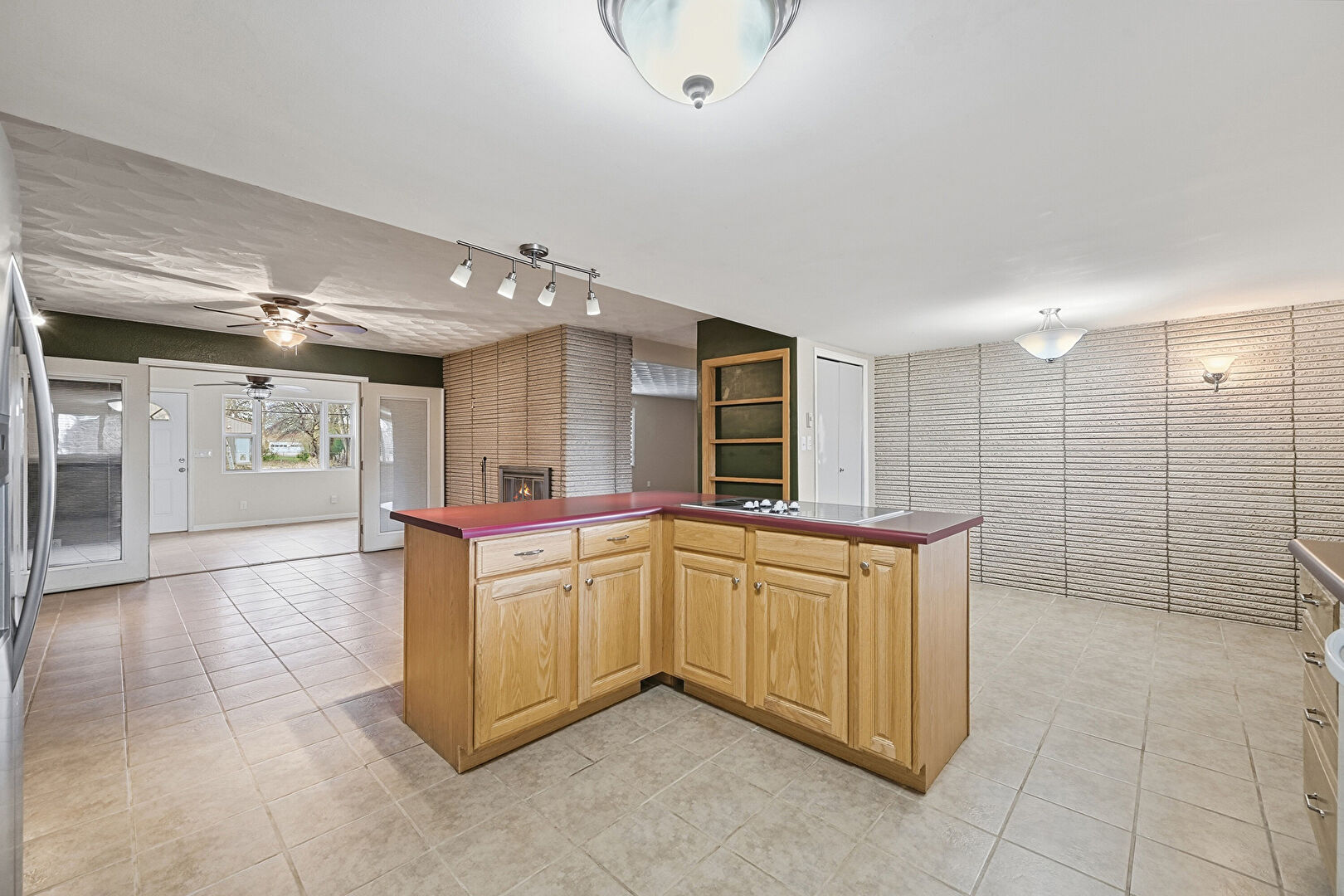 Arched Cabinets, Baseboards Wall, Carpet, Ceiling Fan, Drywall, Fireplace, Kitchen Island, L Shaped Kitchen, Natural Light, Open Shelves, Opens To Living Area, Raised Cabinets, Recessed Lighting, Shaker Cabinets, Tile Floor, Track Lighting, Medium Brown Cabinets, Natural Light, Raised Cabinets