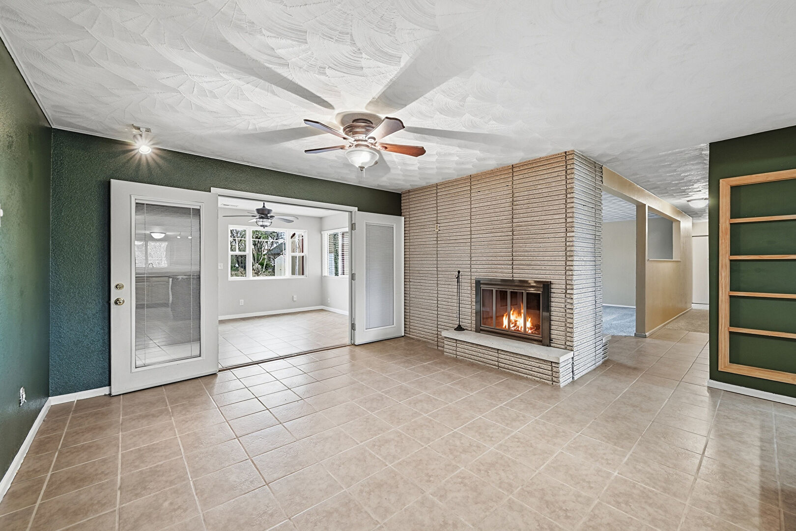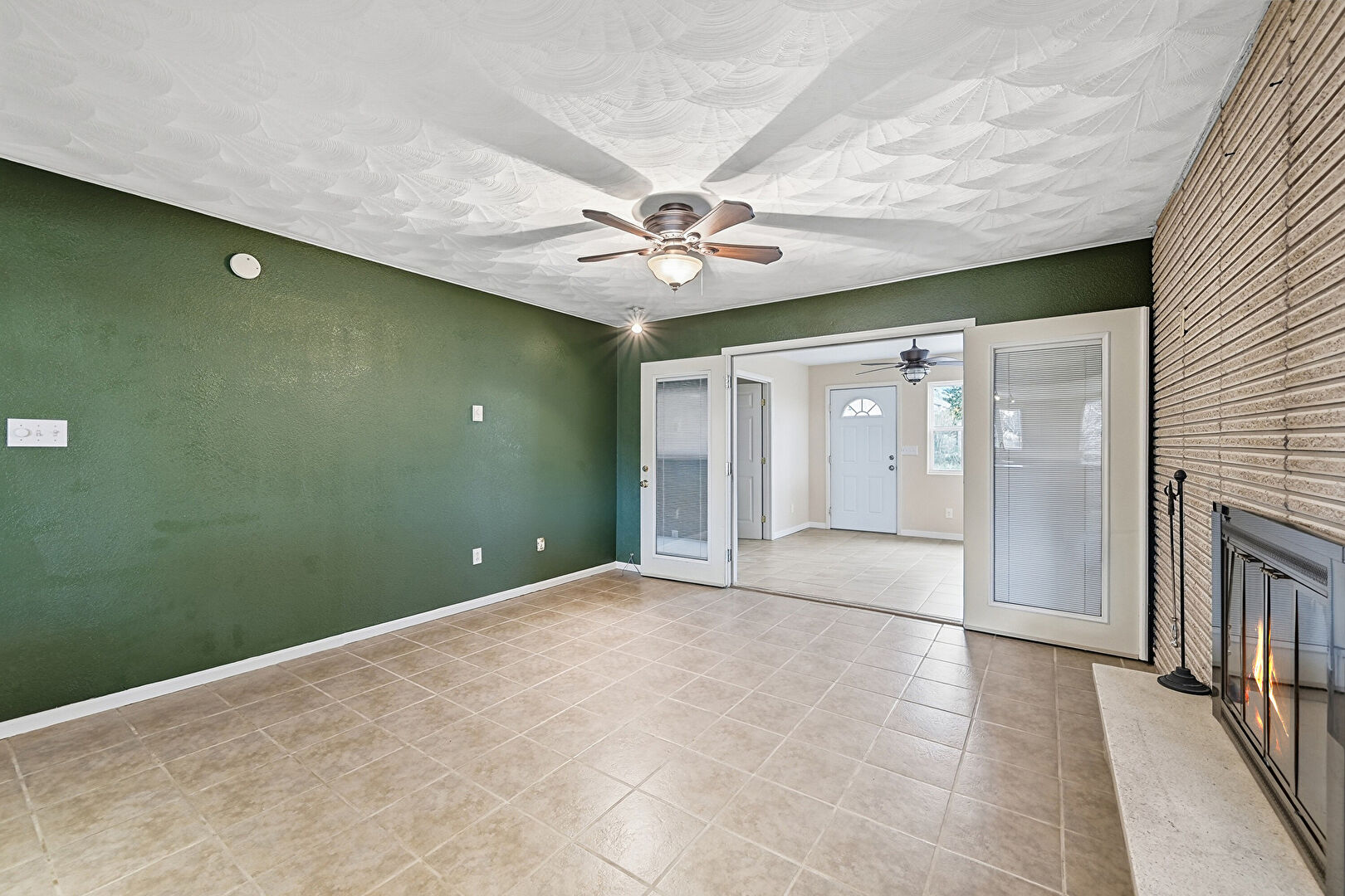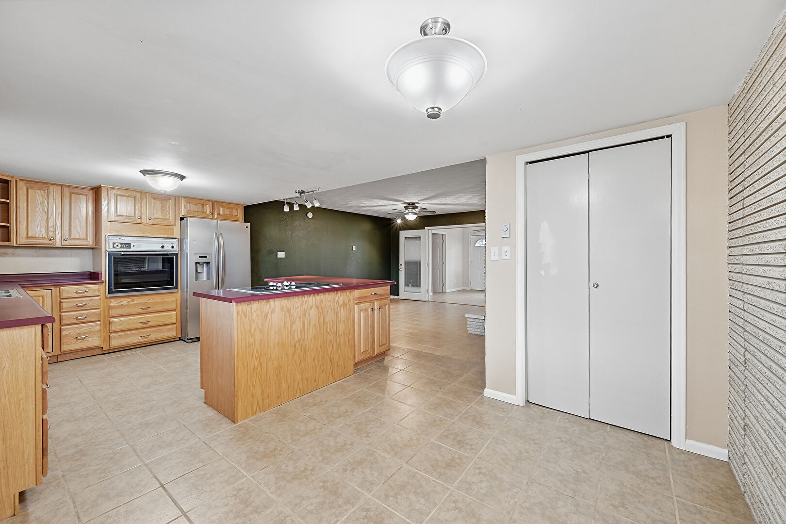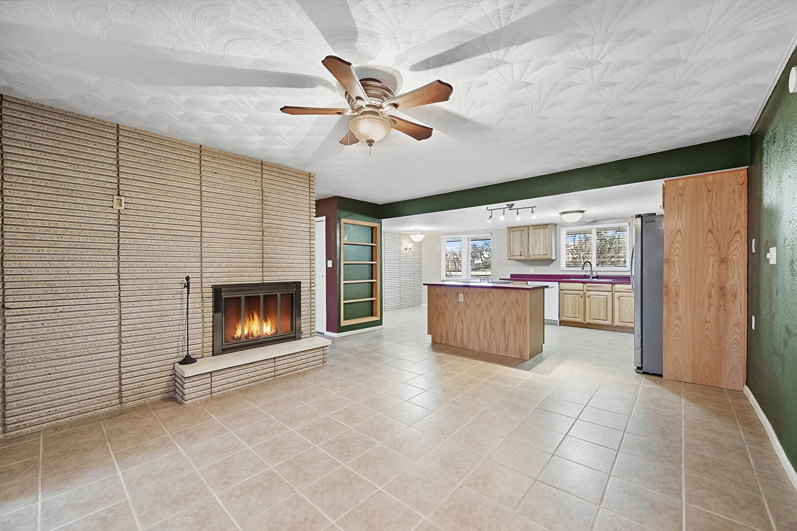 Baseboards Wall, Brick Wall, Ceiling Fan, Drywall, Fireplace, French Doors, Kitchen Island, L Shaped Kitchen, Natural Light, Opens To Living Area, Raised Cabinets, Textured Ceiling, Textured Wall, Tile Floor, Ceiling Fan, Fireplace, Tile Floor