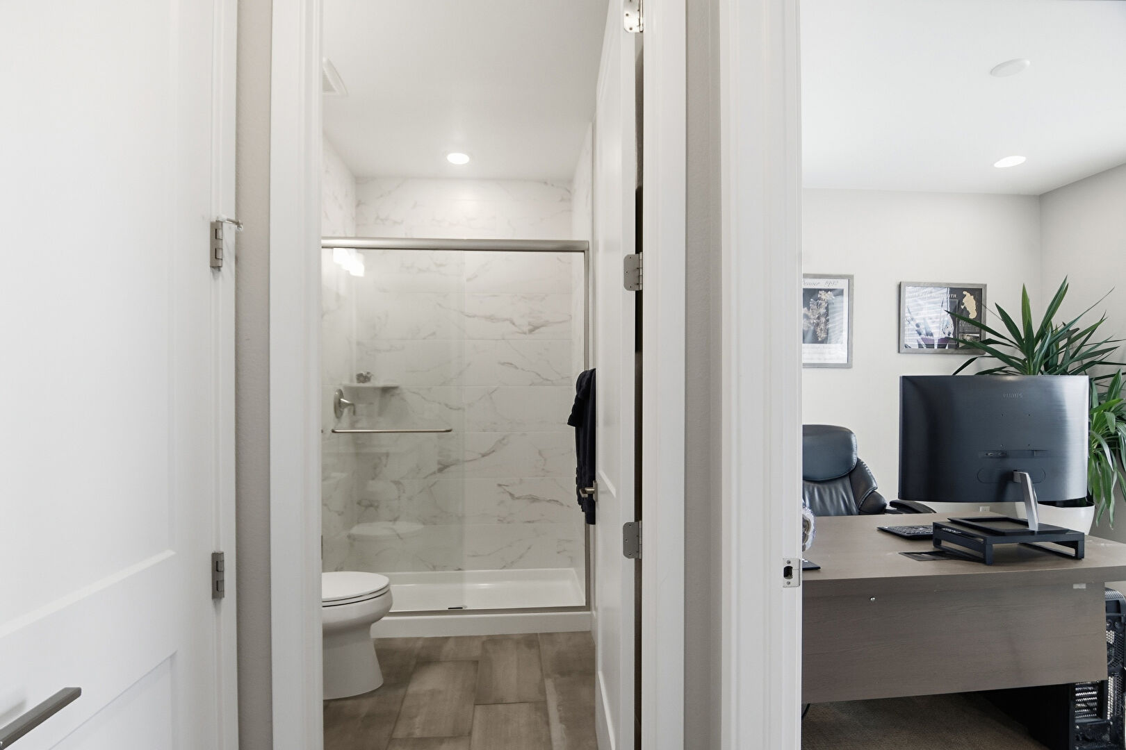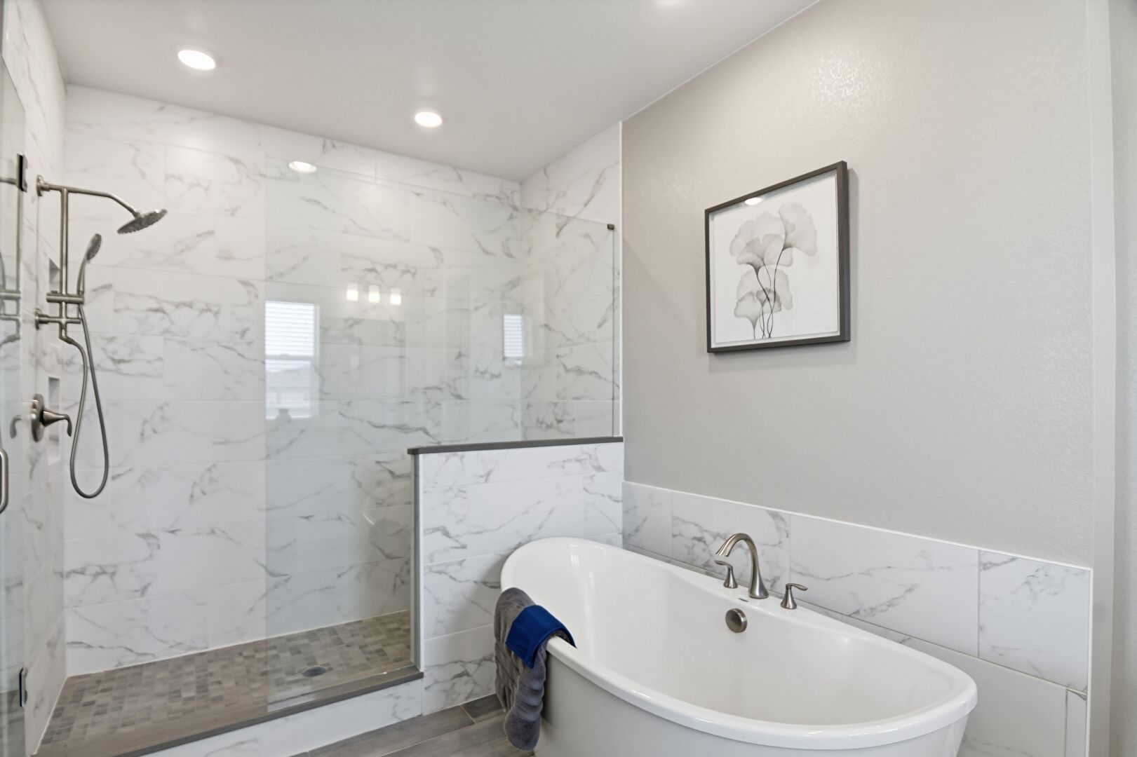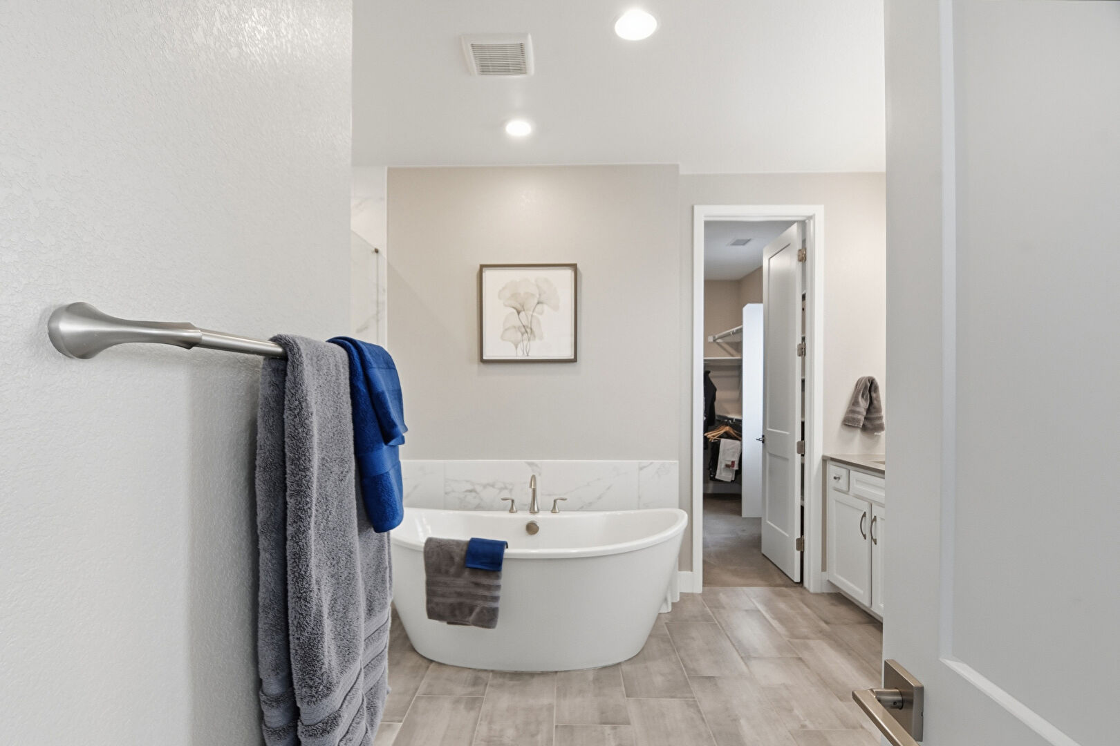 Baseboards Wall, Combined Bath Shower, Double Vanity, Drywall, Ensuite Bathroom, Full Bathroom, Natural Light, Recessed Lighting, Tile Floor, Tile Wall, Vanity, Vent, Wainscot Wall, Walk In Closet, Water Closet, Wood Finish Floor, Drywall, Full Bathroom, Textured Wall, Vanity, Vent