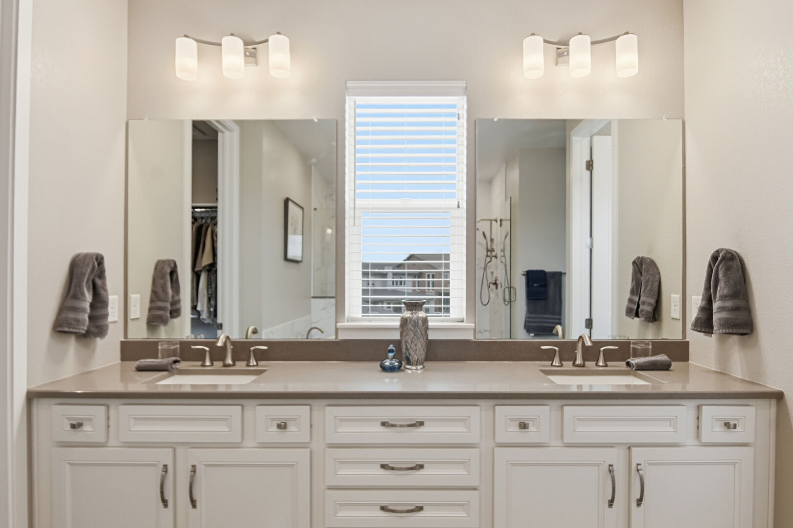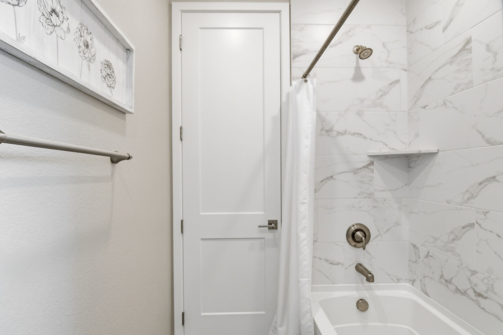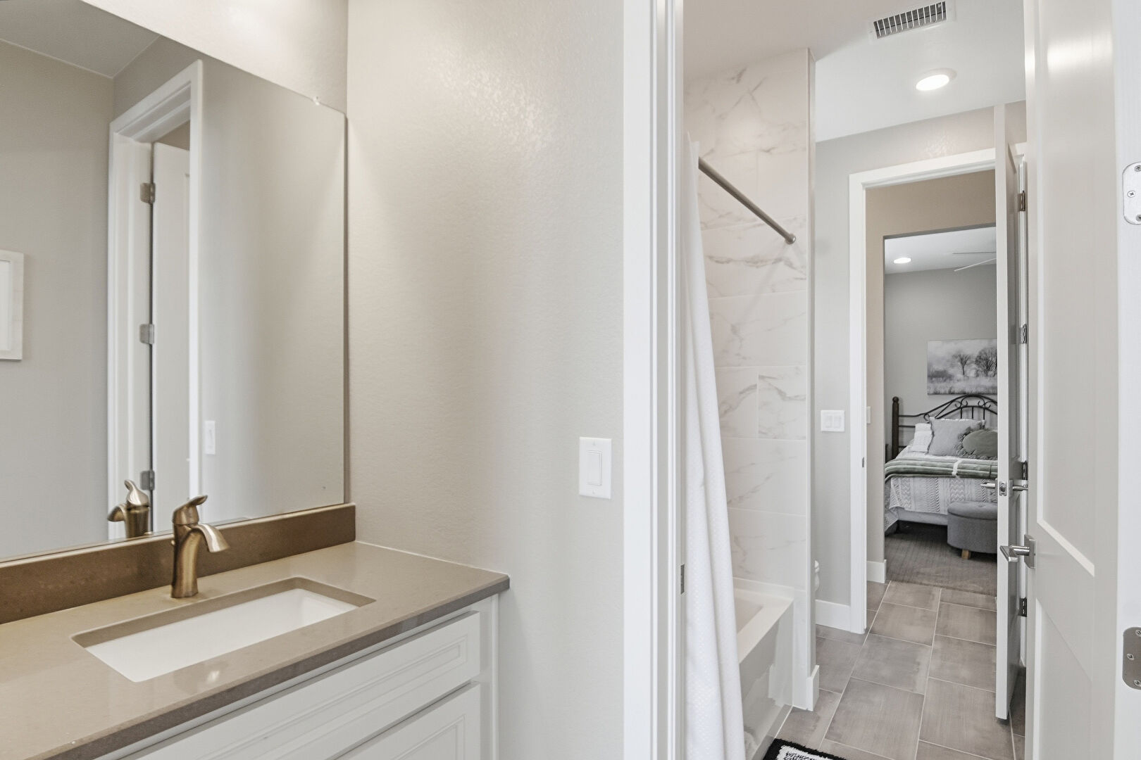 Baseboards Wall, Combined Bath Shower, Double Vanity, Drywall, Ensuite Bathroom, Full Bathroom, Natural Light, Recessed Lighting, Tile Floor, Tile Wall, Vanity, Vent, Wainscot Wall, Walk In Closet, Water Closet, Wood Finish Floor, Drywall, Full Bathroom, Textured Wall, Vanity, Vent