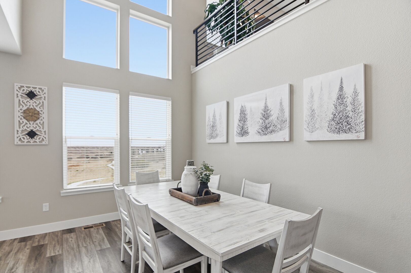 Baseboards Wall, Drywall, High Ceiling, Natural Light, Stairs, Vent, Wood Finish Floor, Baseboards Wall, Natural Light