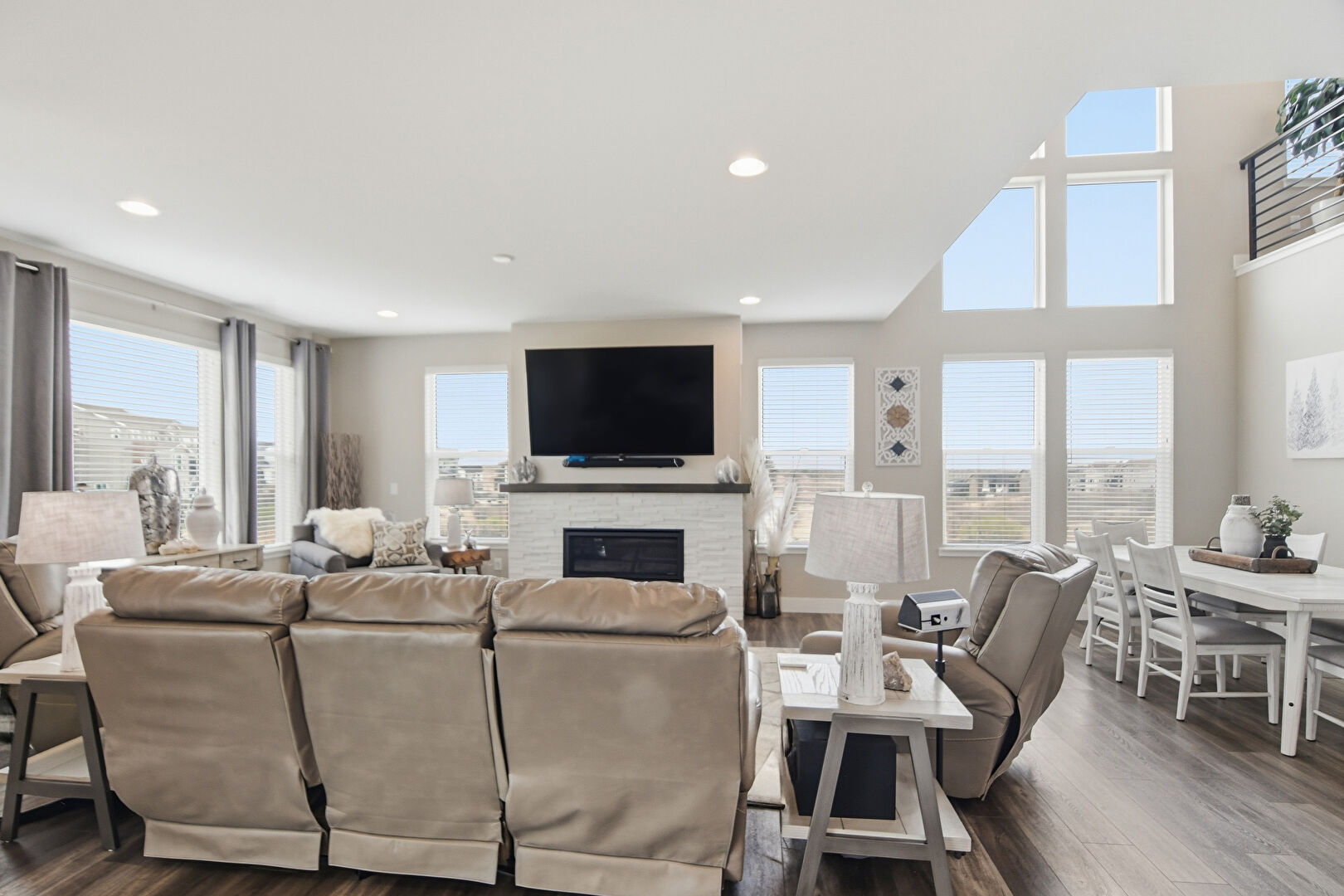 Baseboards Wall, Drywall, High Ceiling, Natural Light, Recessed Lighting, Wood Finish Floor, Fireplace