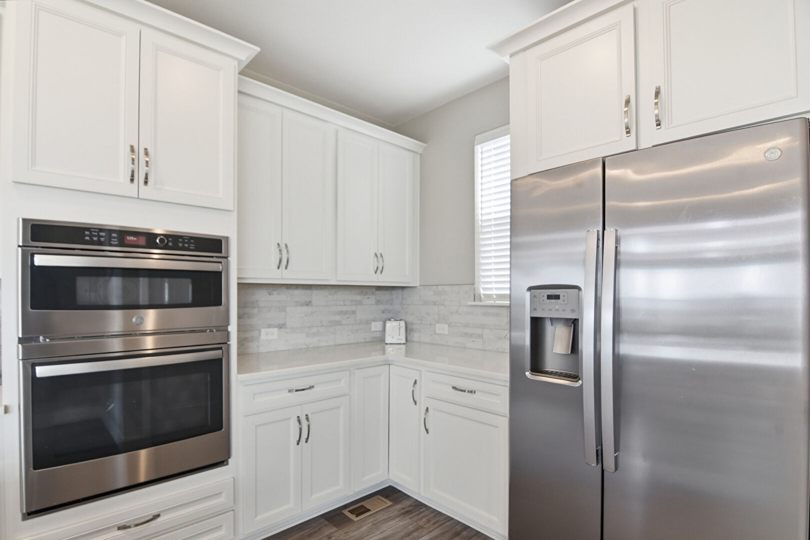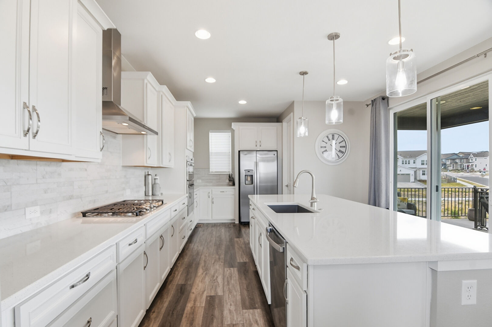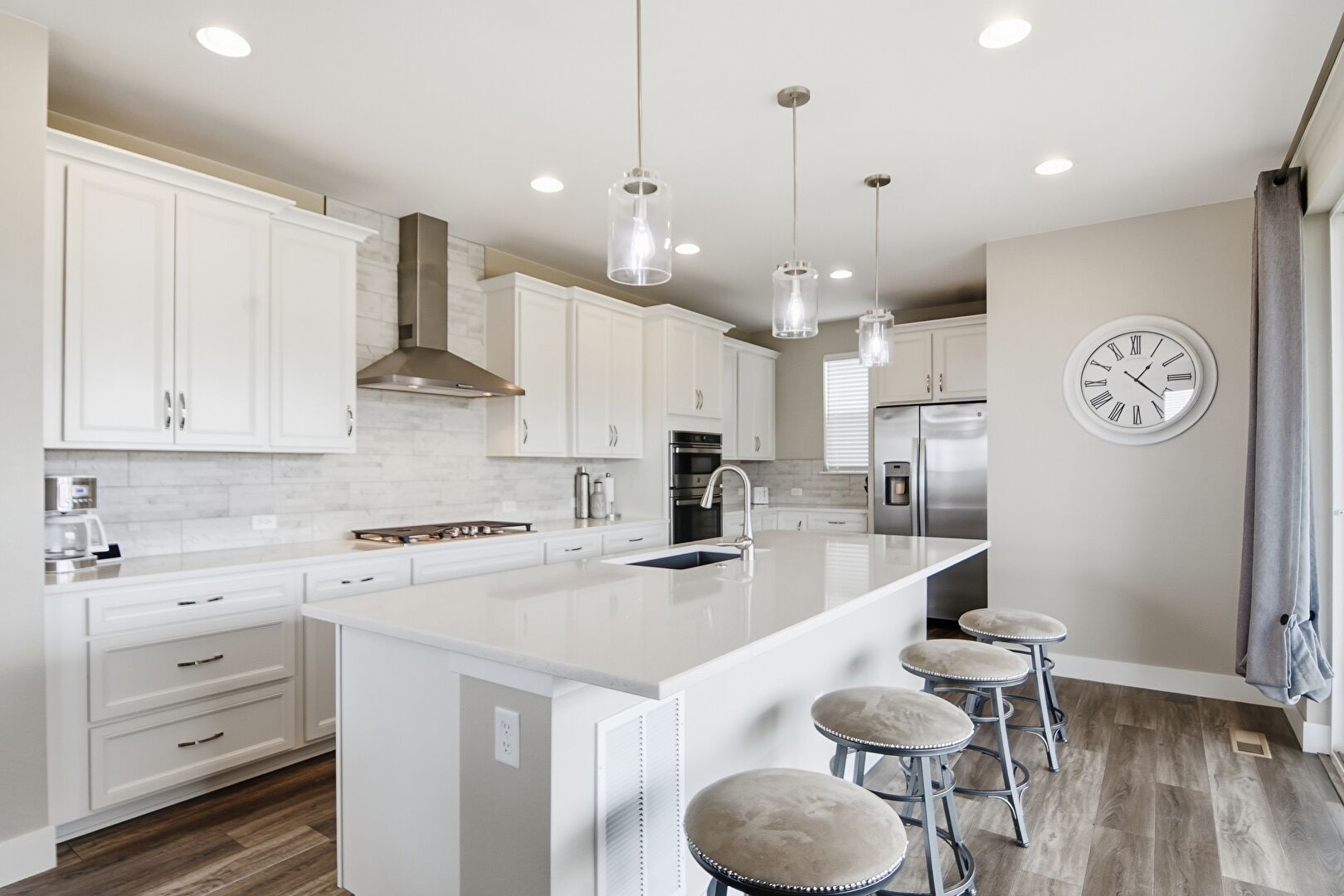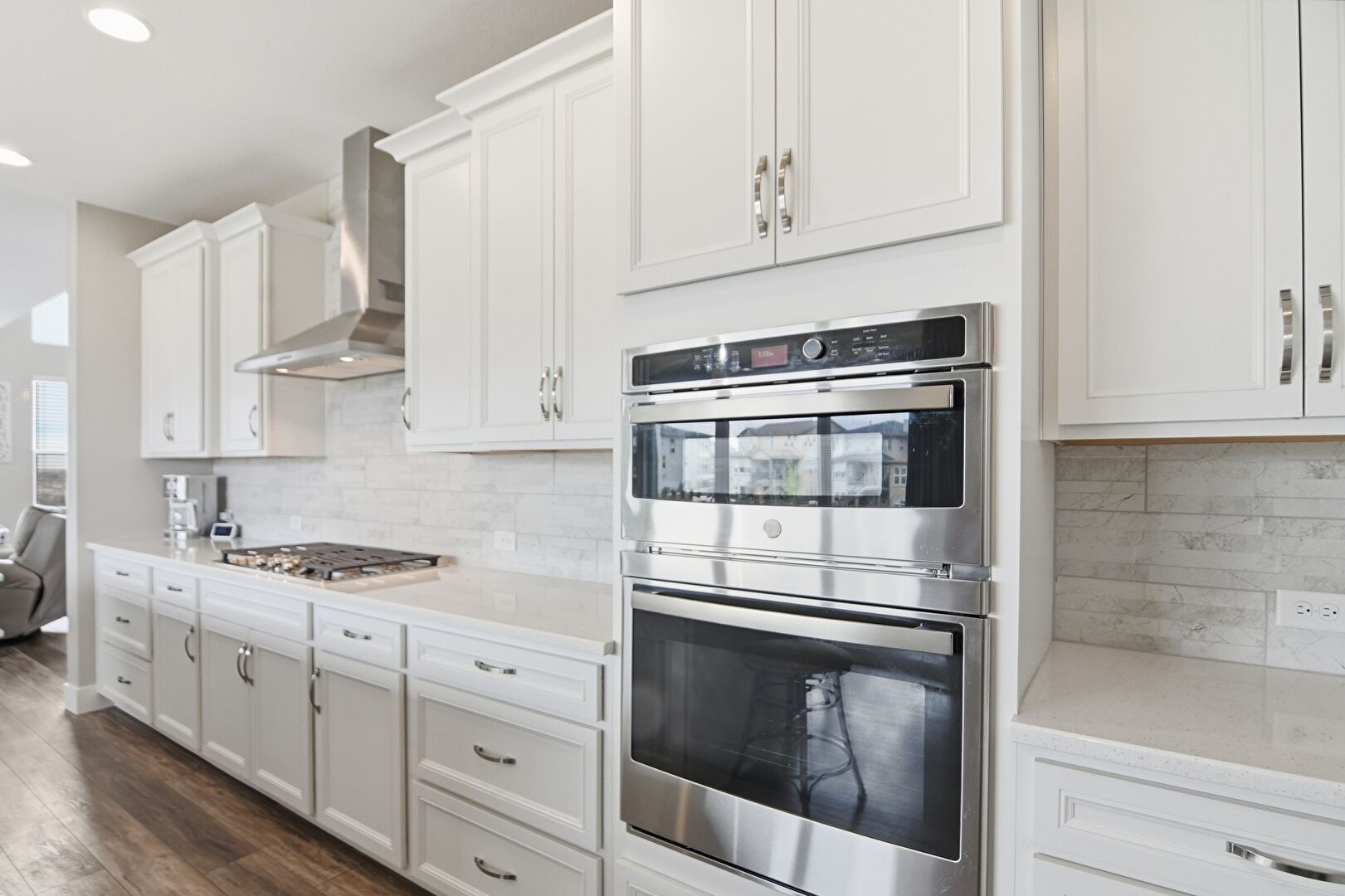 Baseboards Wall, Crown Molding Cabinets, Double Oven, Drywall, Kitchen Bar, Kitchen Island, Natural Light, Opens To Living Area, Pendant Lighting, Recessed Lighting, Shaker Cabinets, Stone Countertops, Vent, Wood Finish Floor, Drywall, L Shaped Kitchen, Natural Light, Pendant Lighting, Vent