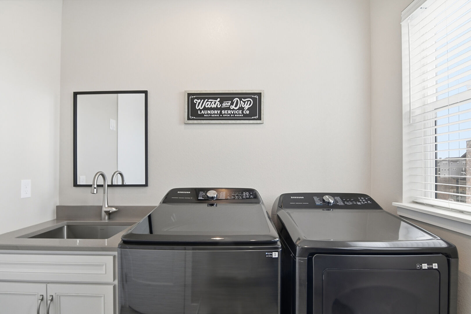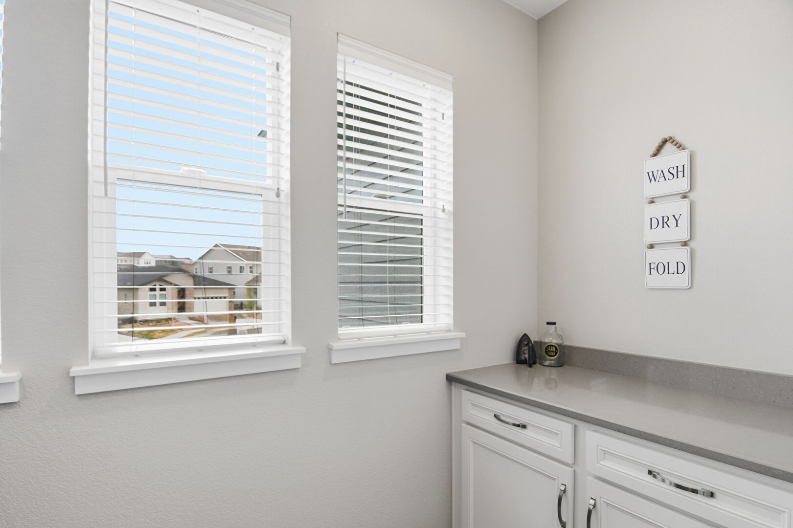 Drywall, Laundry, Shaker Cabinets, Stone Countertops, Natural Light