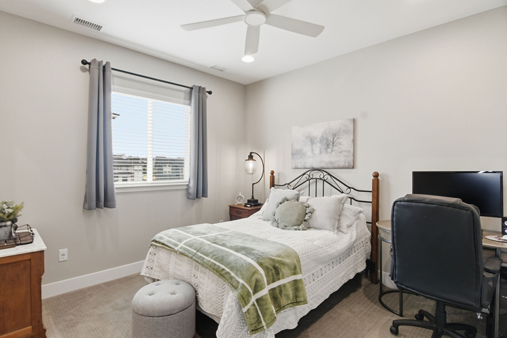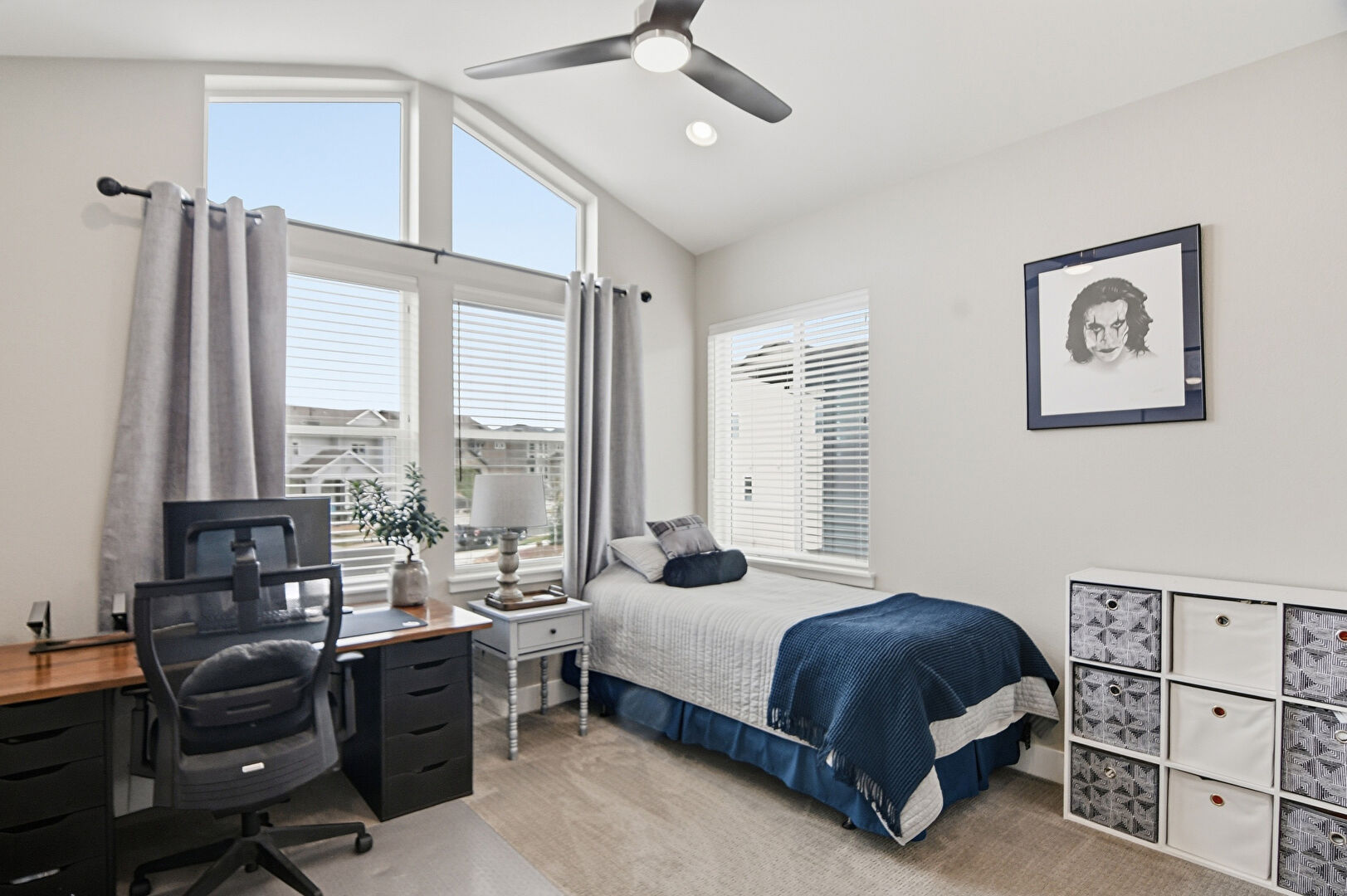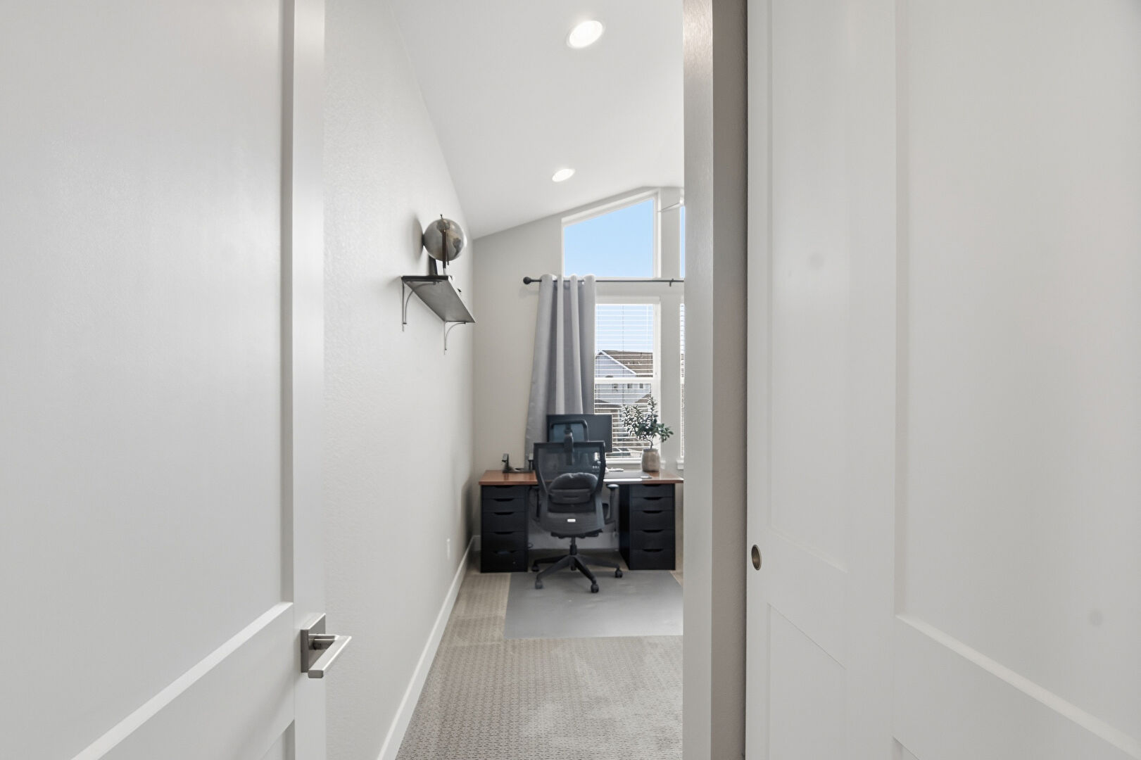 Baseboards Wall, Carpet, Cathedral Ceiling, Ceiling Fan, Drywall, Natural Light, Office Area, Recessed Lighting, Vaulted Ceiling, Vent, Baseboards Wall, Carpet, Drywall, Vaulted Ceiling, Vent