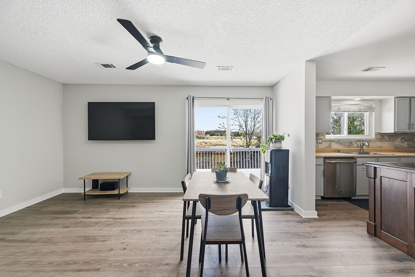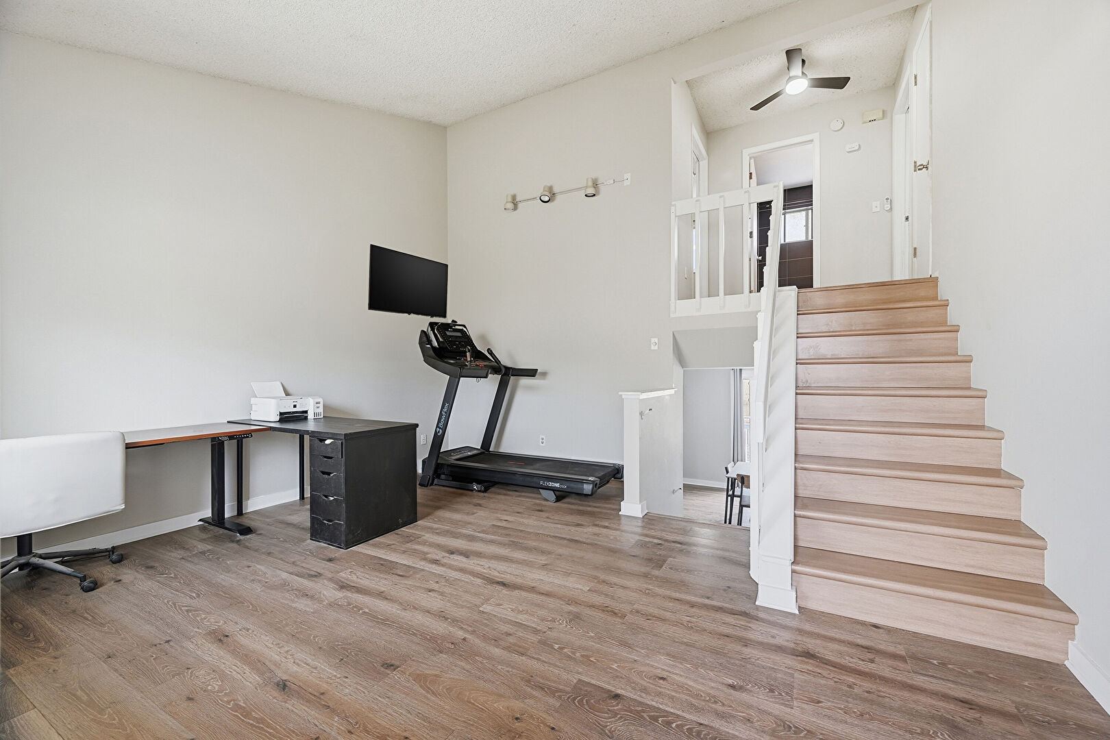 Baseboards Wall, Ceiling Fan, Drywall, Natural Light, Stairs, Textured Ceiling, Vent, Wood Finish Floor, Baseboards Wall, Ceiling Fan