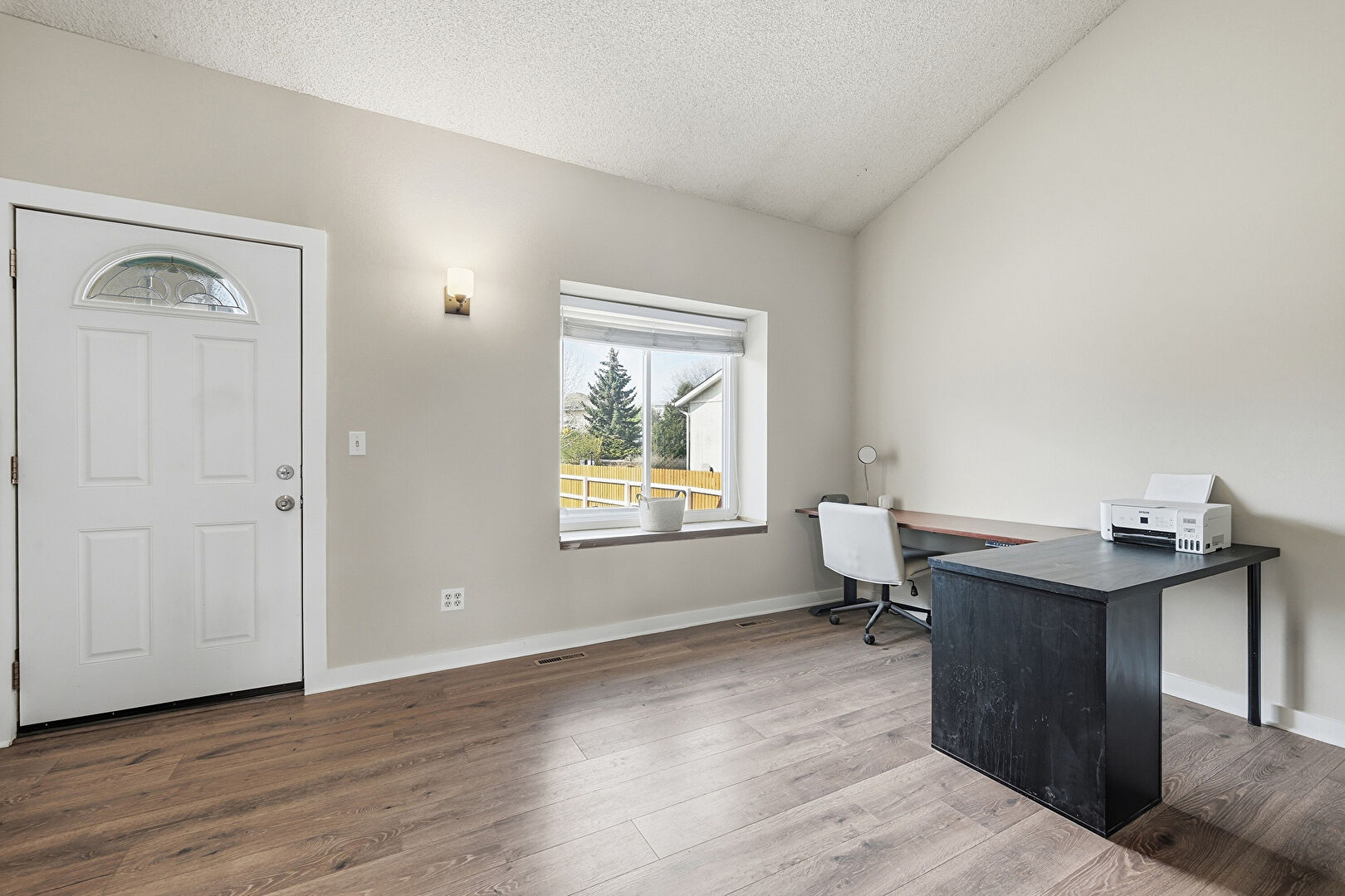Baseboards Wall, Ceiling Fan, Drywall, High Ceiling, Natural Light, Office Area, Textured Ceiling, Vaulted Ceiling, Vent, Wood Finish Floor, Baseboards Wall, Drywall