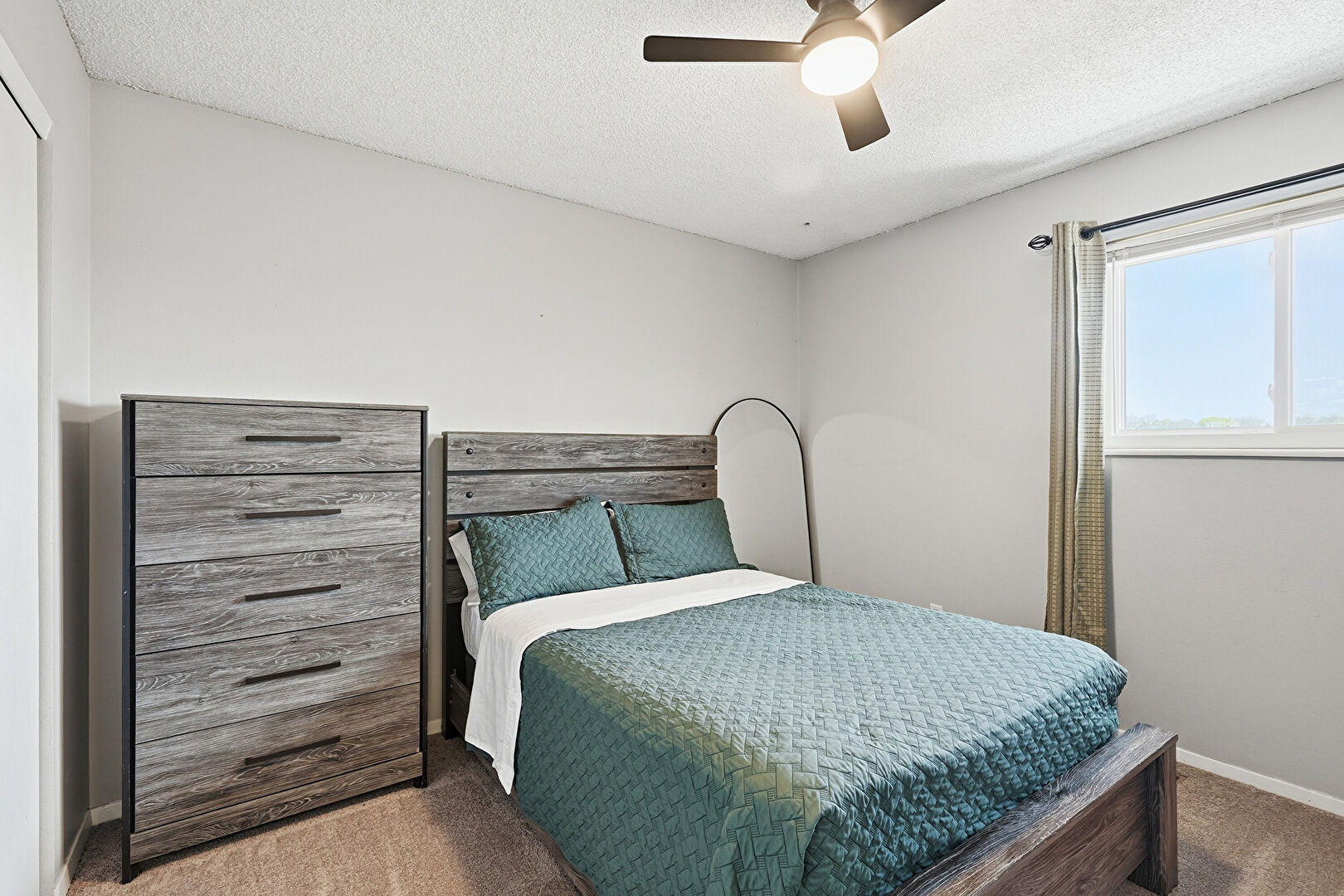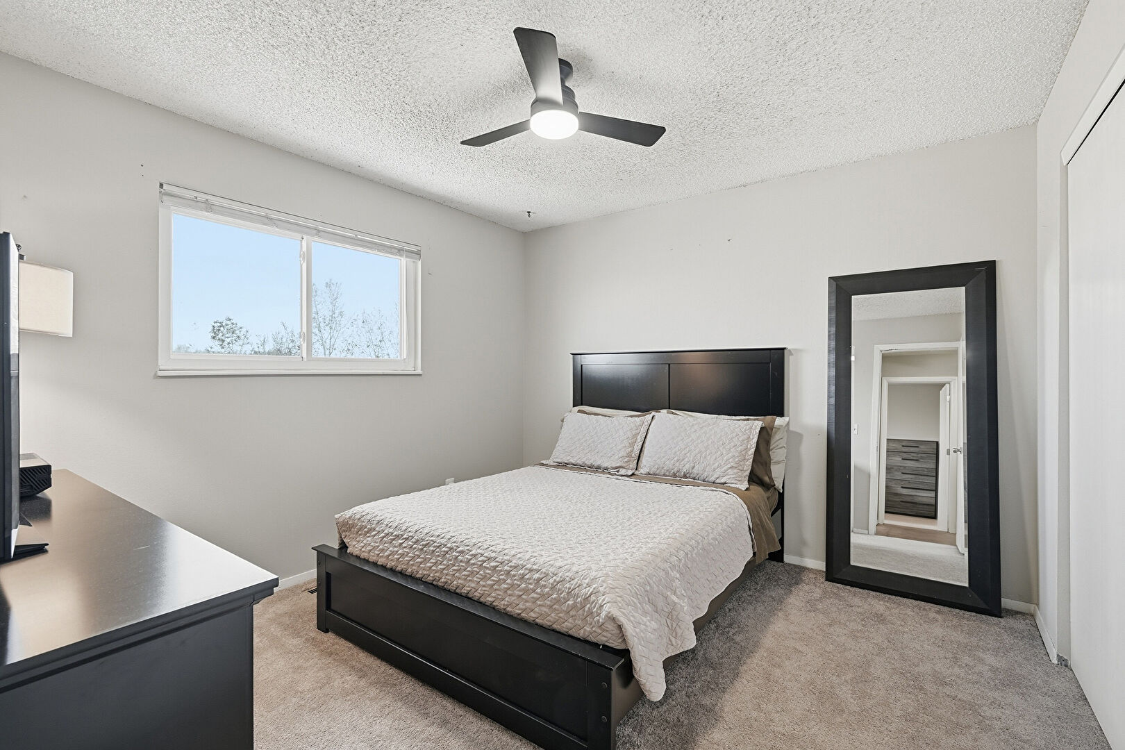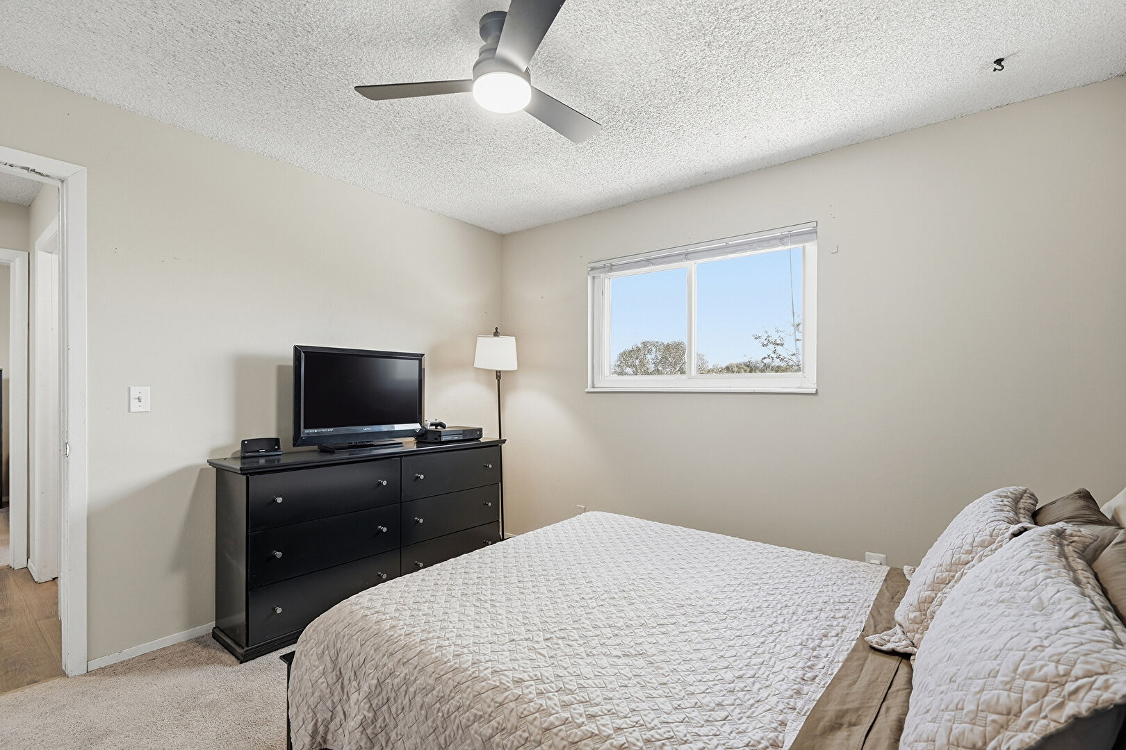 Carpet, Ceiling Fan, Drywall, Natural Light, Textured Ceiling, Baseboards Wall