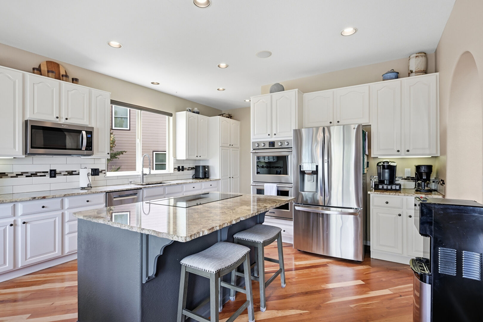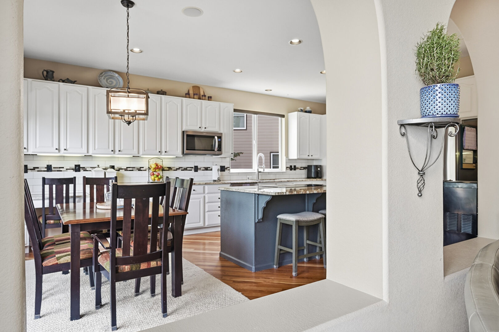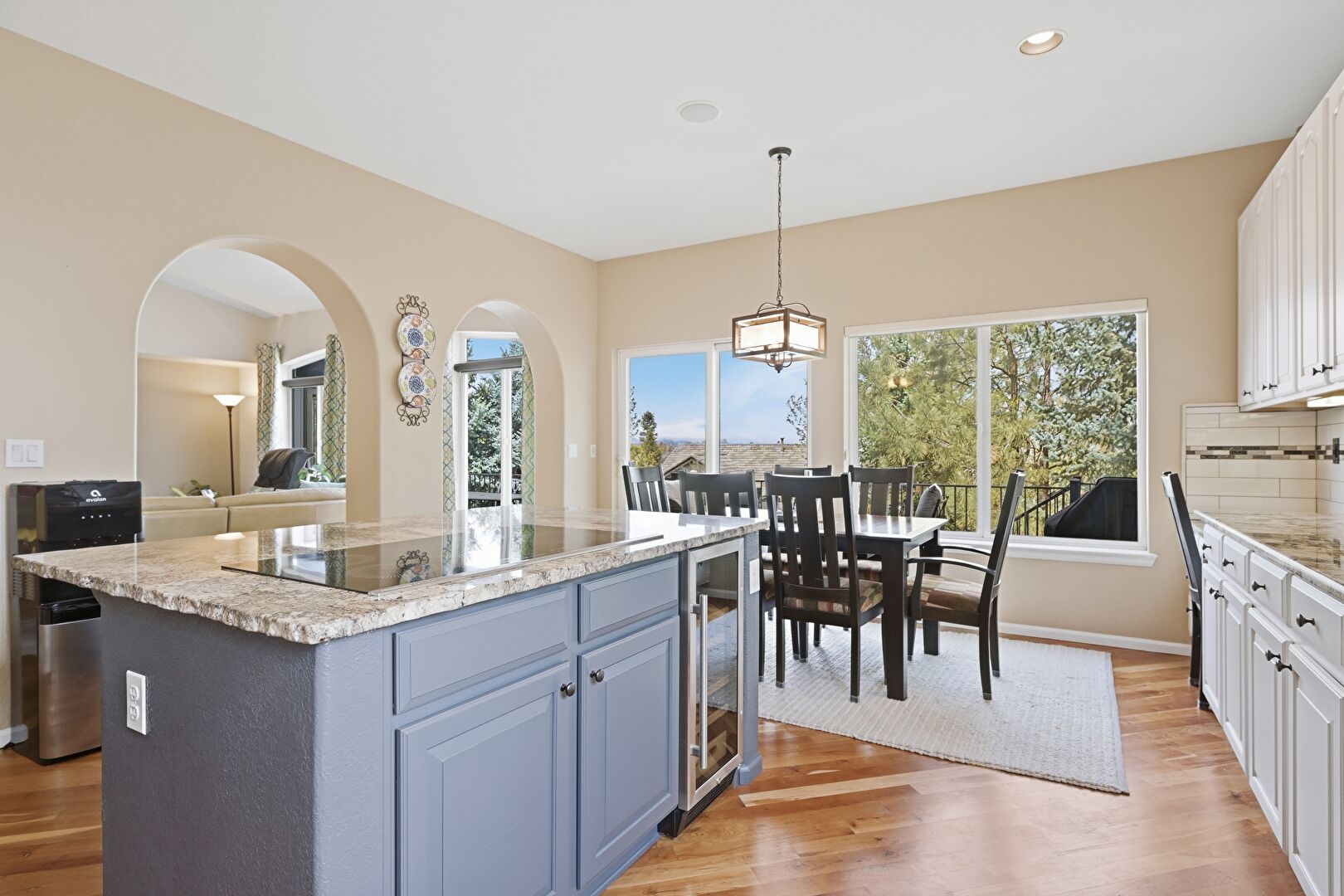Arched Cabinets, Arched Walkways, Baseboards Wall, Blue Cabinets, Double Oven, Drywall, Gray Cabinets, Kitchen Bar, Kitchen Island, L Shaped Kitchen, Natural Light, Opens To Living Area, Pendant Lighting, Raised Cabinets, Recessed Lighting, Stone Countertops, Wine Cooler, Wood Finish Floor, Arched Cabinets, Natural Light, Stone Countertops, Wood Finish Floor