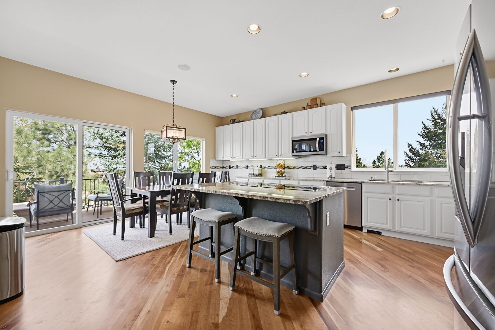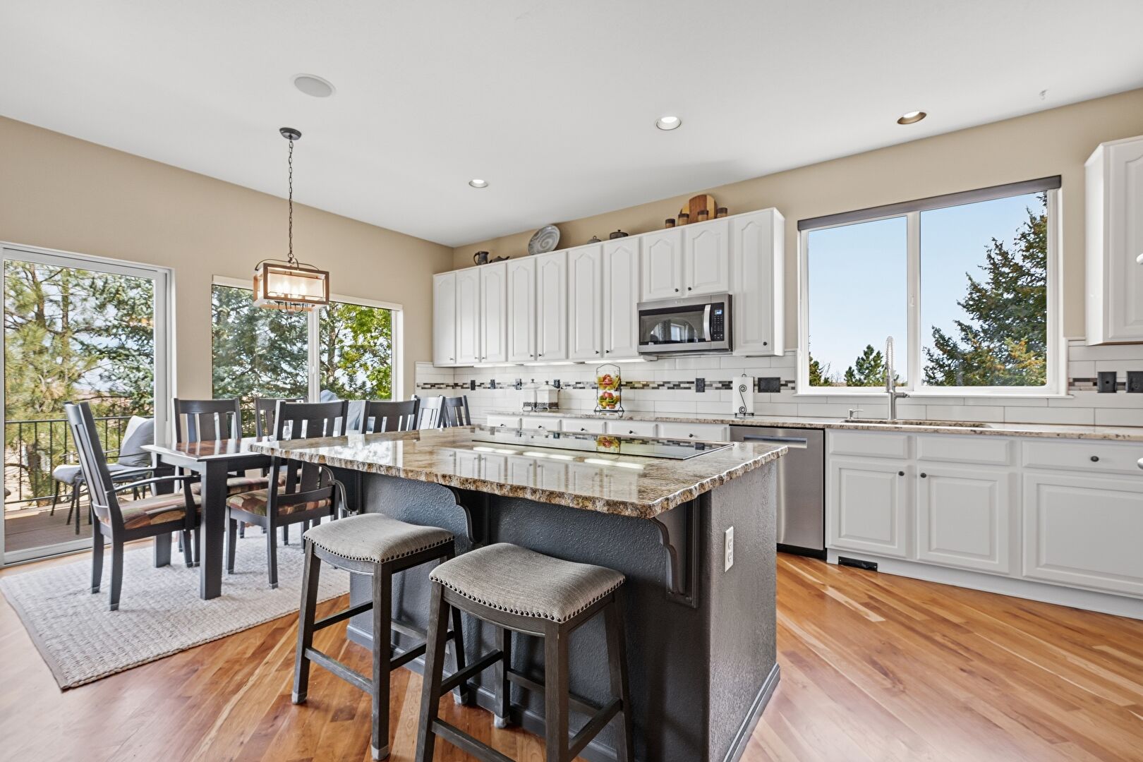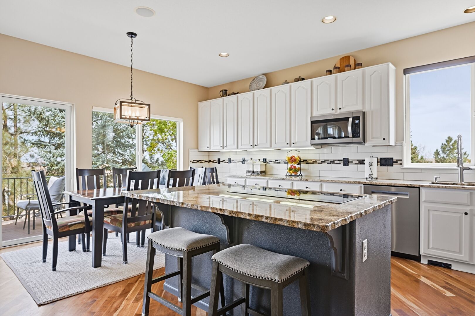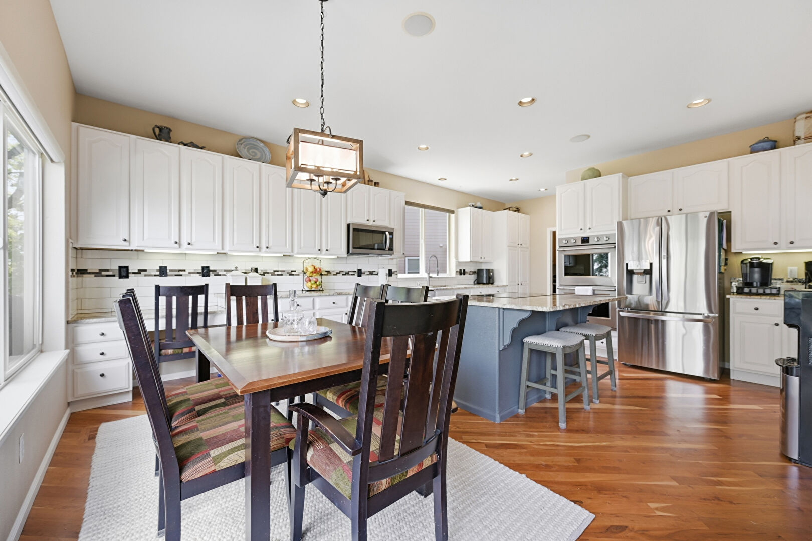 Arched Cabinets, Arched Walkways, Baseboards Wall, Blue Cabinets, Double Oven, Drywall, Gray Cabinets, Kitchen Bar, Kitchen Island, L Shaped Kitchen, Natural Light, Opens To Living Area, Pendant Lighting, Raised Cabinets, Recessed Lighting, Stone Countertops, Wine Cooler, Wood Finish Floor, Arched Cabinets, Natural Light, Stone Countertops, Wood Finish Floor