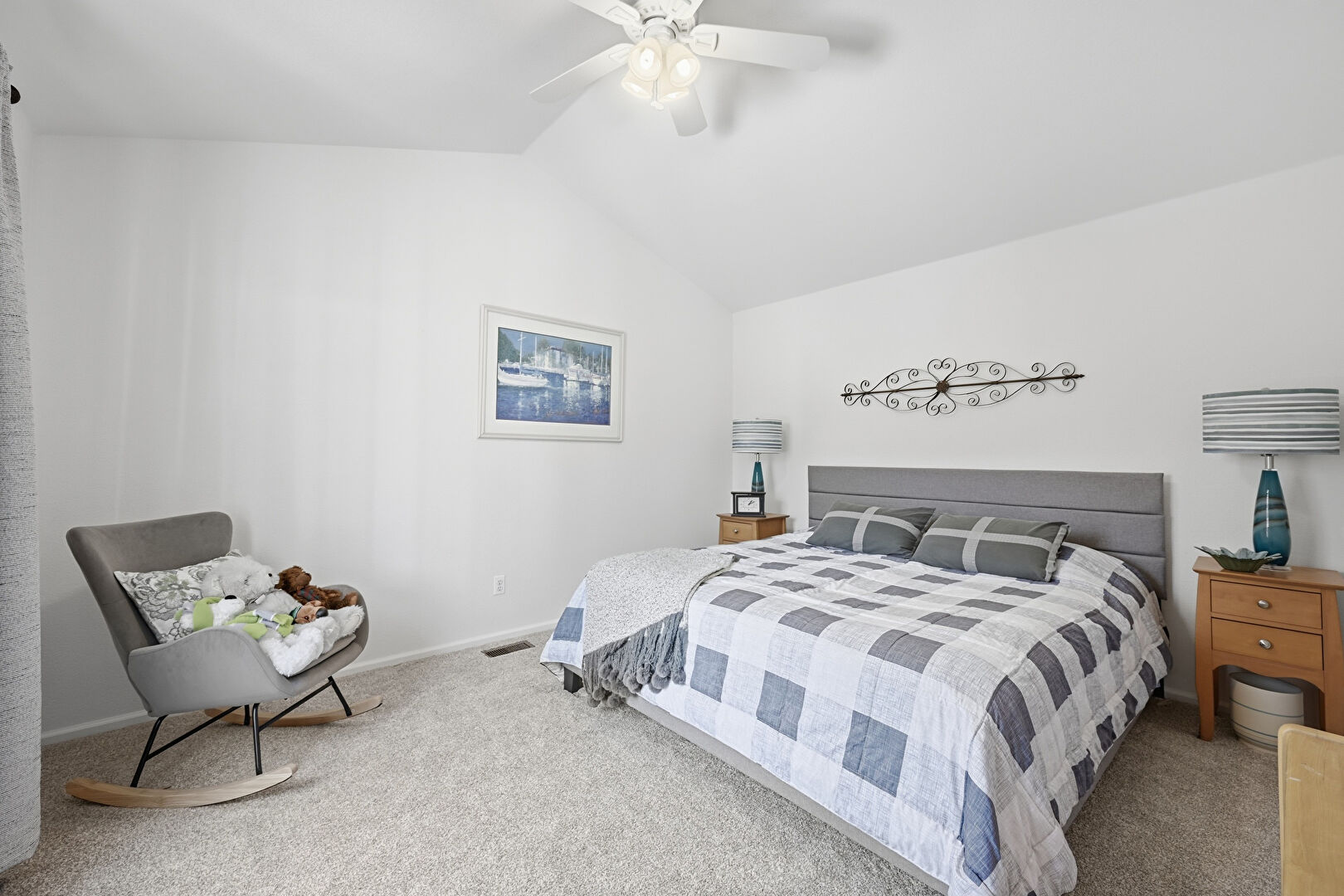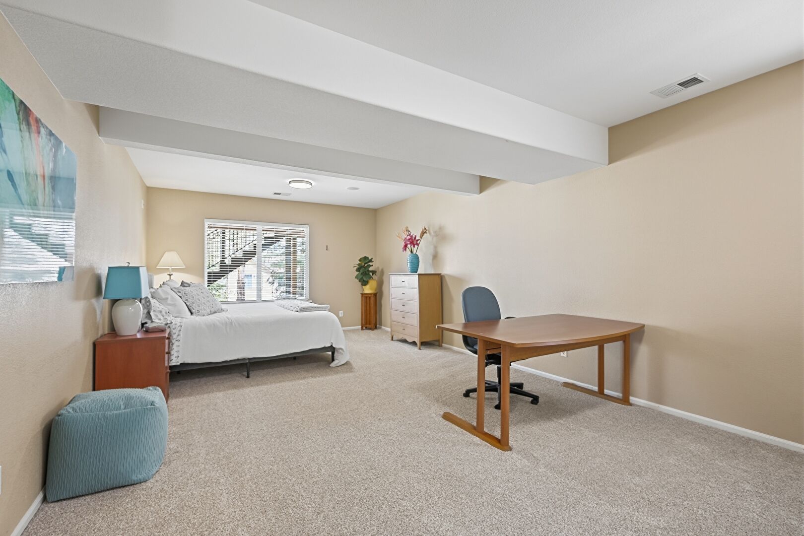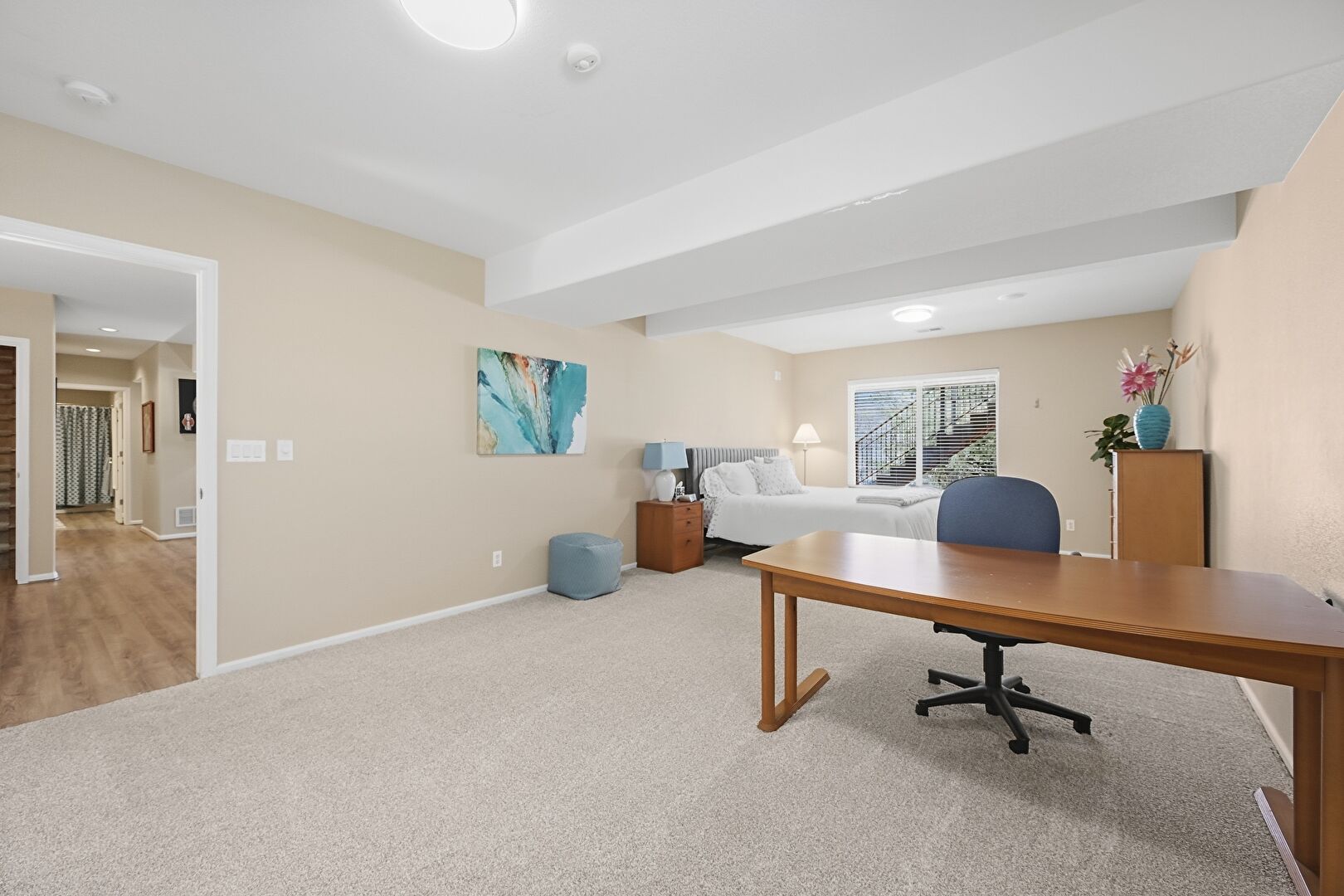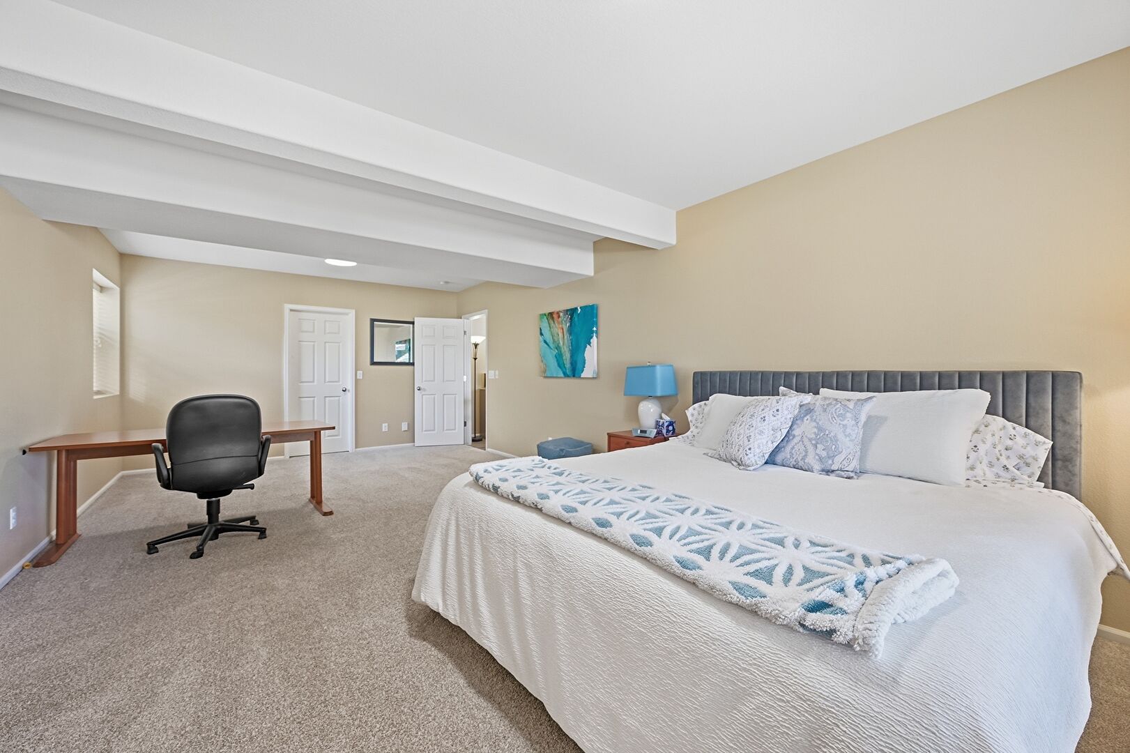 Baseboards Wall, Beamed Ceiling, Carpet, Cathedral Ceiling, Ceiling Fan, Drywall, Natural Light, Office Area, Vaulted Ceiling, Vent, Carpet, Drywall, Office Area