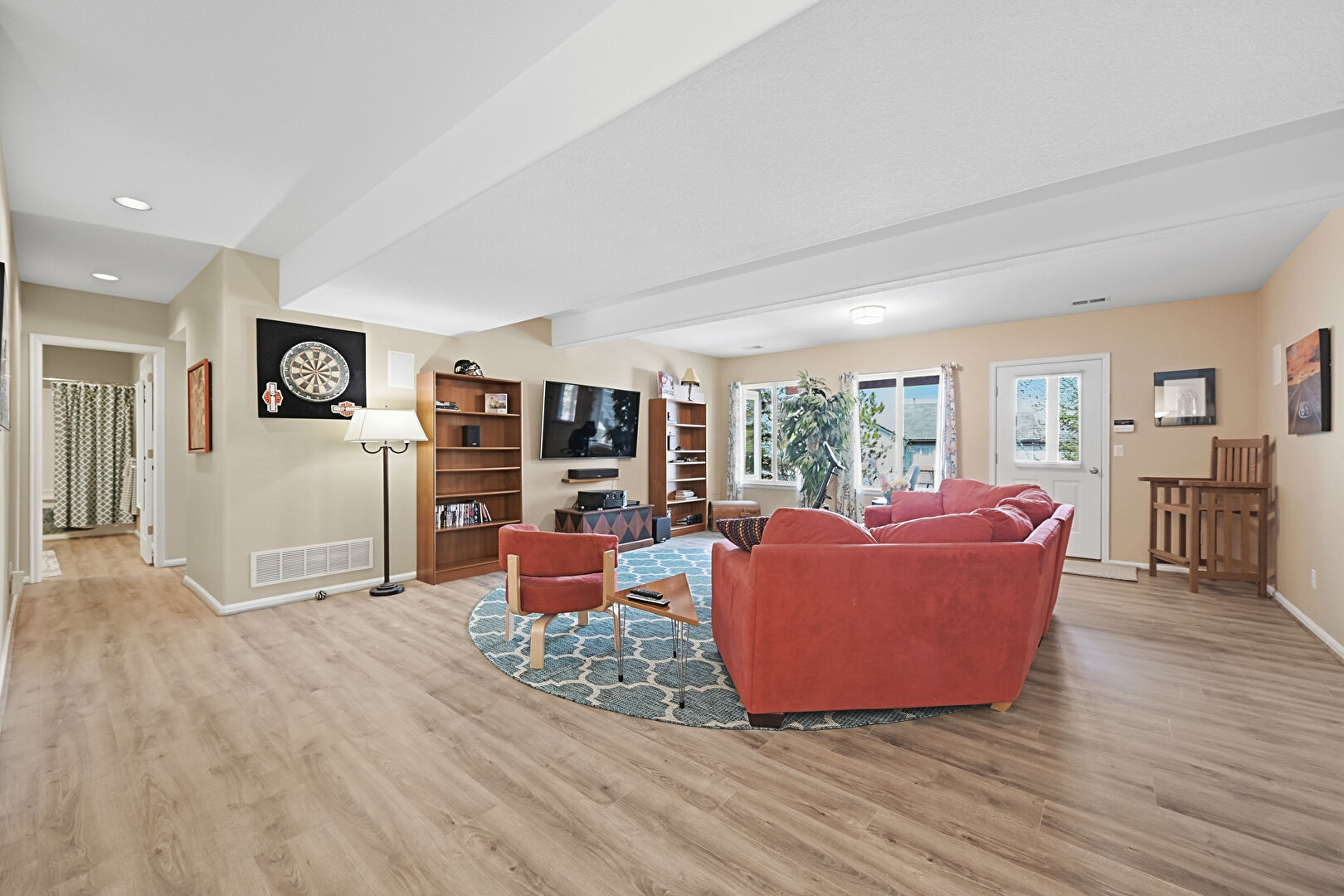 Baseboards Wall, Beamed Ceiling, Drywall, Natural Light, Recessed Lighting, Vent, Wood Finish Floor, Drywall, Wood Finish Floor