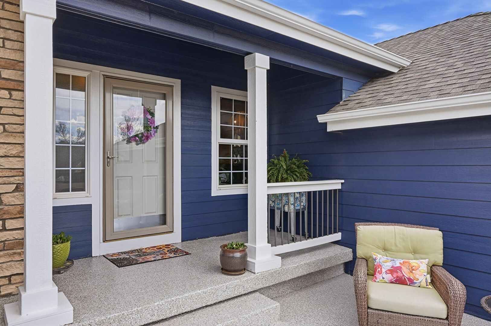 Horizontal Siding, Porch, Shingle Roof, Stone Siding, Gutters