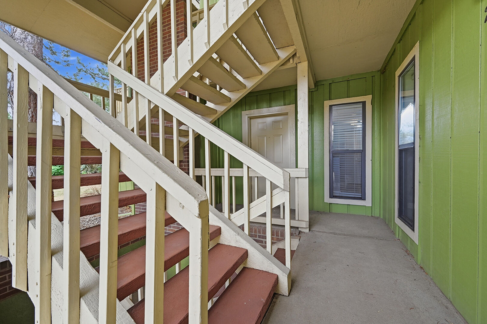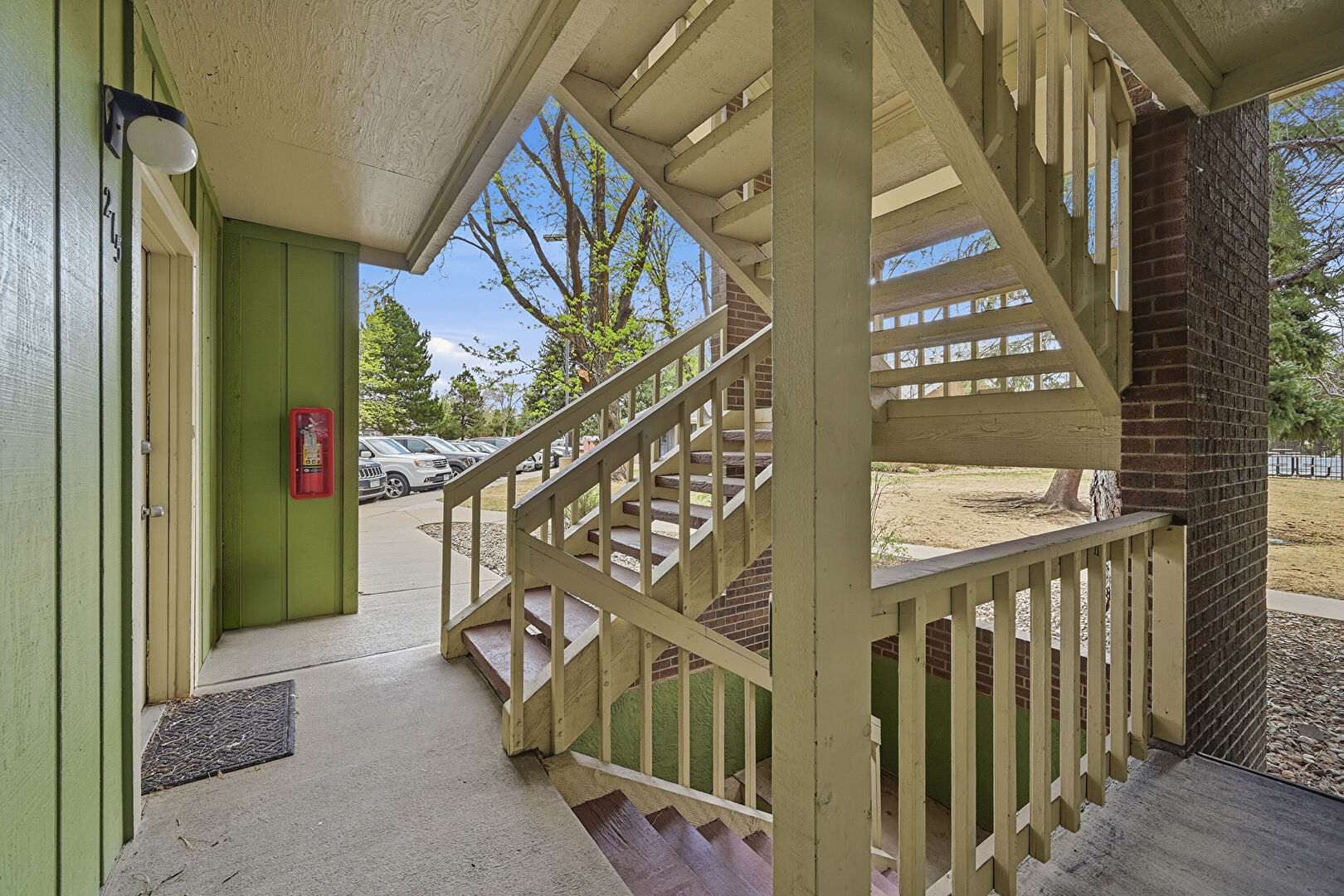 Board Batten Siding, Brick Siding, Patio, Stairs, Vertical Siding, Deck, Fire Extinguisher, Pergola
