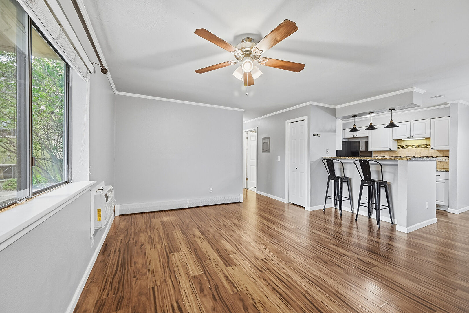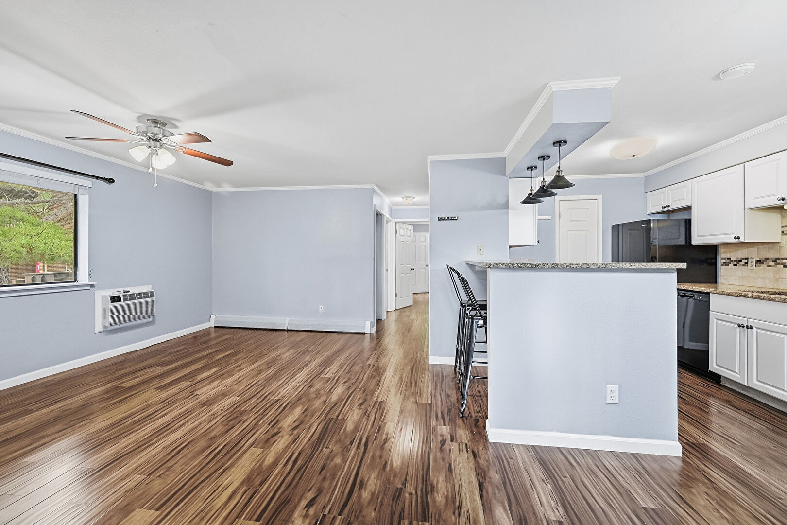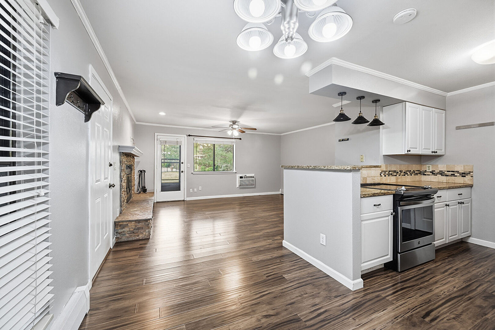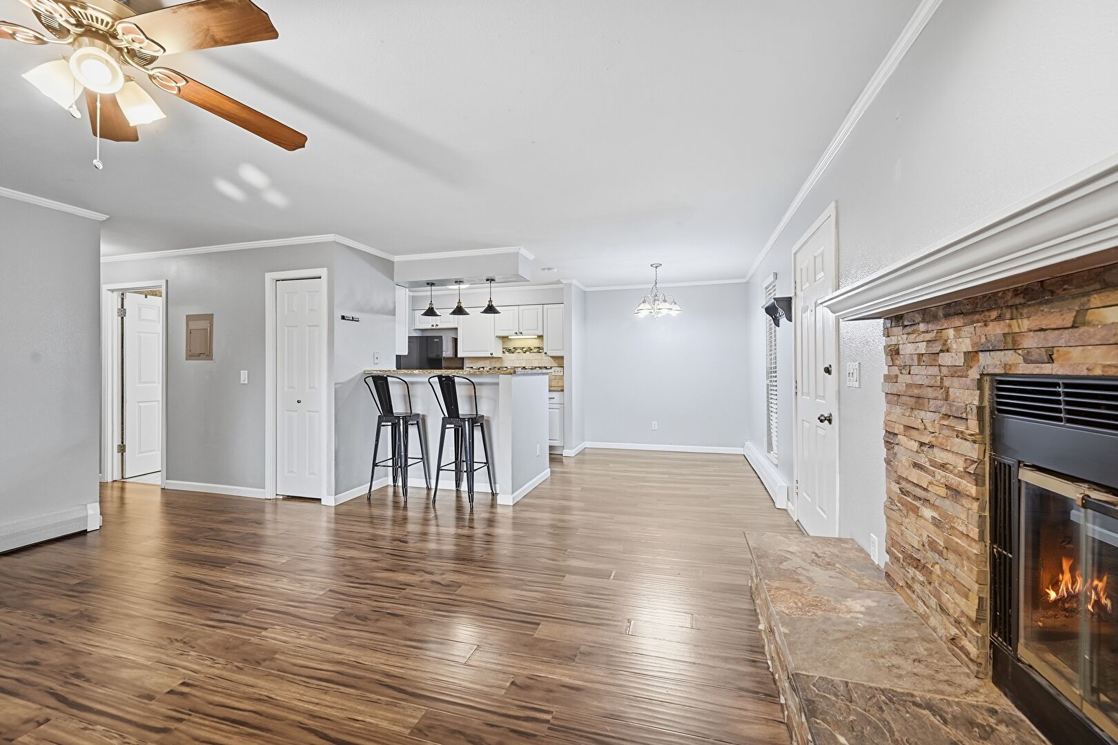 Baseboard Radiator, Baseboards Wall, Ceiling Fan, Crown Molding, Drywall, Fireplace, Kitchen Bar, Kitchen Peninsula, Natural Light, Notable Chandelier, Opens To Living Area, Pendant Lighting, Raised Cabinets, Stone Countertops, U Shaped Kitchen, Wall Mounted Ac, Wood Finish Floor, Crown Molding, Fireplace, Natural Light, Recessed Lighting