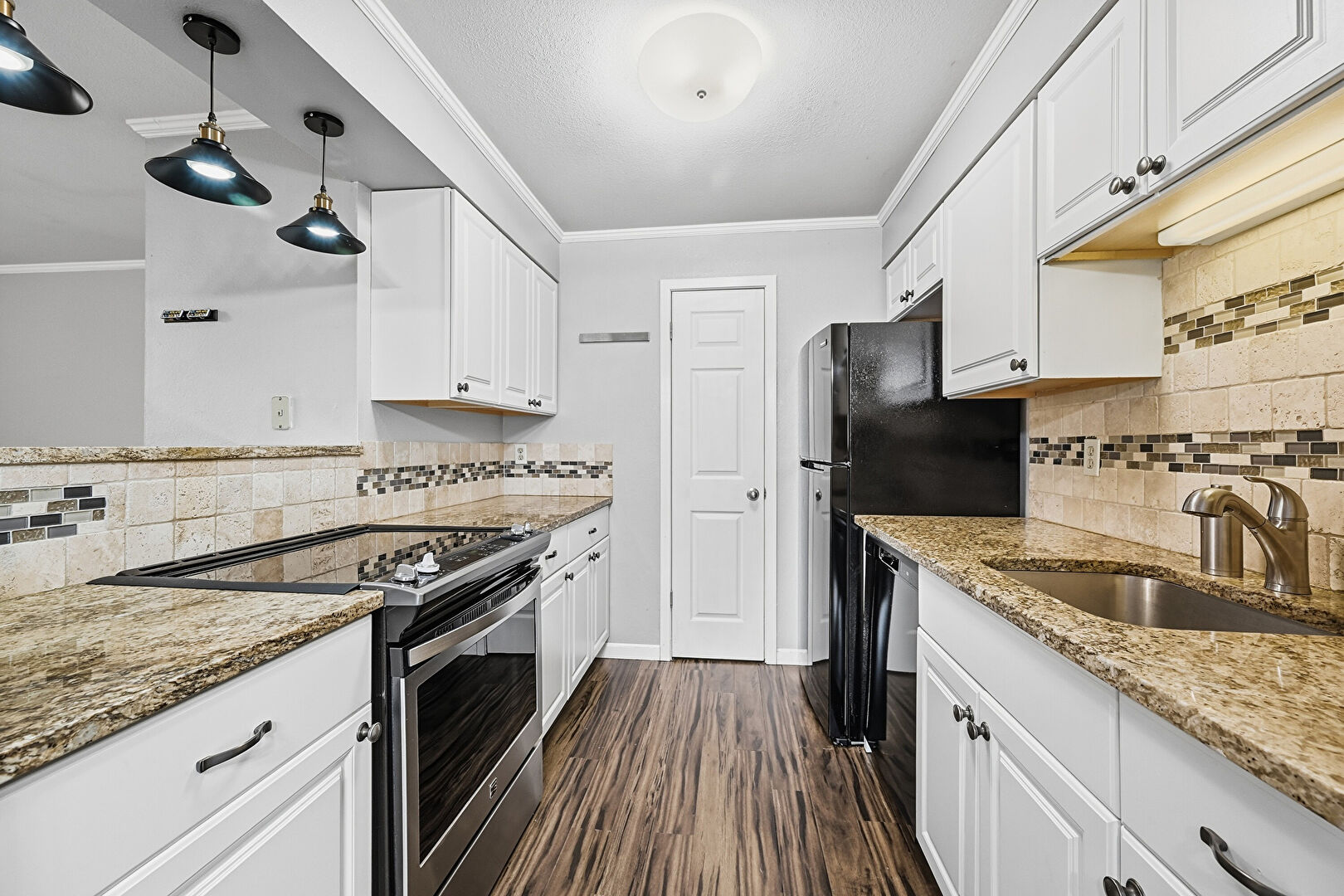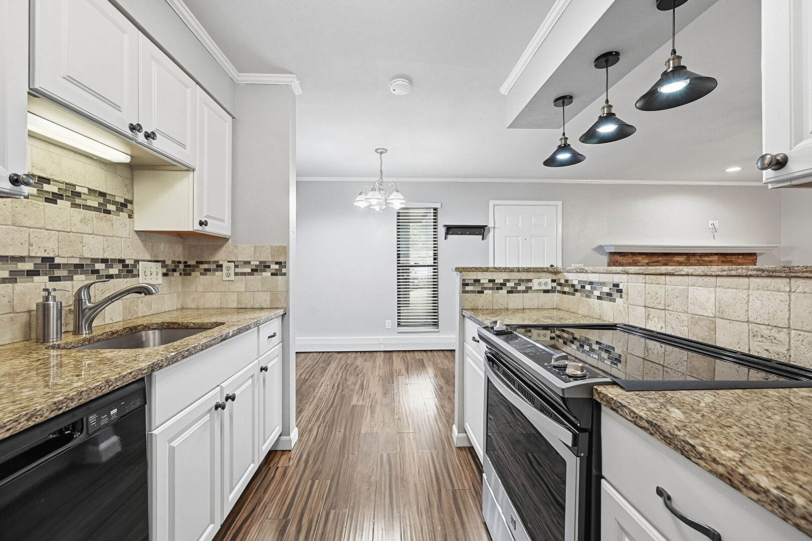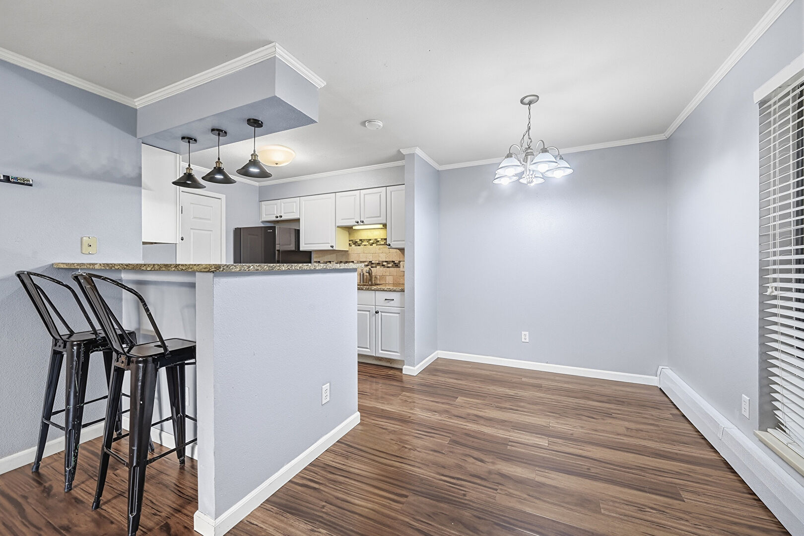 Baseboards Wall, Crown Molding, Drywall, Notable Chandelier, Pendant Lighting, Raised Cabinets, Stone Countertops, Textured Ceiling, Wood Finish Floor, Baseboards Wall, Wood Finish Floor