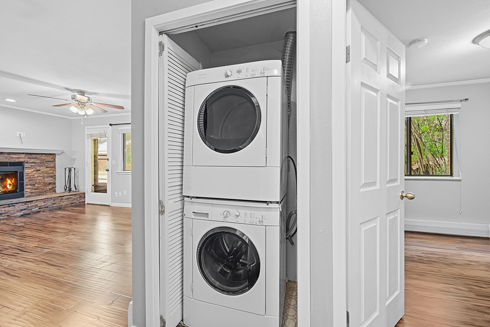Baseboards Wall, Ceiling Fan, Crown Molding, Drywall, Fireplace, Natural Light, Smoke Carbon Monoxide Detector, Wood Finish Floor, Laundry