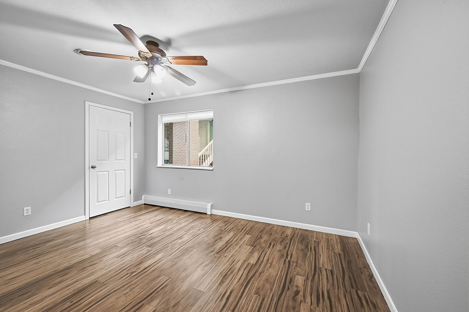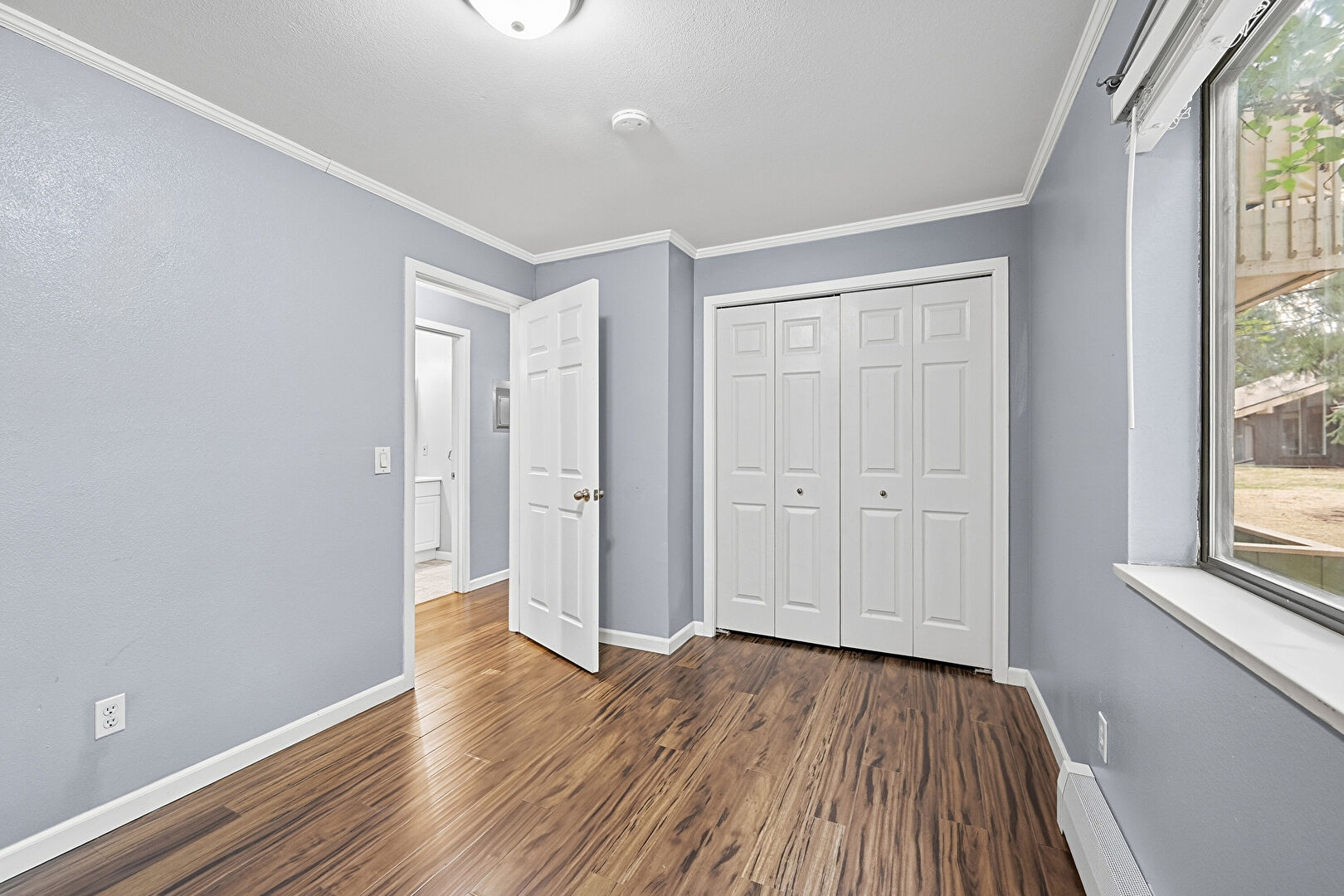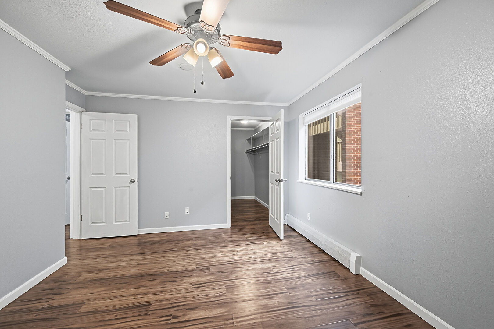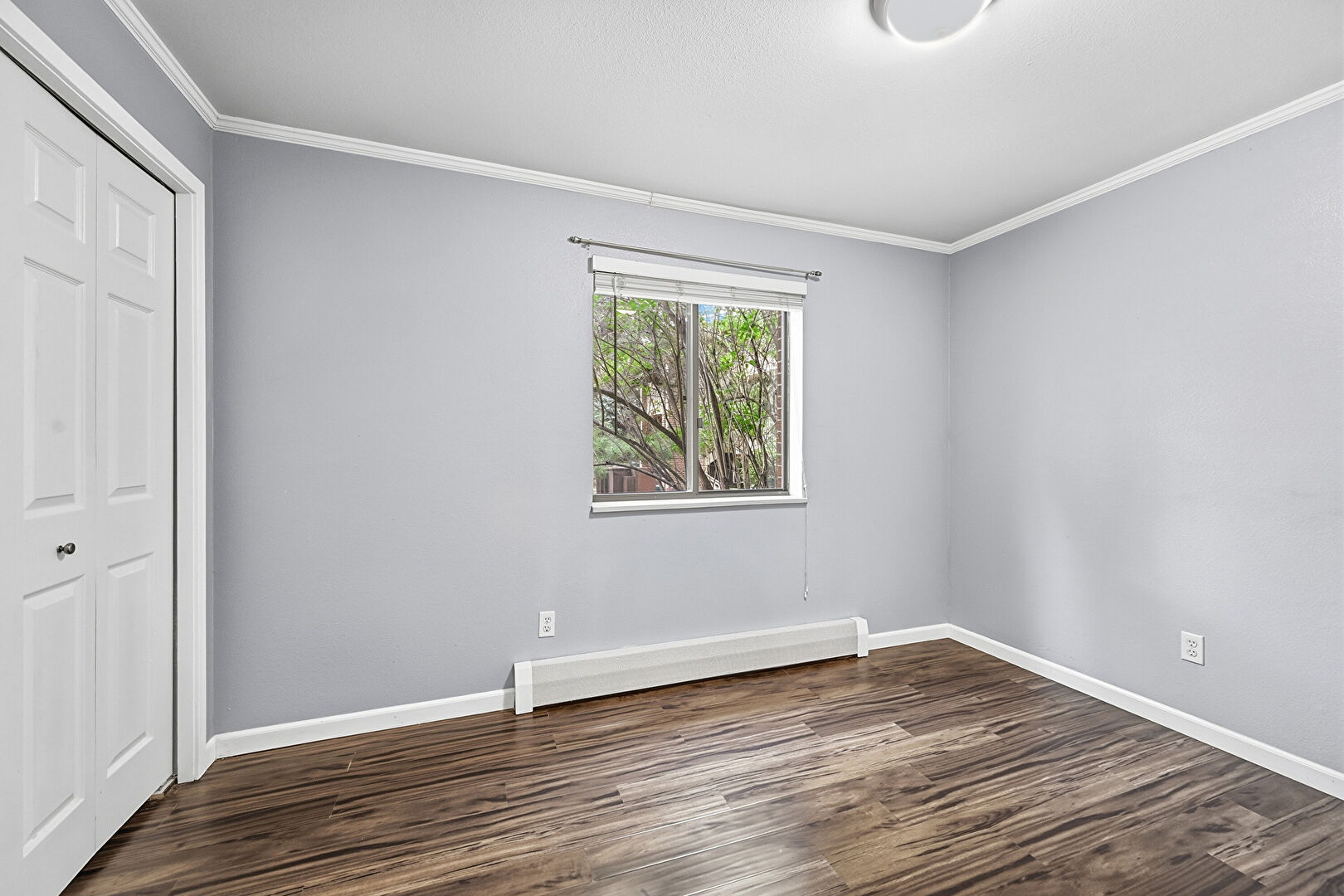 Baseboard Radiator, Baseboards Wall, Closet, Crown Molding, Natural Light, Wood Finish Floor, Drywall, Wood Finish Floor