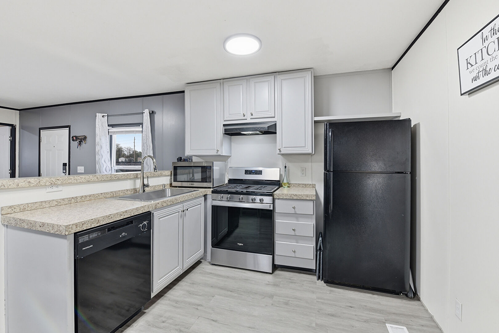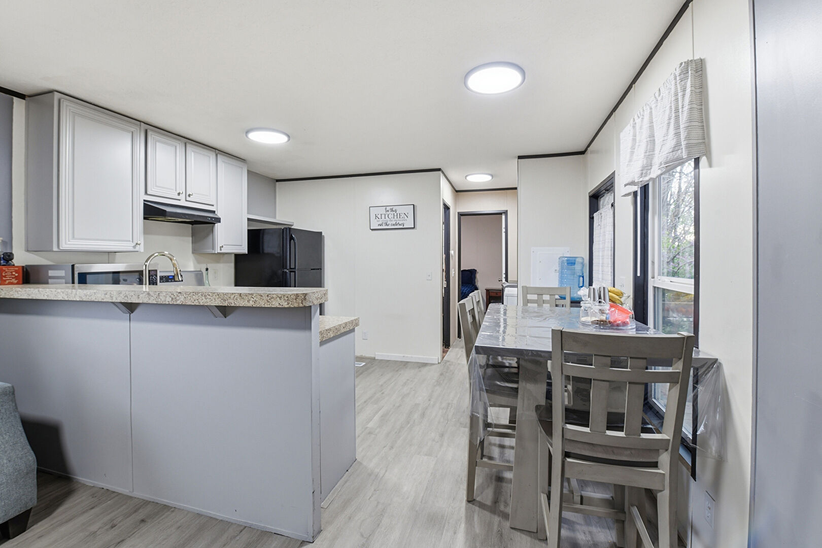 Baseboards Wall, Drywall, Kitchen Bar, Kitchen Peninsula, L Shaped Kitchen, Natural Light, Raised Cabinets, Stone Countertops, U Shaped Kitchen, Wood Finish Floor, Drywall, Gray Cabinets